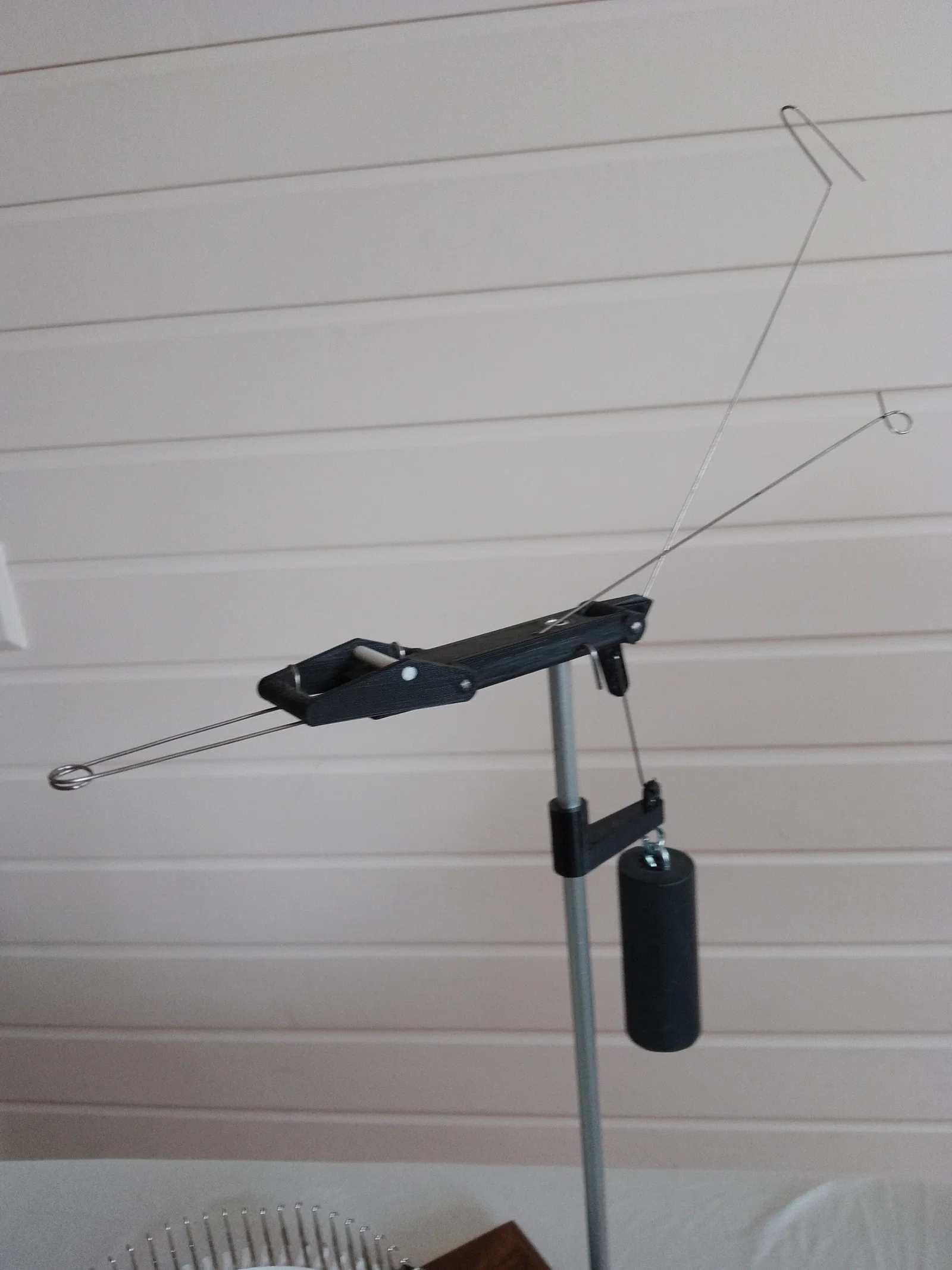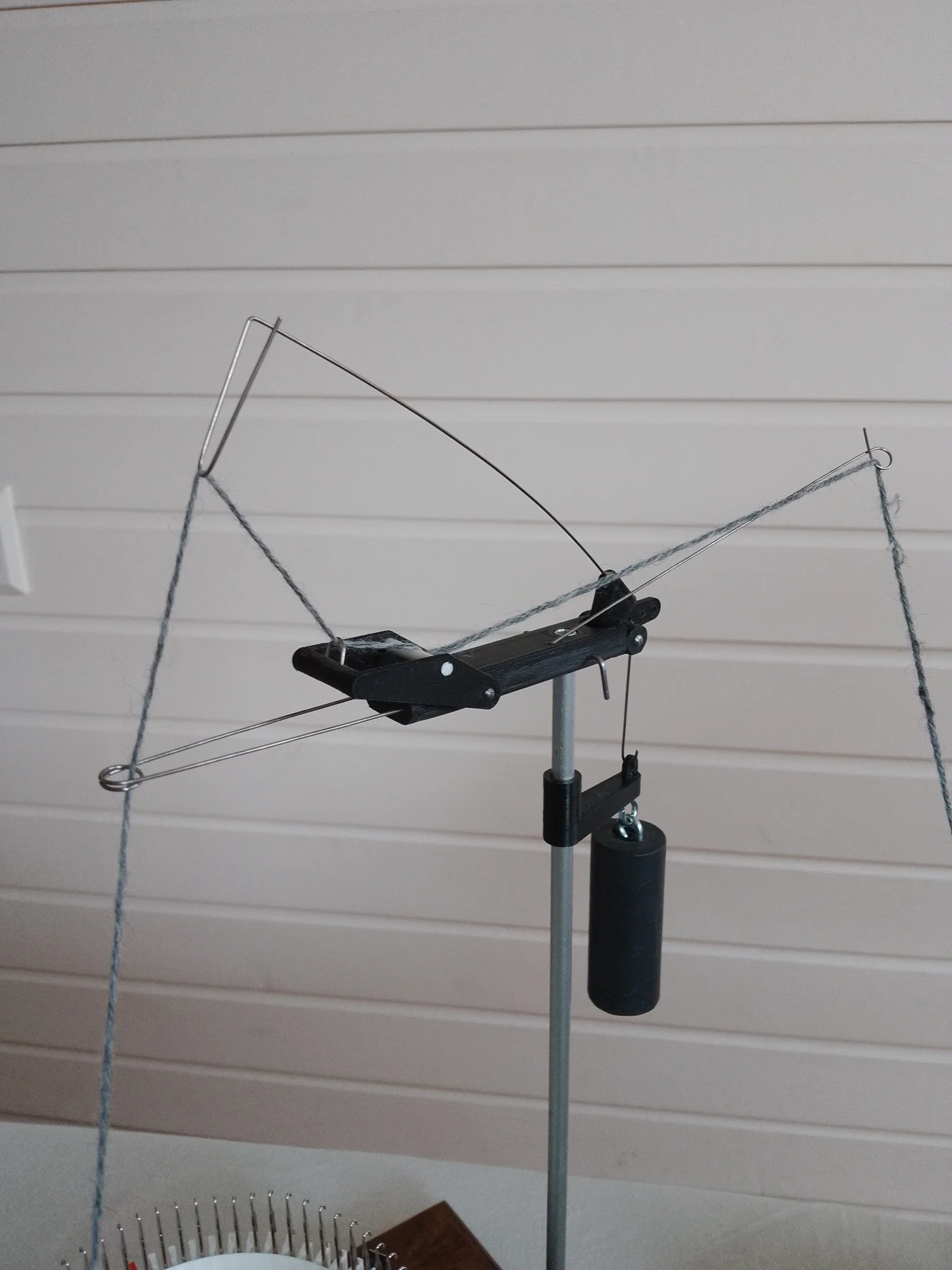 Máy được dẫn động bằng các puly đặt cạnh nhau với dây đai răng 2GT để giảm ma sát. Máy cũng chạy trên ba vòng bi, sử dụng bi thép 4,5mm làm bi. Có 2 cam đẩy lên, để kim ở vị trí bình thường. Chúng có thể được đẩy xuống để bảo trì; ví dụ: để nhặt các mũi bị rơi. Điều này loại bỏ việc phải sử dụng "cần gạt" cơ học để đẩy kim lên. (Thông thường kim được đẩy lên (để làm sạch lẫy kim) ngay trước khi tạo mũi. Ở đây kim cũng được đẩy lên ngay sau khi tạo mũi. Điều này không tạo ra sự khác biệt cho việc đan, nó chỉ trông khác). Tất cả các cam đều có rãnh để dán dây kim loại mềm (1mm) làm bề mặt ổ trục cho kim. Tôi sử dụng dây thép mạ kẽm ủ thông thường. Điều này loại bỏ tiếp xúc giữa thép và nhựa, giúp giảm ma sát và mài mòn. Điều này cũng loại bỏ sự cần thiết phải đánh bóng cam (xem hình). Máy sử dụng kim KR830-KR850 đã cắt. Đây là những cái rẻ nhất tôi tìm thấy.