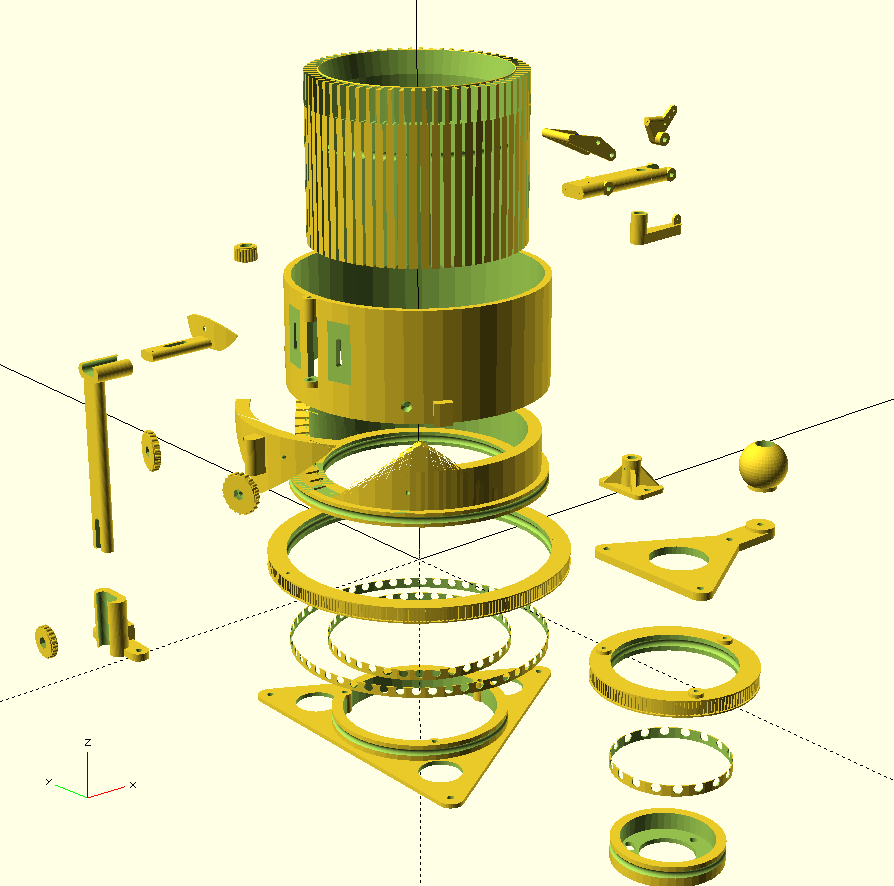 Cũng bao gồm một phiên bản có thể tùy chỉnh trong CSMv4.zip, phiên bản này cũng được tối ưu hóa tốt hơn và do đó nhanh hơn nhiều. Nó có thể tạo ra các phiên bản có đường kính xi lanh từ 60 - 300 mm. Các bộ phận nó tạo ra (xi lanh = 120mm) tương thích phần lớn với phiên bản gốc, nhưng đừng mong đợi điều đó. Các điểm đính kèm được tăng từ 3 lên 6. Điều này chủ yếu dành cho các phiên bản lớn hơn, nhưng có thể được sử dụng làm dự phòng trong trường hợp hư hỏng đối với các máy nhỏ hơn. Xin cảm ơn Konchog và SavageRodent vì tất cả các gợi ý hữu ích. (cập nhật ngày 21-12-23 với một số tùy chọn đế cũng như kích thước và cấu hình dây đai răng.)