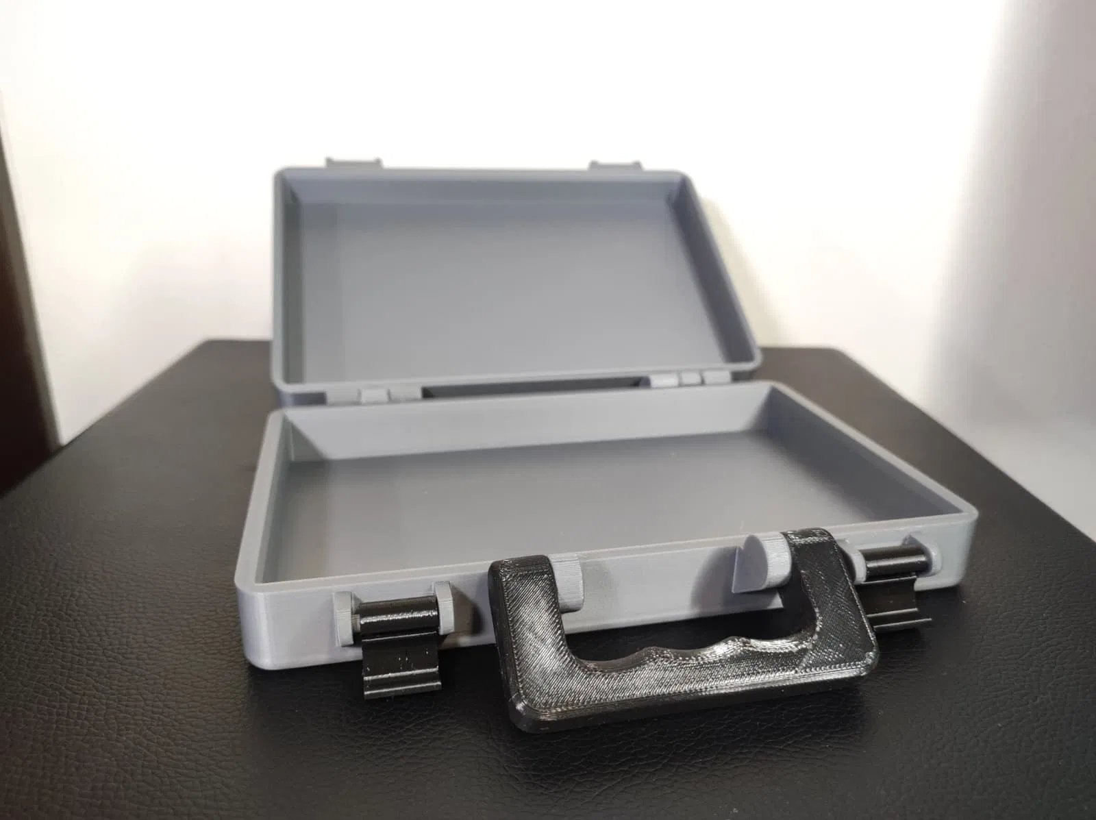 Đây là mô hình cặp xách mini của tui, có thể in ra luôn bản lề hoạt động được và bao gồm các chi tiết thường thấy của cặp xách như chốt khóa và tay cầm. Tui cũng có kèm thêm một cái khay bên trong để bạn có thể tùy chỉnh theo ý thích! Hoặc dùng khay có sẵn để đựng bất cứ thứ gì vừa với thể tích 465 cm^3 của nó.