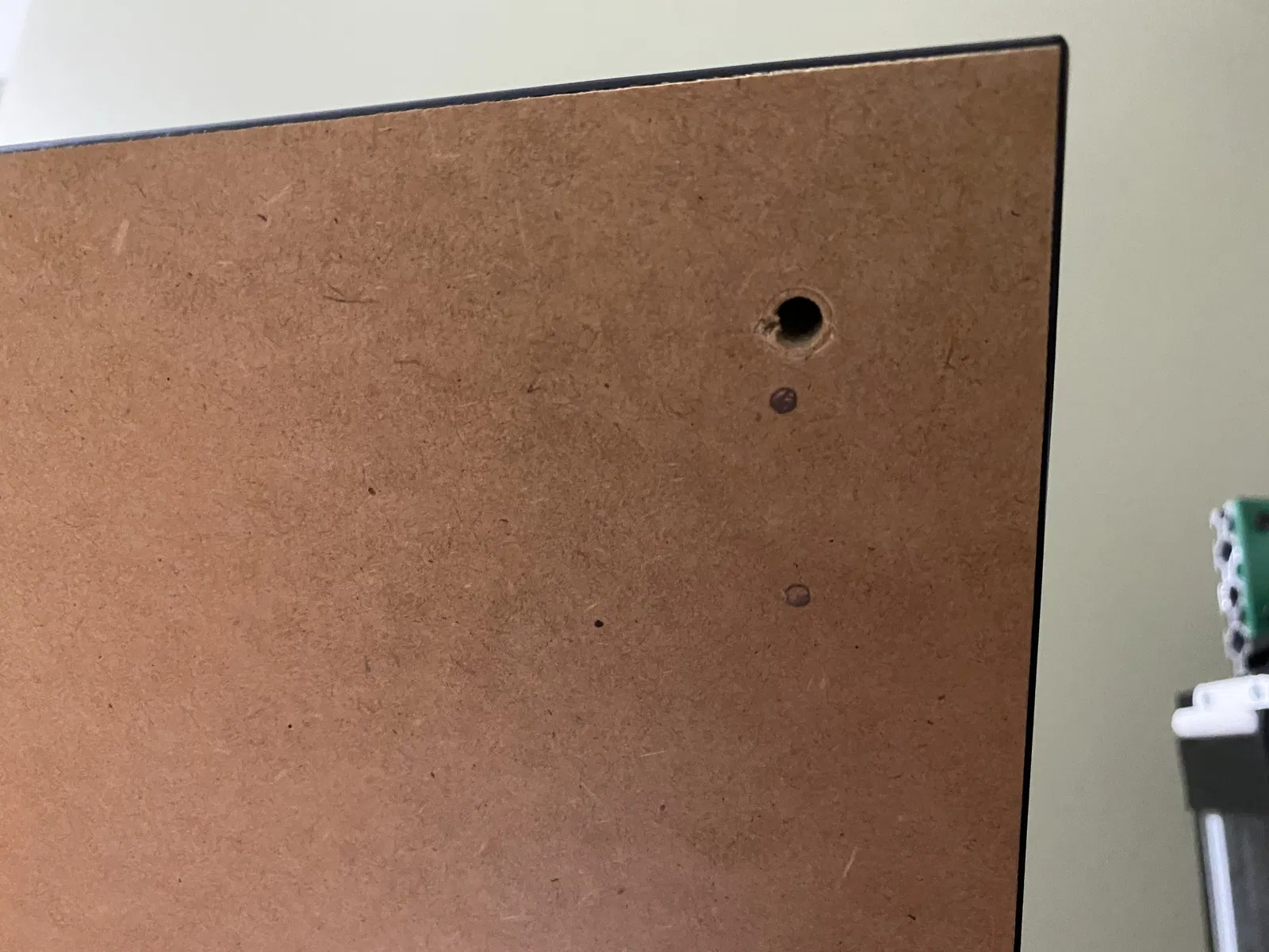 Do cái bàn IKEA Lack mà tui dùng để làm vỏ máy in của tui đã được lắp ráp theo hướng dẫn của IKEA rồi, nên một trong mấy cái lỗ trên bộ phận định tâm nó lại trùng với cái lỗ đã có sẵn do mấy con ốc IKEA hai mặt tạo ra.