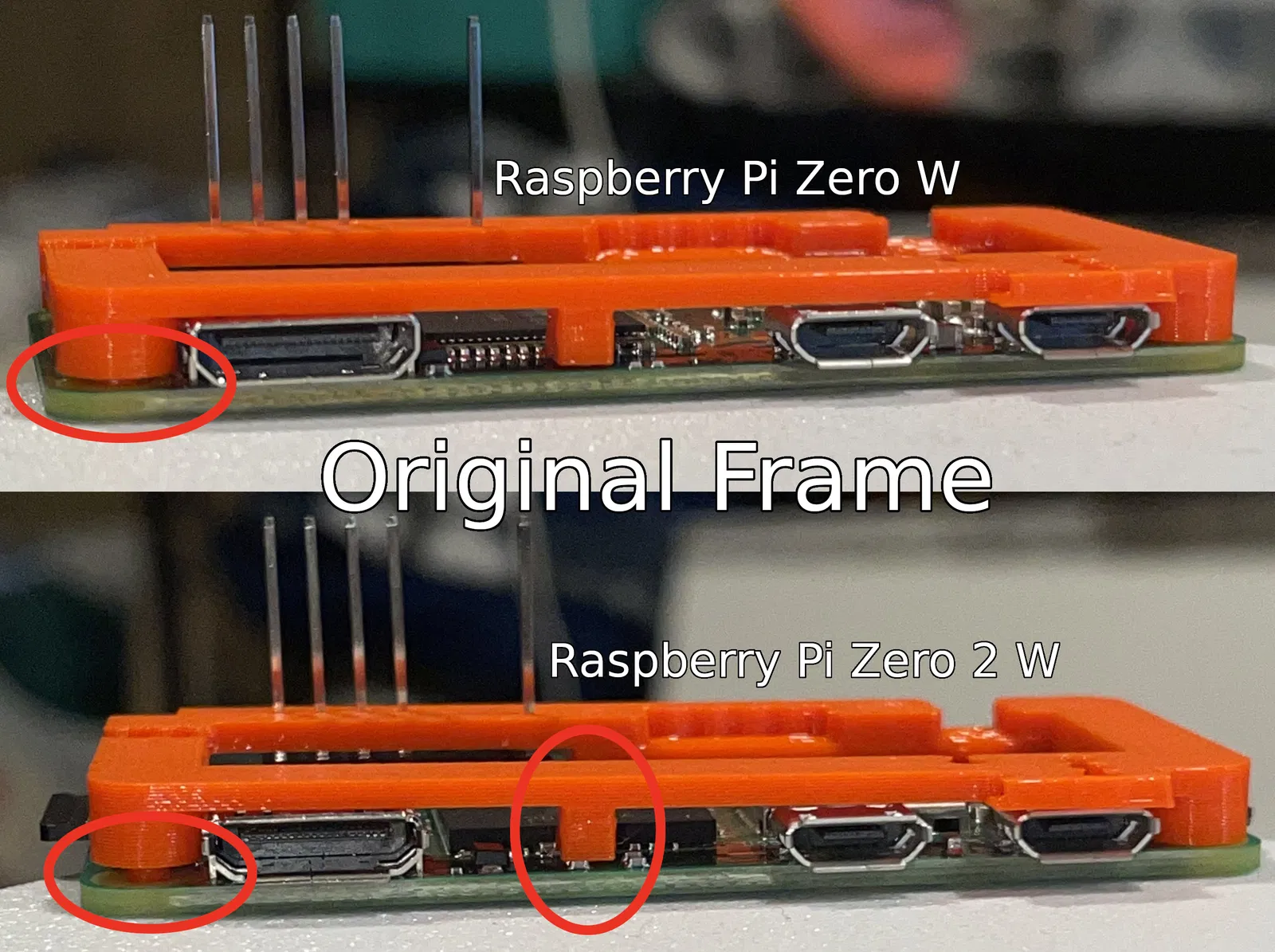 Đây là bản chỉnh sửa từ mẫu của Prusa Research. Bản gốc chỉ vừa với Raspberry Pi Zero, nhưng khung này vừa cho cả Raspberry Pi Zero W và Raspberry Pi Zero 2 W. (Zero 2 có các linh kiện ở vị trí khác so với Zero (1), và khung này đã tính đến vị trí của các linh kiện trên cả hai.)