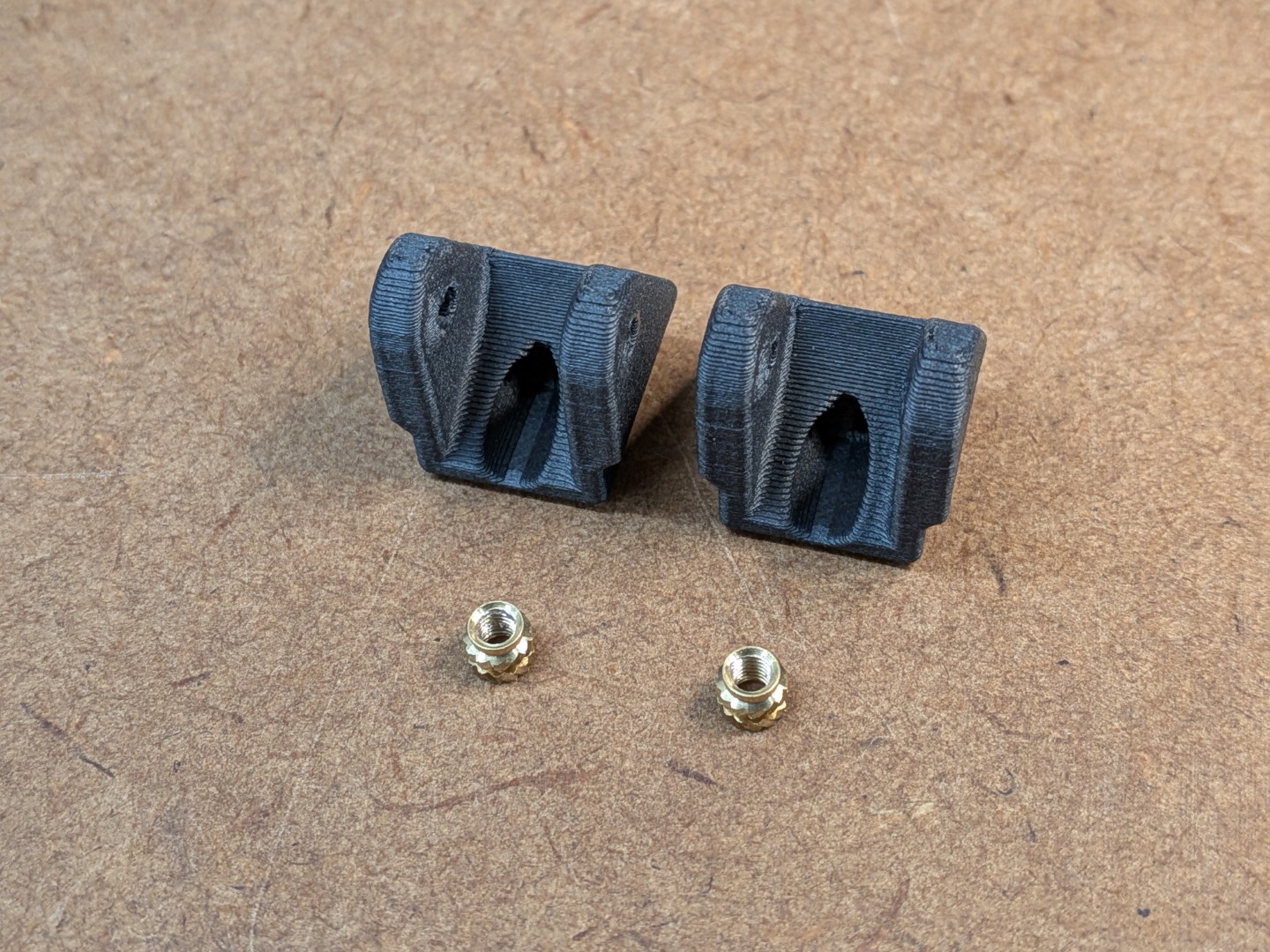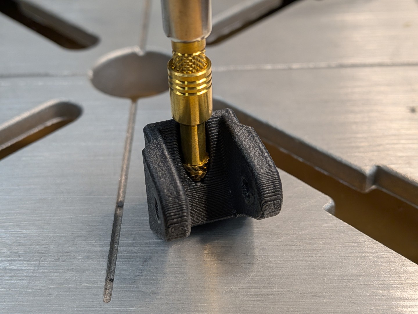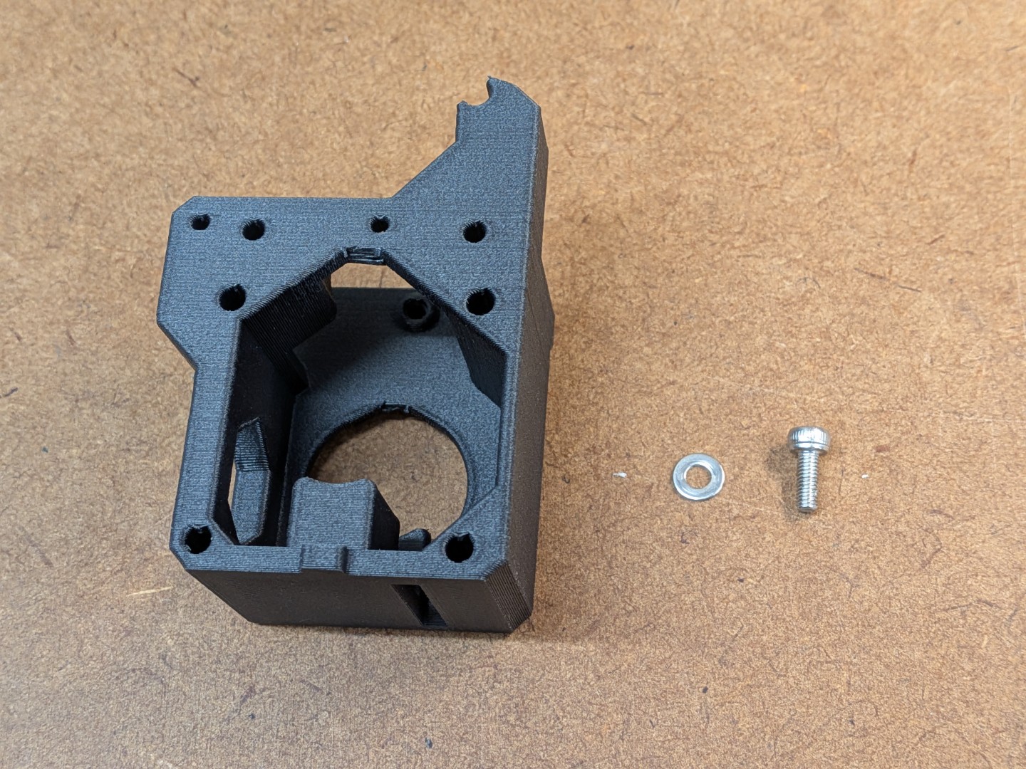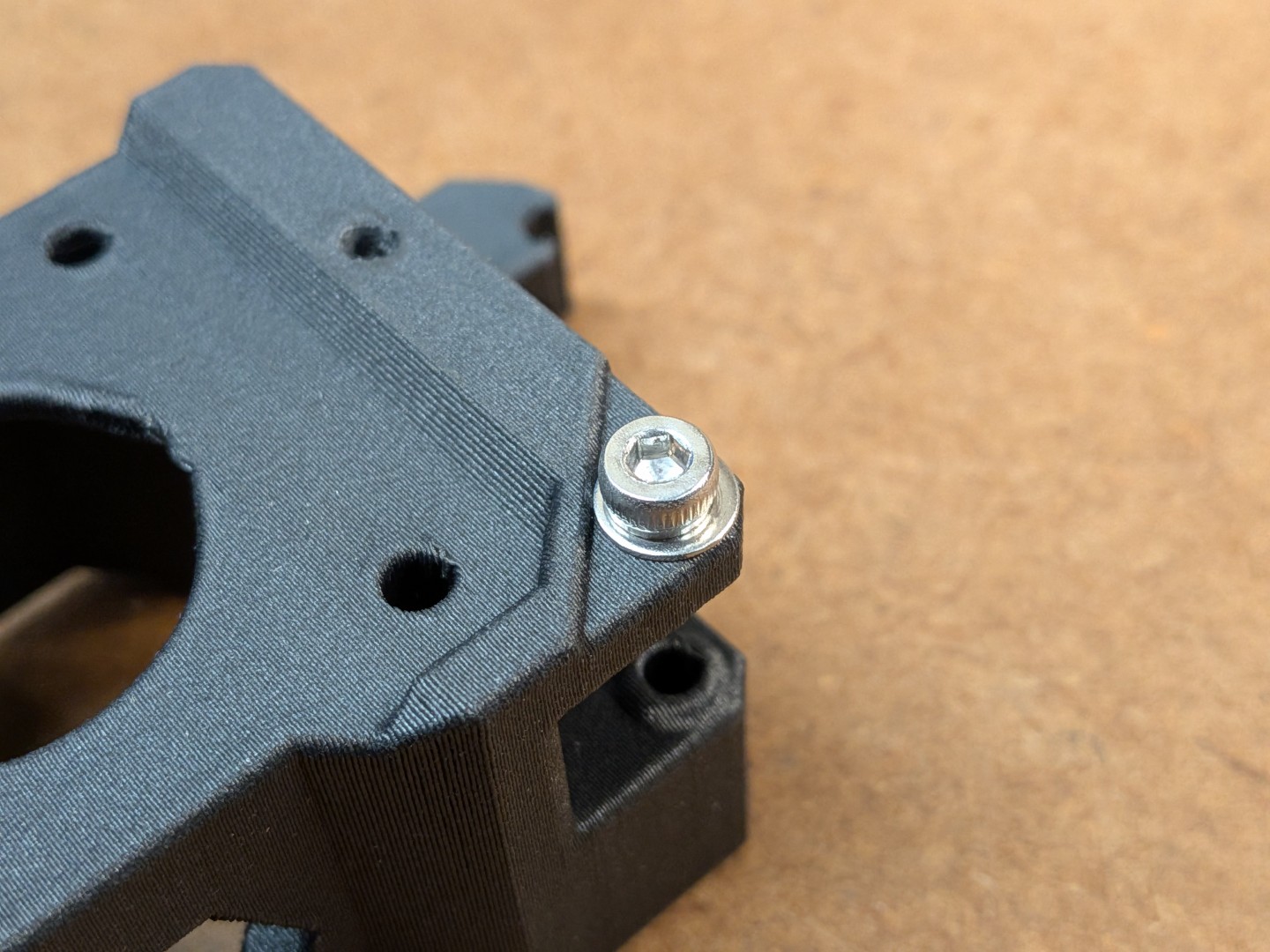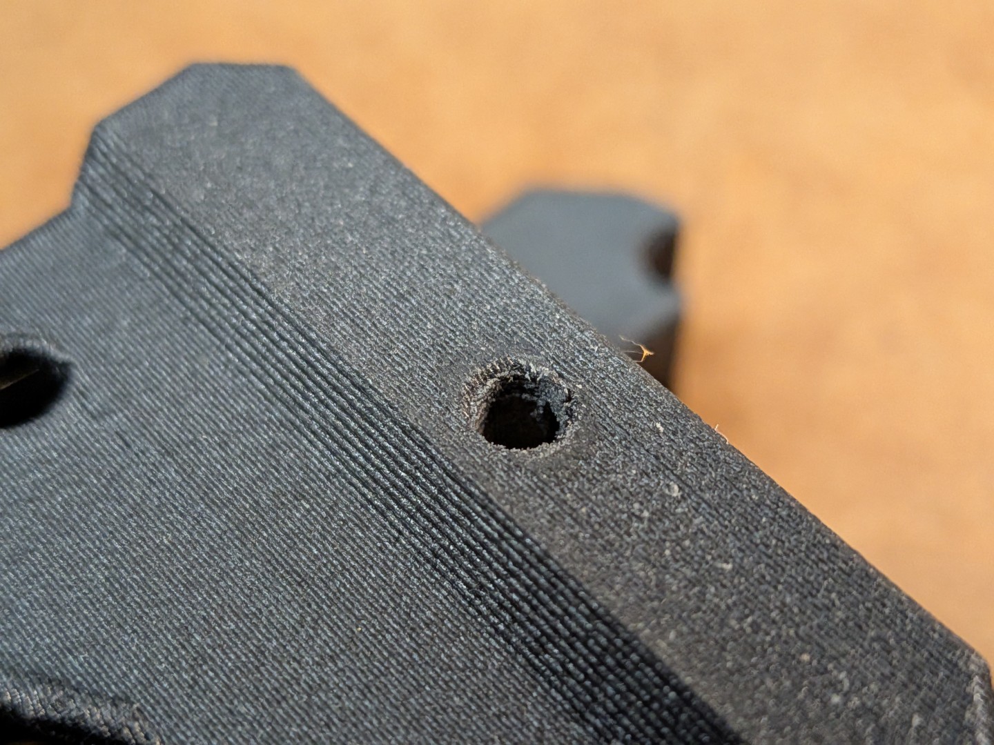 Các chốt trong bộ phận Giá đỡ động cơ không đi xuyên hoàn toàn. Làm theo hướng dẫn và khoan mở lỗ “bên trong” từ bên trong bằng bu lông dài hơn. Hoặc, sử dụng mũi khoan 2.5mm để mở điểm dừng 1mm và sau đó bạn có thể sử dụng kỹ thuật bu lông M3 từ bên ngoài bộ phận.