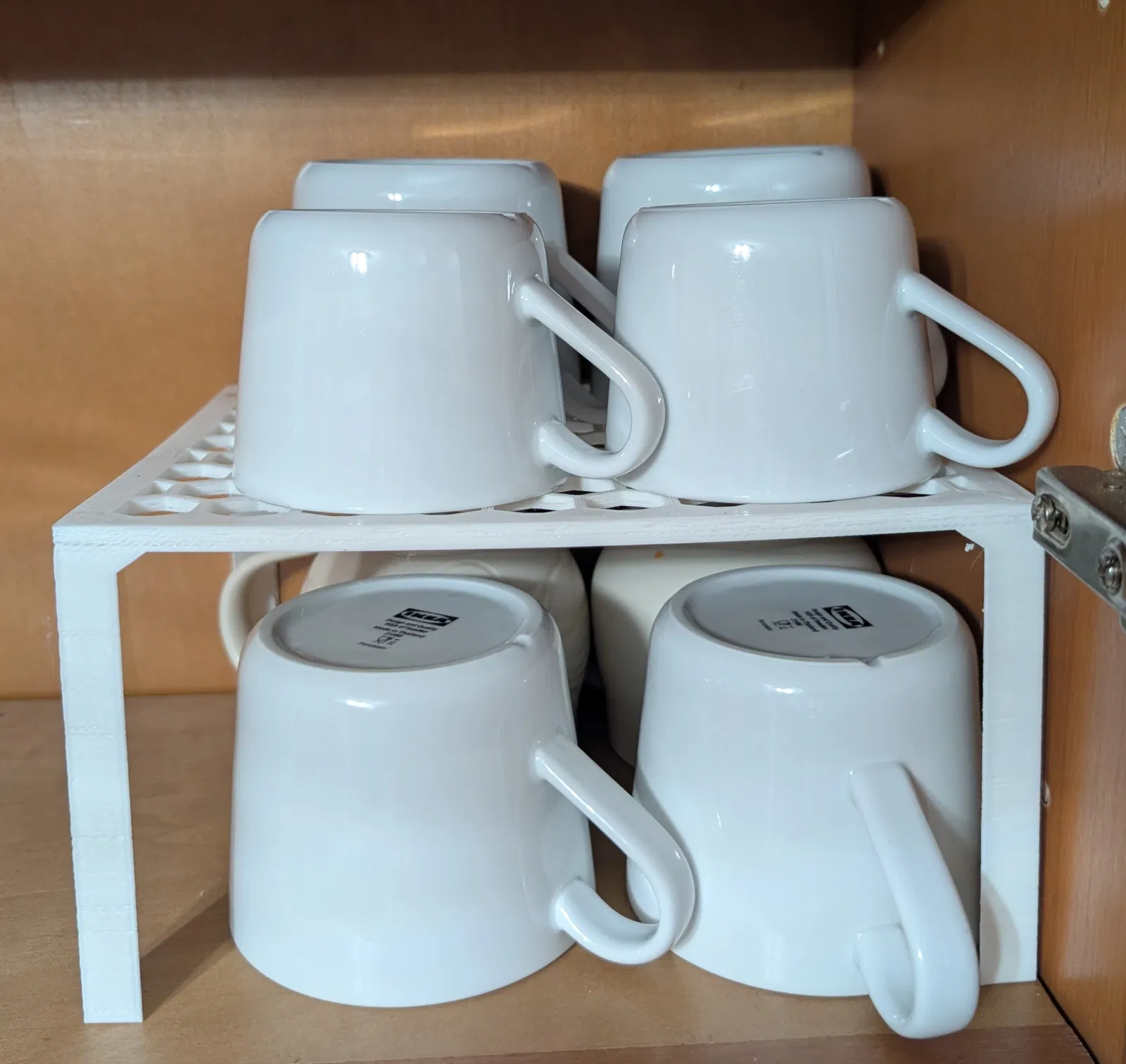 Để ly và các vật dụng khác trên kệ tủ. Tiết kiệm không gian tuyệt vời và dùng ít nhựa in.