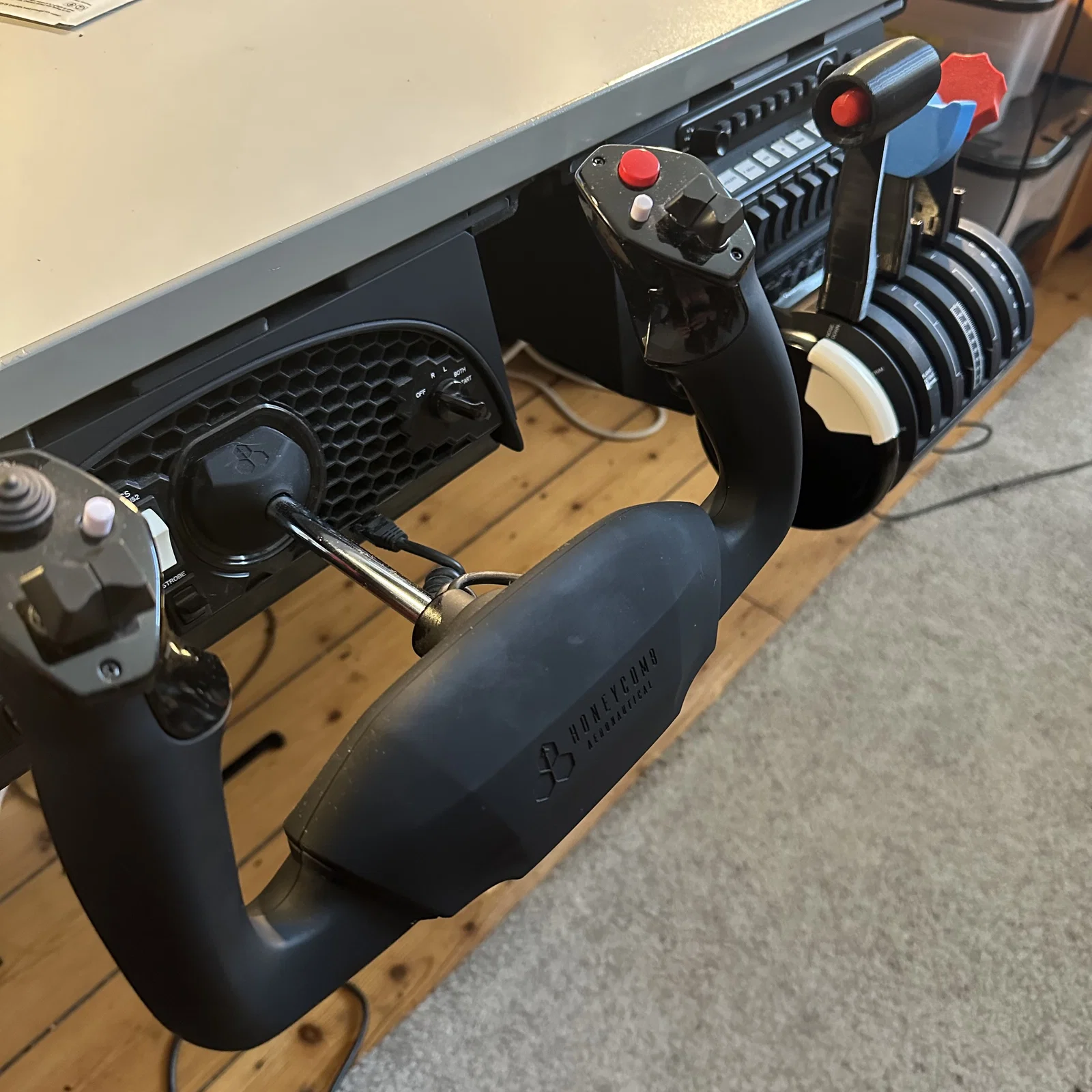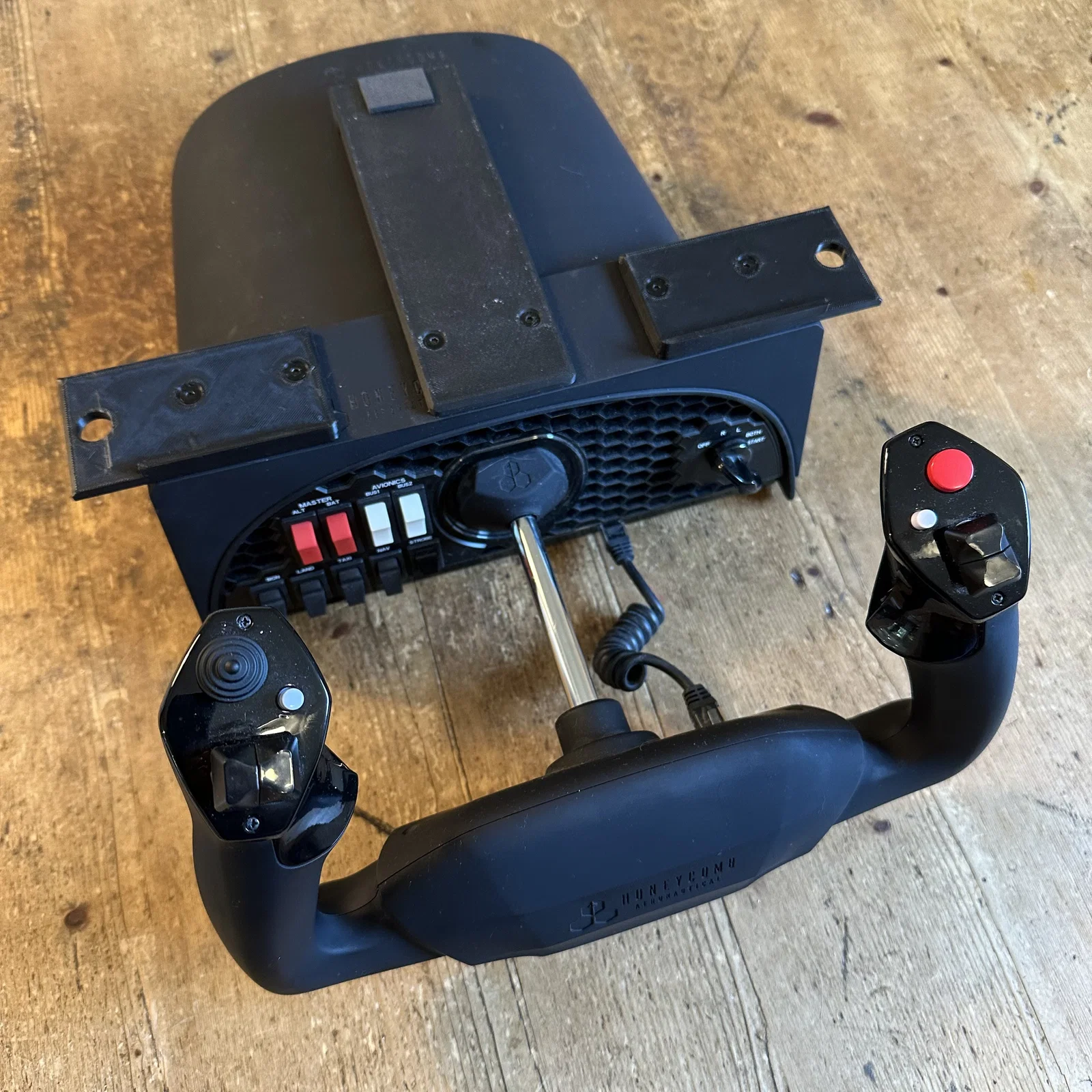 Tôi muốn có một cách để gắn bộ điều khiển bay Honeycomb Alpha và Bravo của mình dưới bàn làm việc nhưng theo cách mà chúng có thể nhanh chóng tháo ra và cất đi.