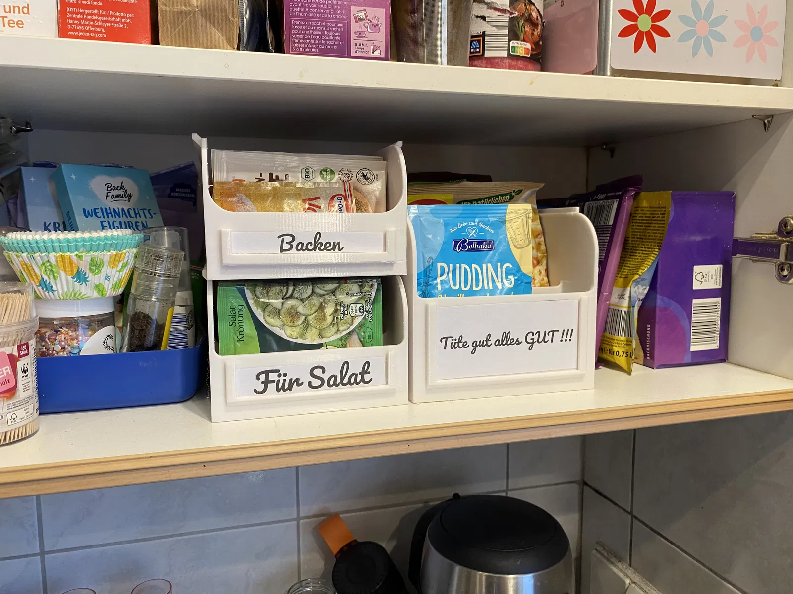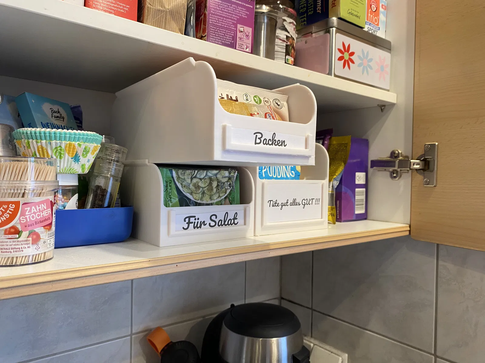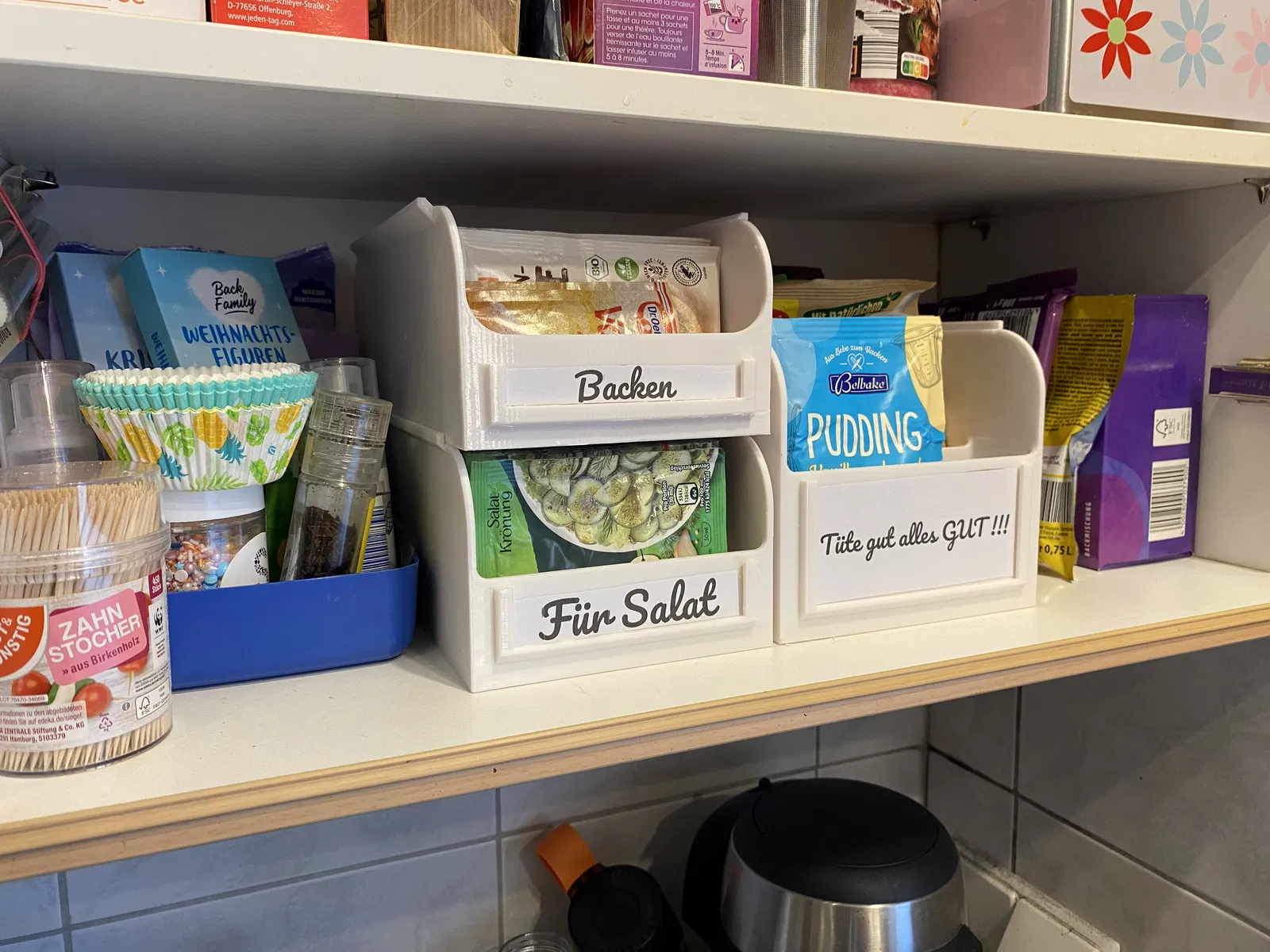 Hộp đựng túi bột làm bánh có thể xếp chồng, tùy biến hoàn toàn bằng thông số - in không cần support, cho mọi kích cỡ túi, có ngăn dán nhãn kiểu cổ điển. Điều chỉnh thông số chiều cao và chiều rộng bên trong để có hộp phù hợp.