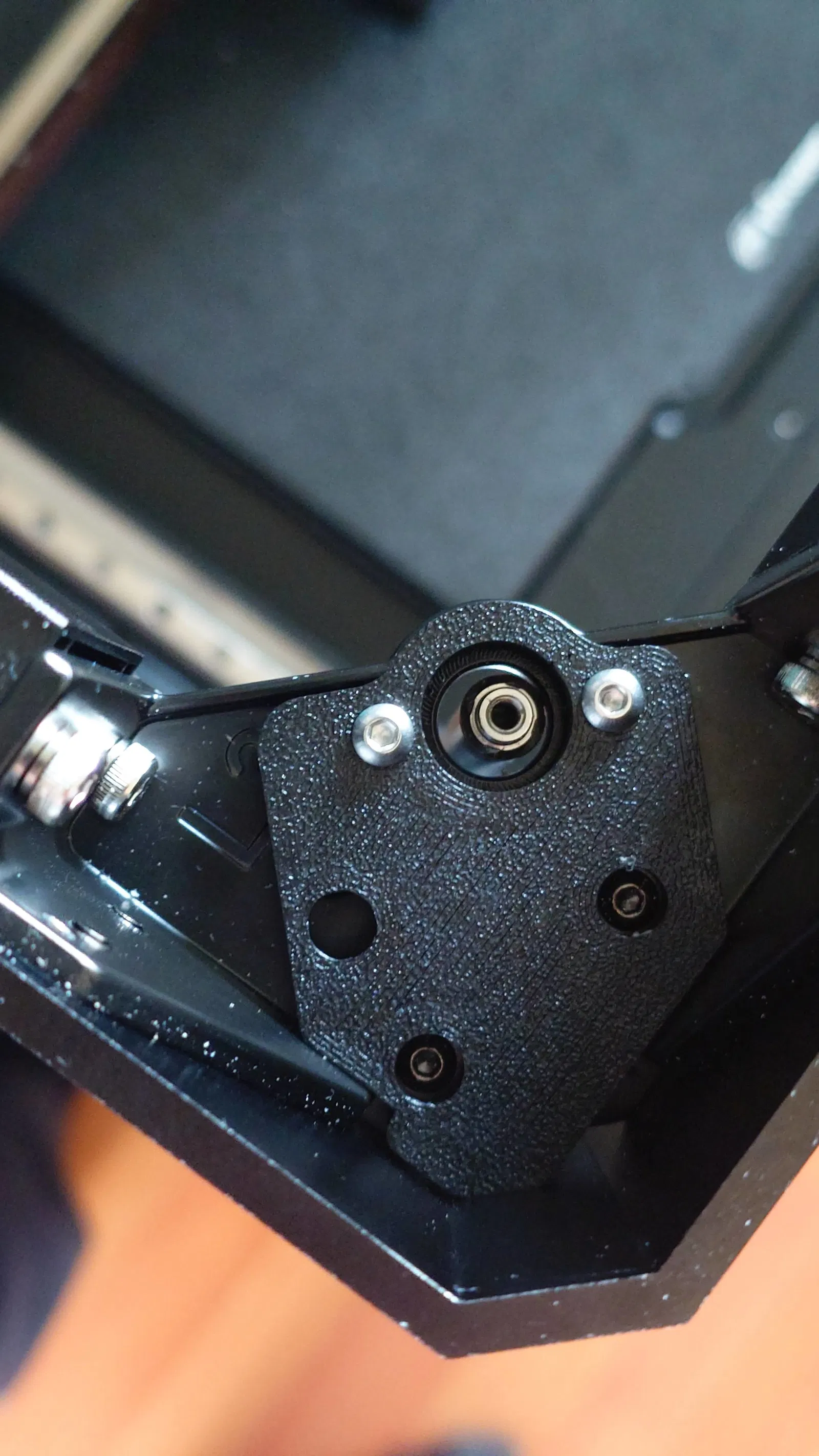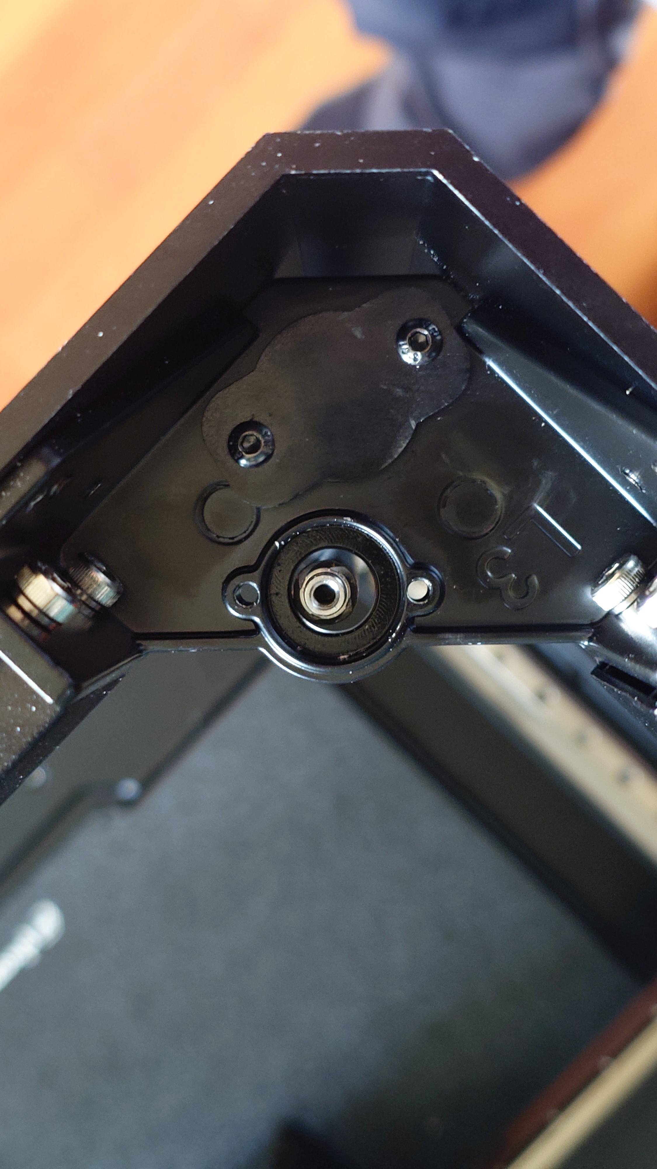 Sau khi kiểm tra các nguyên nhân có thể xảy ra, tôi phát hiện ra phần đầu của cả 4 trục vít me được cố định bằng một con vít vào bạc đạn phía trên. Tôi quyết tâm thiết kế một giải pháp cho vấn đề này, nhưng khi tôi tháo con vít trung tâm phía trước bên trái ra khỏi trục vít me để lấy hết số đo, toàn bộ trục Z đã bị tụt xuống khoảng 4 đến 5mm. Việc tạo ra độ rơ dọc 4 đến 5mm không phải là ý định ban đầu, vì vậy tôi đã tìm cách khắc phục chuyển động dọc này.