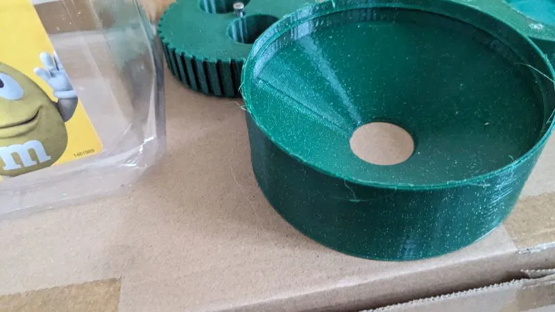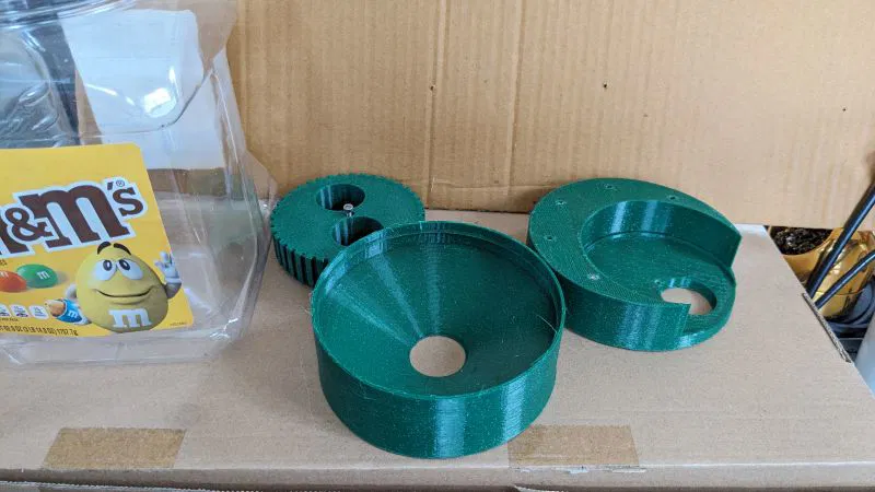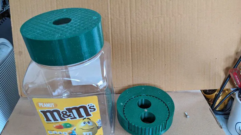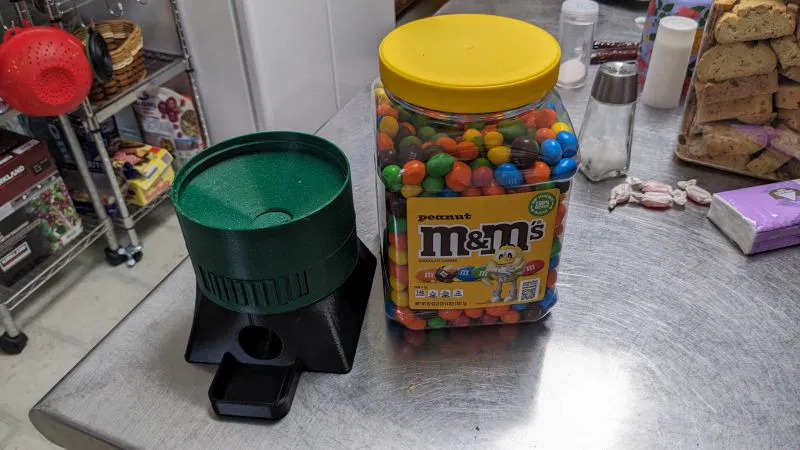 Máy rót kẹo M&M vặn trực tiếp vào hộp kẹo 62oz. Thiết kế với hai loại nắp vặn, một cho kẹo M&M đậu phộng với lỗ bầu dục lớn hơn, cho ra 2-4 viên mỗi lần. Có thể hơi kẹt khi lấy kẹo đậu phộng, cần dùng lực hoặc nghiêng nhẹ. Lắp ráp từ trên xuống, dùng vít M3. In không cần supports, khuyến nghị thông số in.
