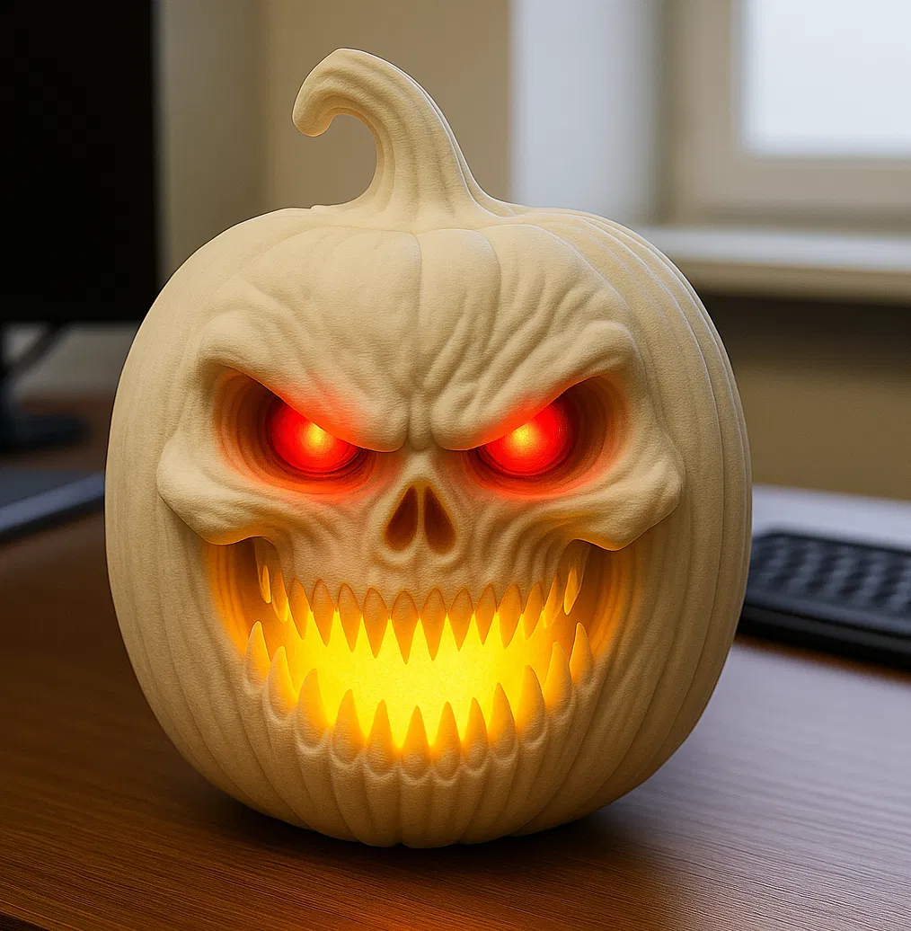 Mô hình bí ngô Halloween siêu đáng sợ, với mắt và miệng phát sáng đèn LED. Hướng dẫn chi tiết cách in, lắp ráp, bao gồm cả bộ lọc màu mắt đỏ tạo hiệu ứng chiều sâu và không gian chứa pin, dây đèn LED. Phiên bản V2 cải tiến với nhiều răng và chi tiết khuôn mặt hơn.
