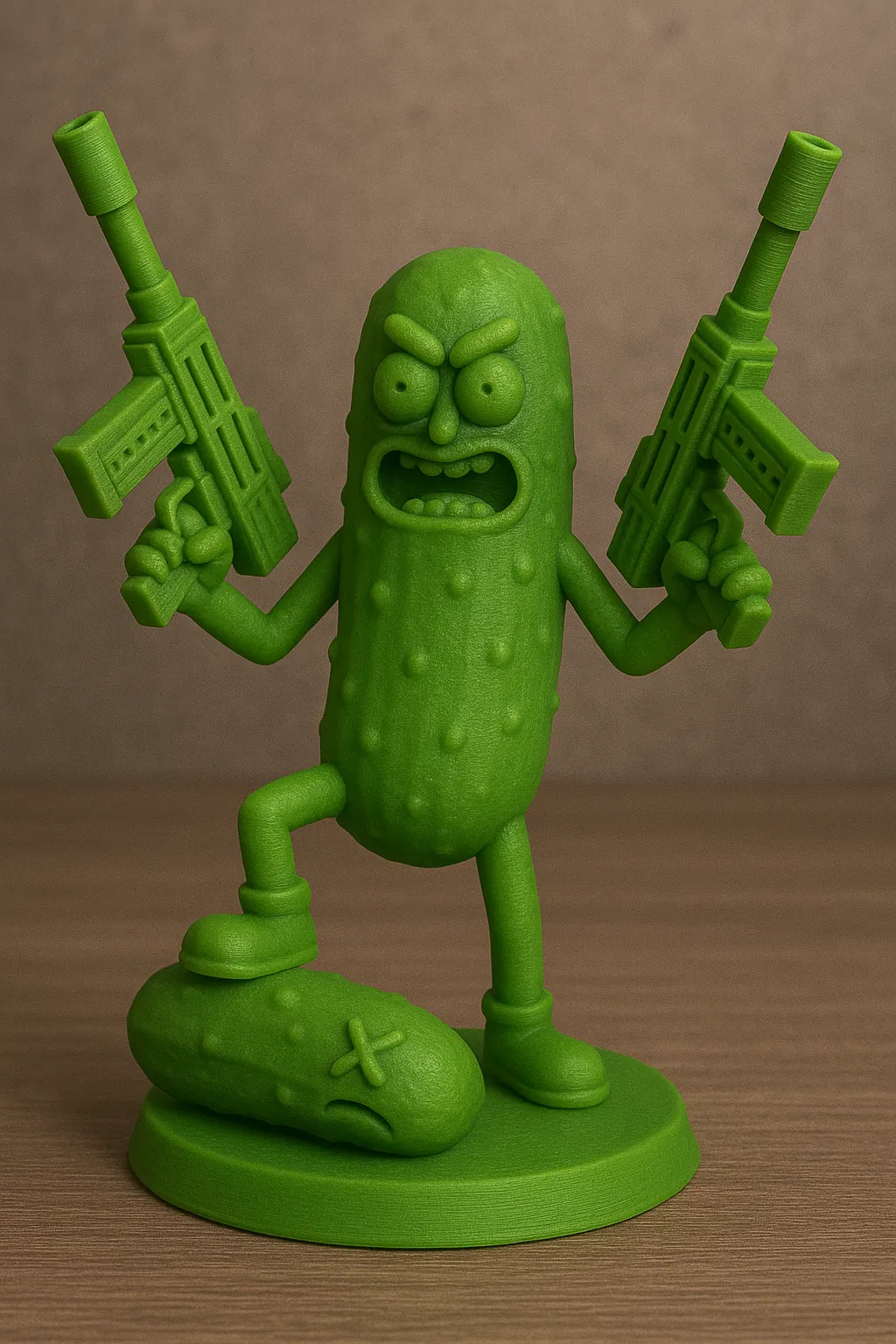 Chiến tranh Dưa Chuột – Bản Gốc SirPrintzALOT. Một mẫu tượng 3D in được độc đáo, chú dưa chuột dũng cảm với hai khẩu súng máy, sẵn sàng khuấy đảo kệ sách của bạn. Hoàn hảo cho dân sưu tầm và thích hài hước.