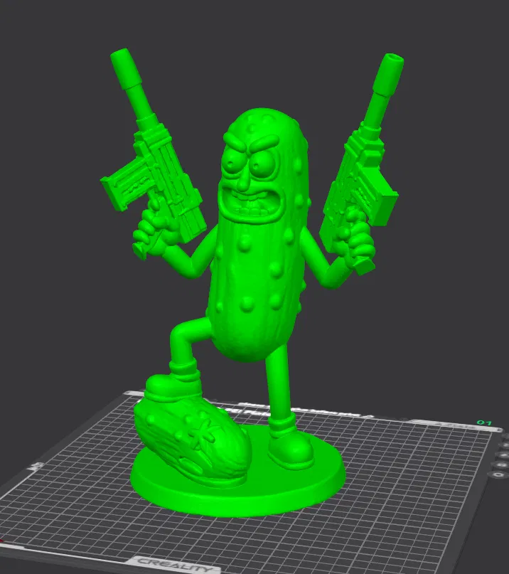 Vừa mới chui ra khỏi hũ mà đã sẵn sàng lâm trận rồi nè — Pickle Warfare là một mẫu tượng 3D in được độc đáo của SirPrintzALOT. Chú dưa chuột dũng cảm này đứng hiên ngang với hai khẩu súng máy .50 caliber, mỗi tay một khẩu, oai vệ đứng trên một chú dưa chuột địch thua cuộc. Mọi chi tiết — từ mấy cái vân sần cho tới mấy đường in 3D — đều được thiết kế để khoe hết cái hay của chiếc Creality K1 Max của bạn.