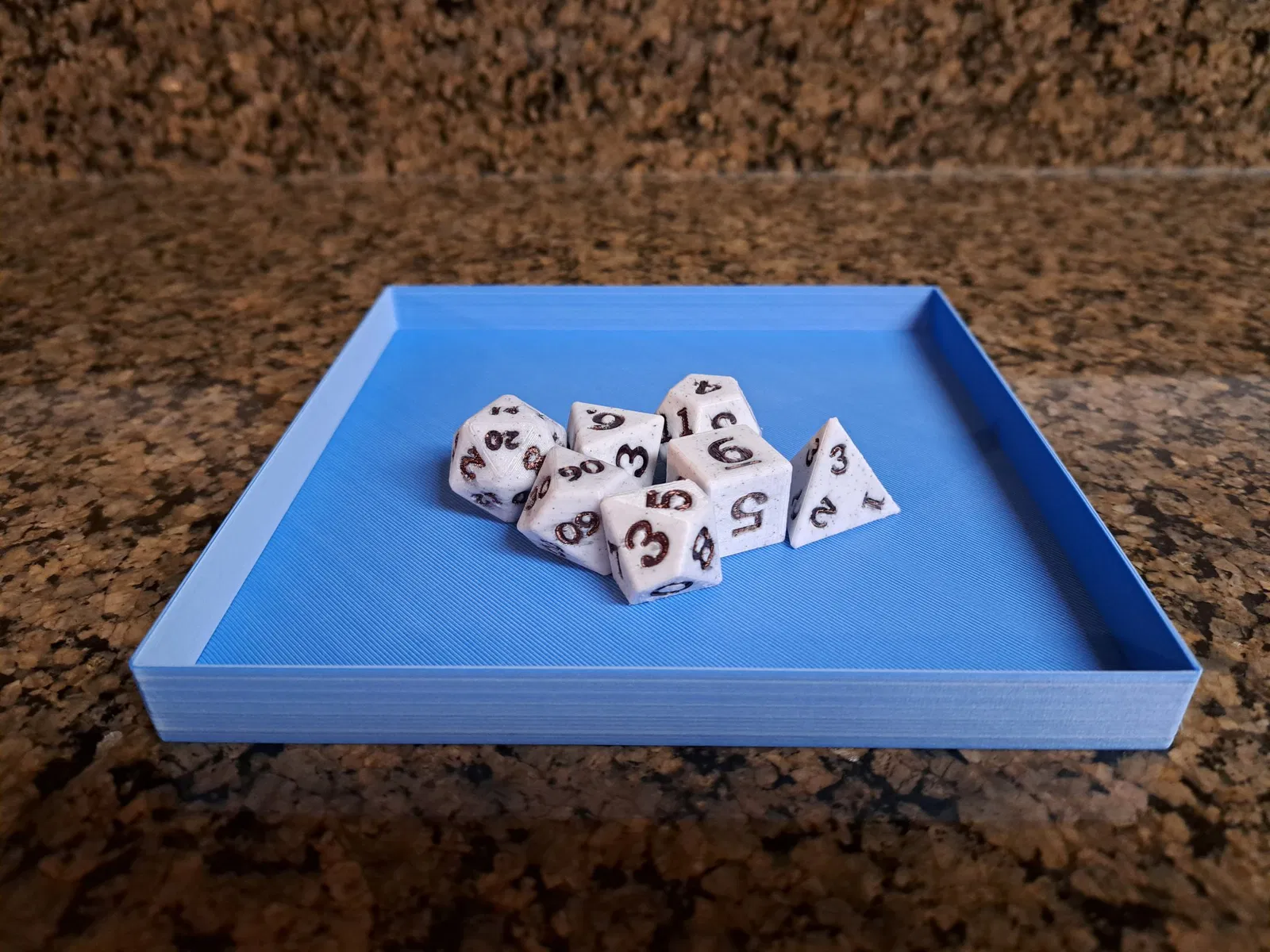 Mô tả: Đây là một bộ xúc xắc D&D mà tôi đã thiết kế. Nó bao gồm 7 xúc xắc đa diện khác nhau và một khay xúc xắc để lăn chúng.