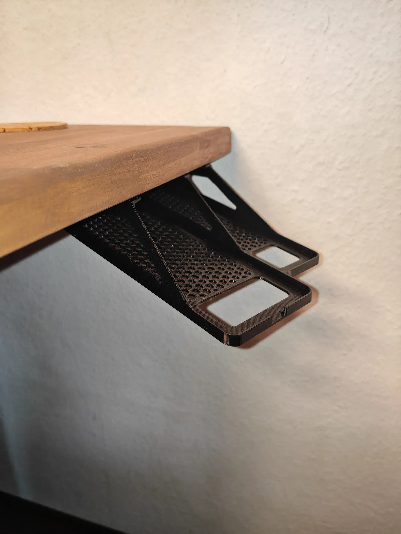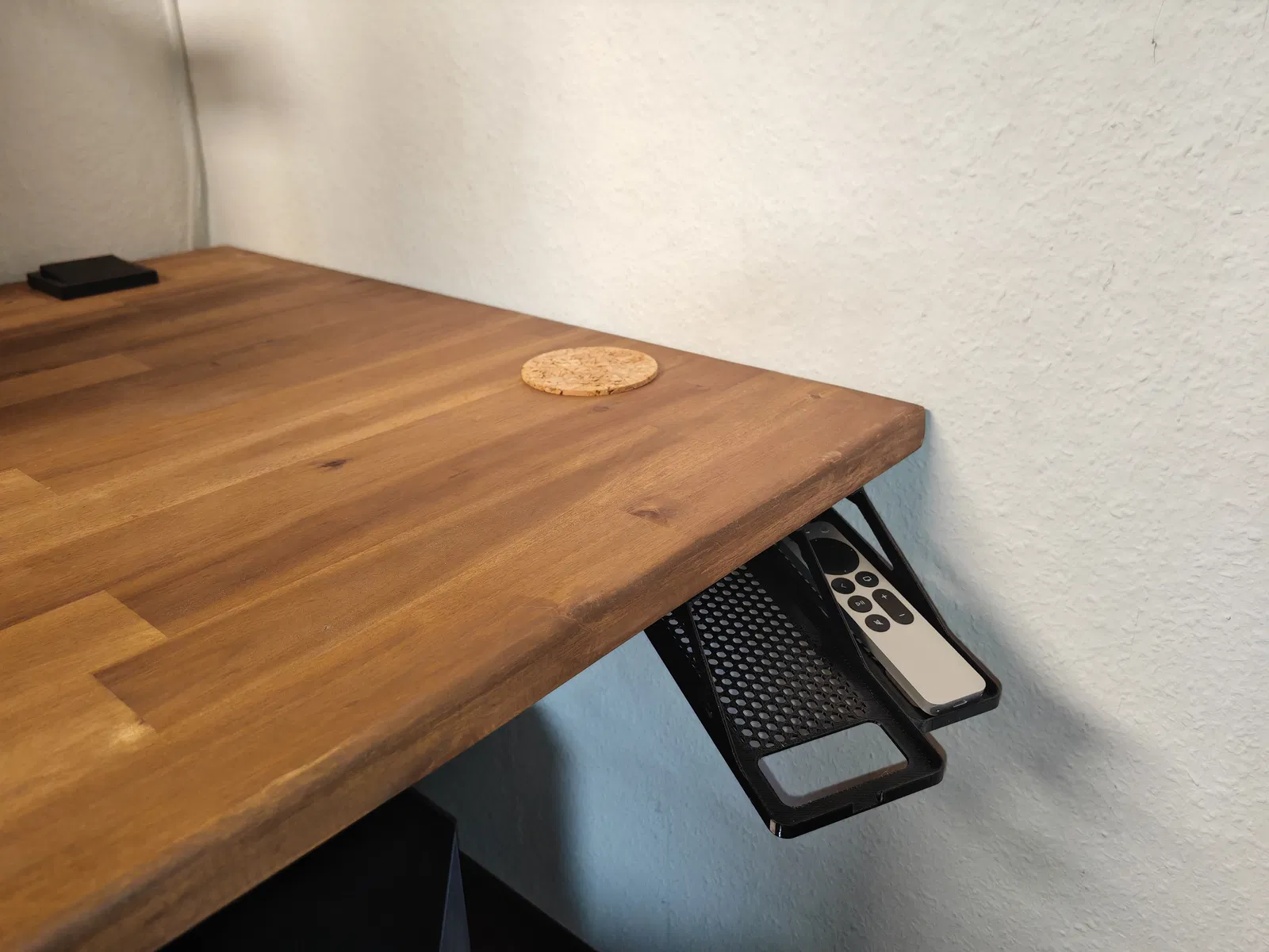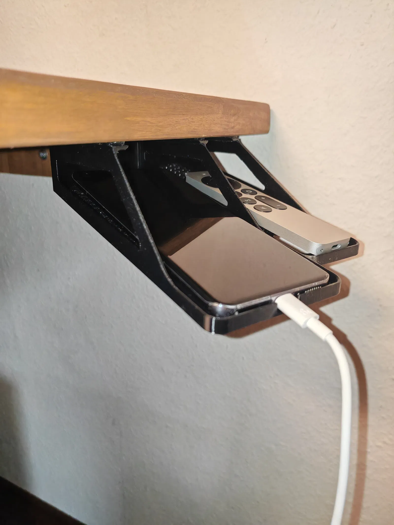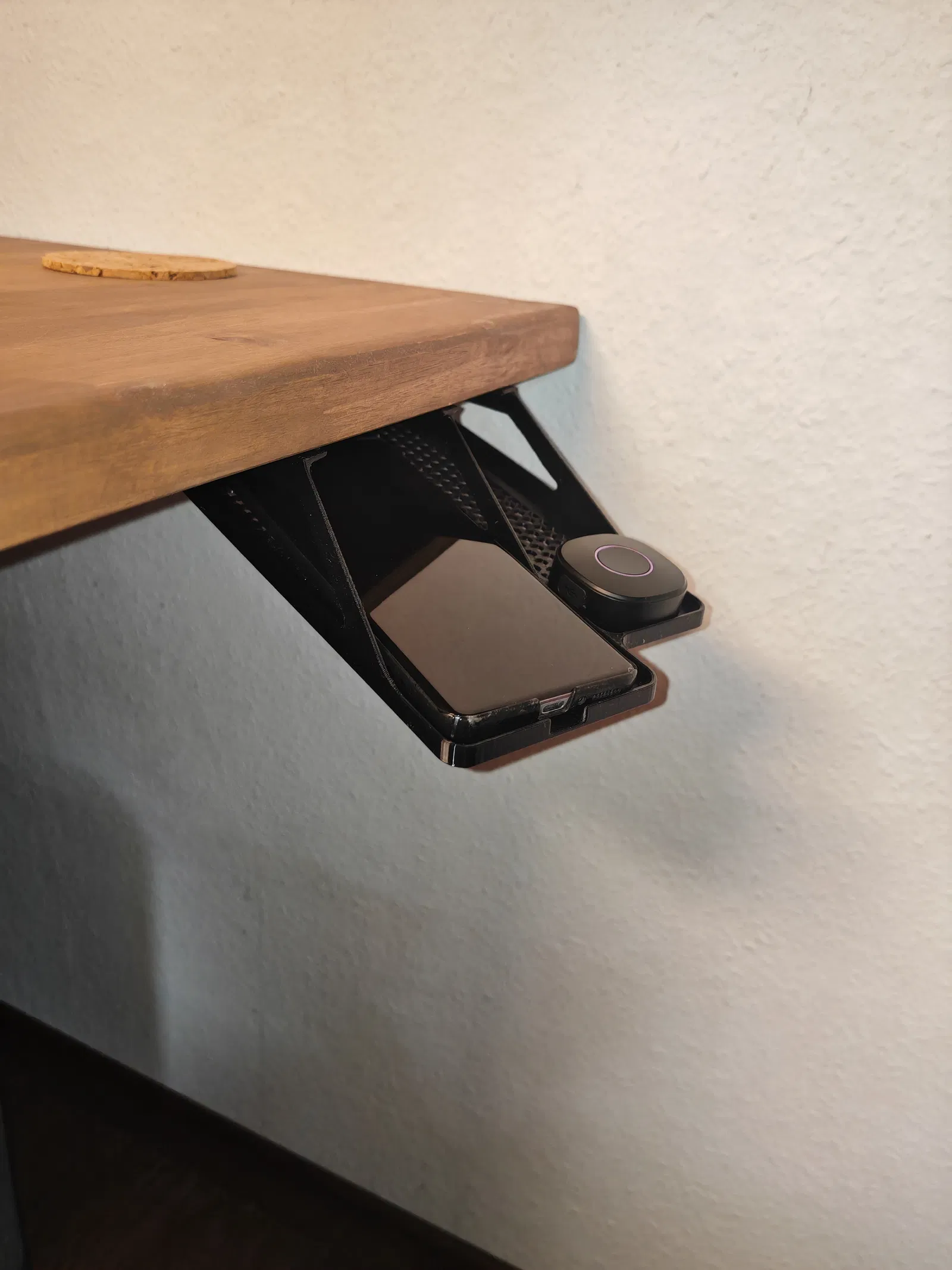 Kệ để điện thoại thông minh dưới bàn làm việc, tạo thêm không gian và sự ngăn nắp. Có thể cất giữ thêm bộ điều khiển từ xa, bút hoặc các vật dụng nhỏ khác. Có 2 phiên bản để lựa chọn: có và không cần hỗ trợ, in bằng PETG để có độ linh hoạt. Dễ dàng lắp đặt bằng băng dính hai mặt.