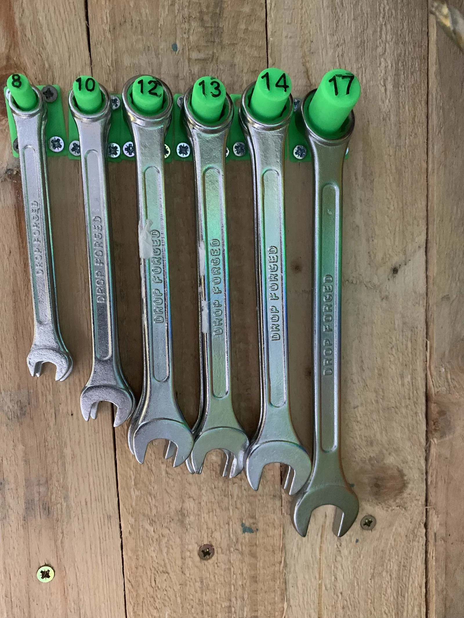 Tui mất kha khá thời gian để làm ra cái giá đỡ cờ lê này, tui muốn nó có thể tùy biến khi bộ sưu tập của tui ngày càng nhiều nên phải làm từng cái riêng lẻ, đồng thời nó cũng chiếm ít diện tích, và hiển thị được kích thước của cờ lê.
