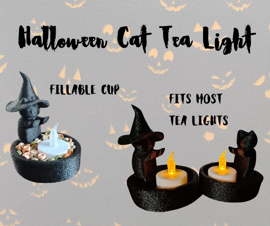 Mẫu đèn trà Halloween hình mèo con dễ thương, đang sưởi ấm đôi chân bên lửa. Có hai phiên bản: mèo đơn hoặc mèo đội nón phù thủy. Phù hợp với hầu hết nến trà đường kính 43mm. Nên in có hỗ trợ và có thể dùng fuzzy skin. Lưu ý chỉ dùng nến pin.
