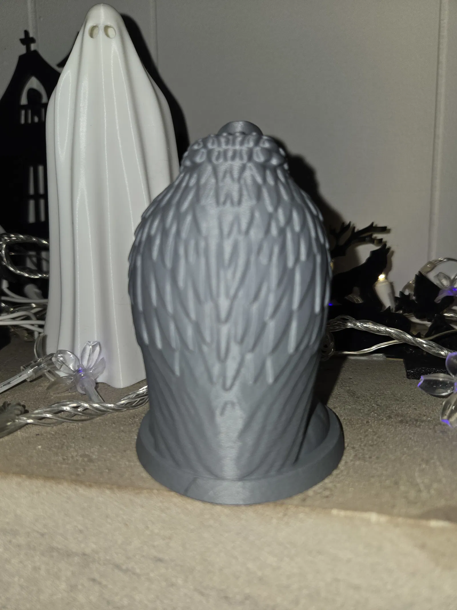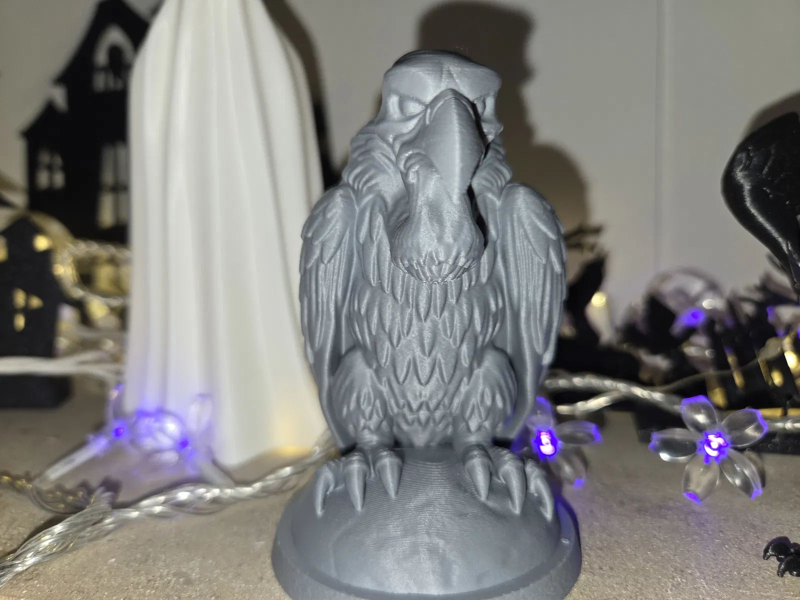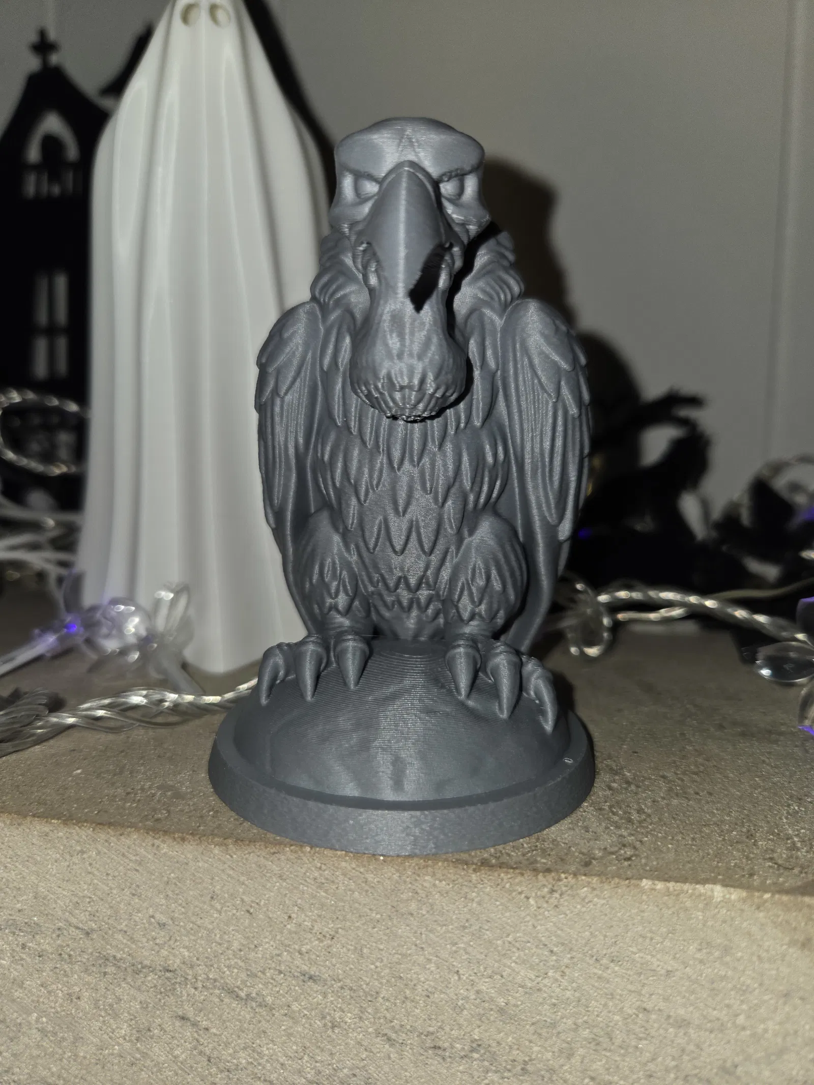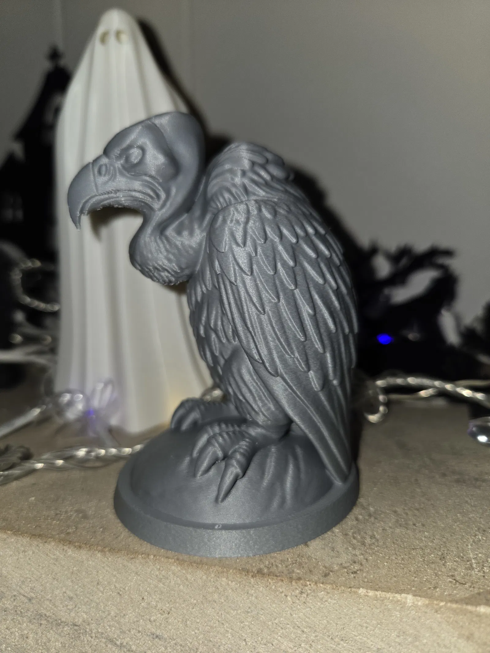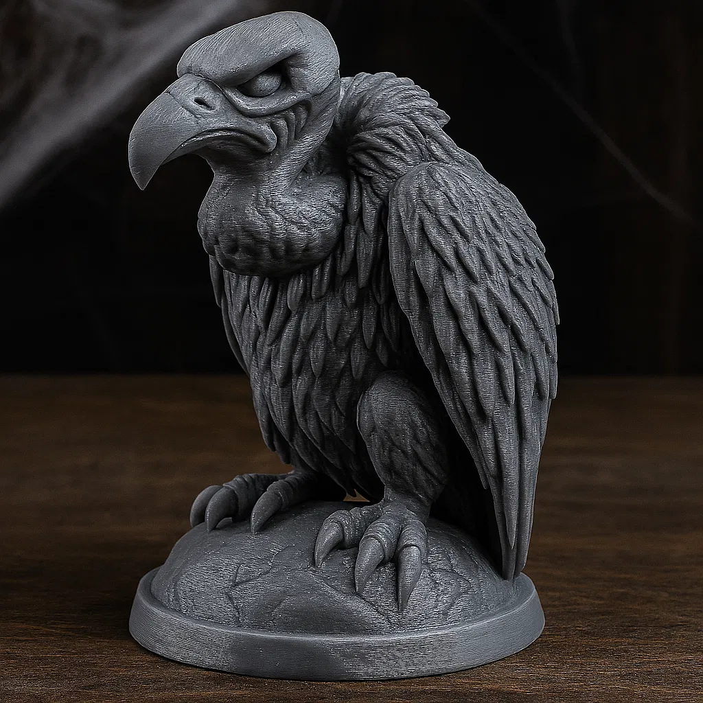 Kẻ Gác Đêm Lò Sưởi – Kẻ Săn Mồi Giữa Hư Không Trễm trệ trên bệ đá nứt nẻ, bức tượng chim kên kên này mang đến vẻ đẹp rợn người cho không gian Halloween của bạn. Được thiết kế để in với ít hỗ trợ nhất, nó có các lớp lông vũ, dáng đứng khom lưng và chiếc mỏ khoằm đầy đe dọa—hoàn hảo cho bàn làm việc, lò sưởi hoặc trạm chế tạo ma ám. Chủ nghĩa hiện thực Gothic pha chút đe dọa hoạt hình, tuyệt vời nhất.