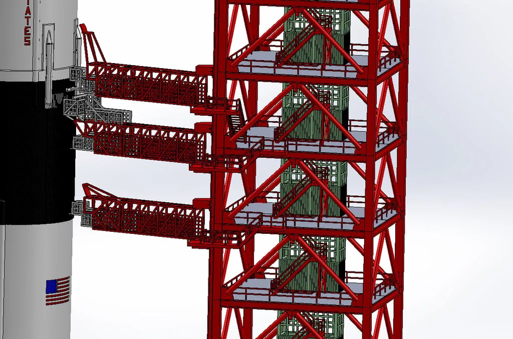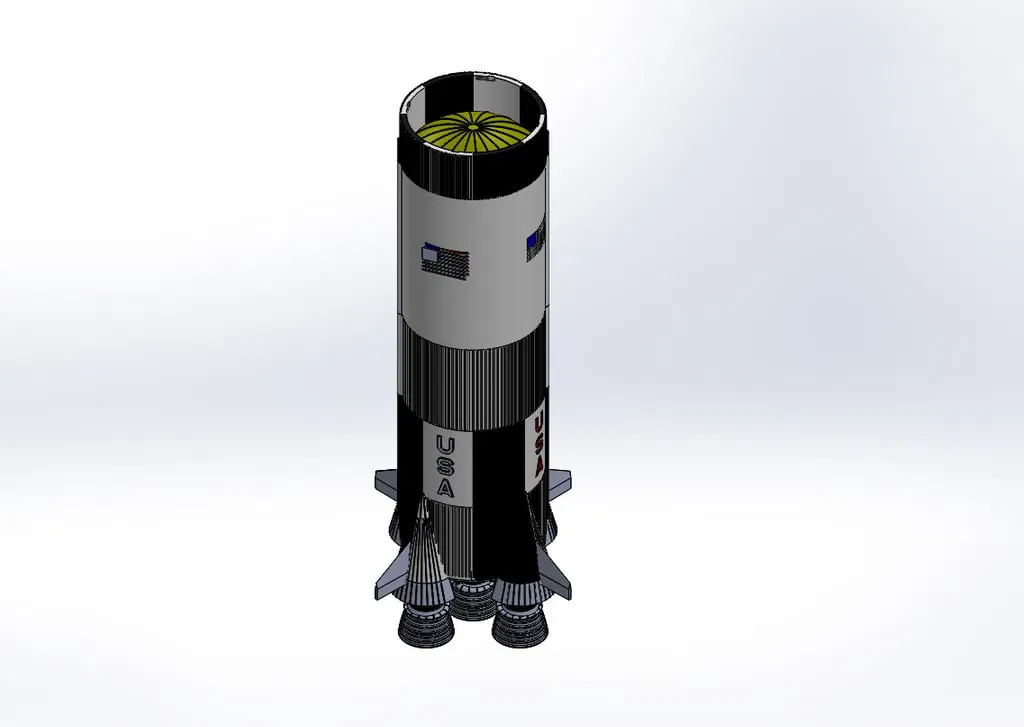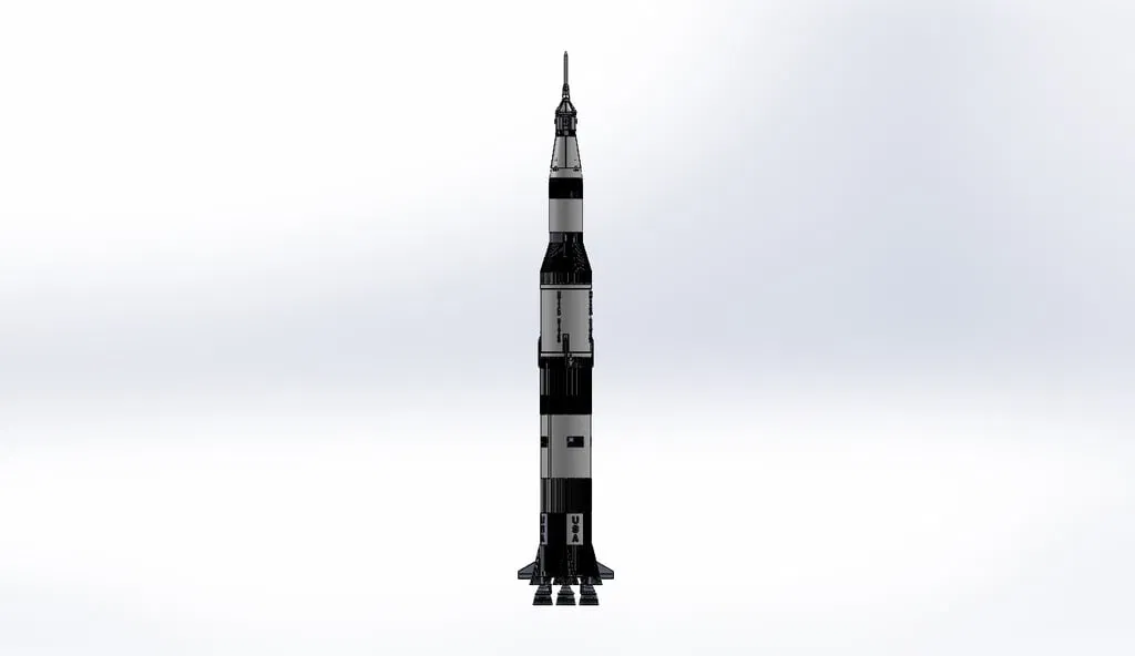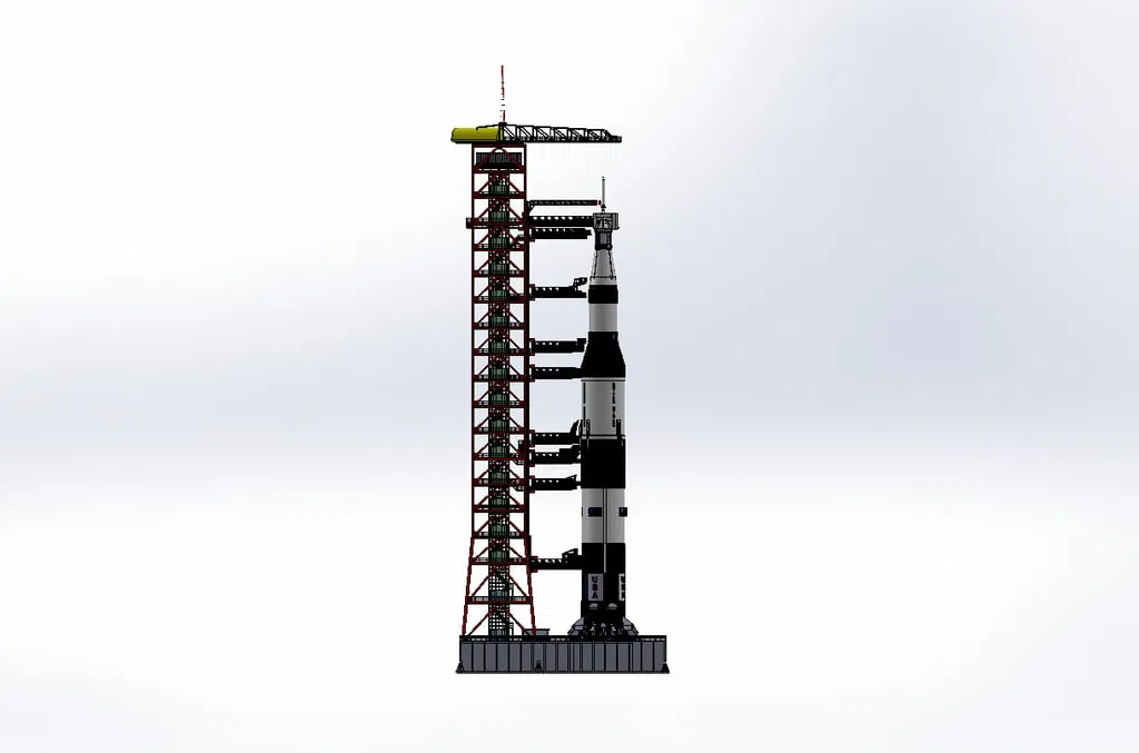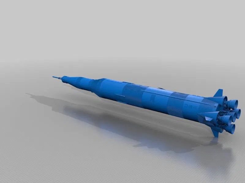 Mô hình tỷ lệ 1/60 của tên lửa Saturn V biểu tượng và bệ phóng di động. Mô hình này có cánh tay bệ phóng và cần cẩu di chuyển được, mỗi tầng có thể tách rời và tàu đổ bộ Mặt Trăng. Việc in ấn và thiết kế rất tốn thời gian và vật liệu, sử dụng nhiều màu PLA và các máy in 3D khác nhau.