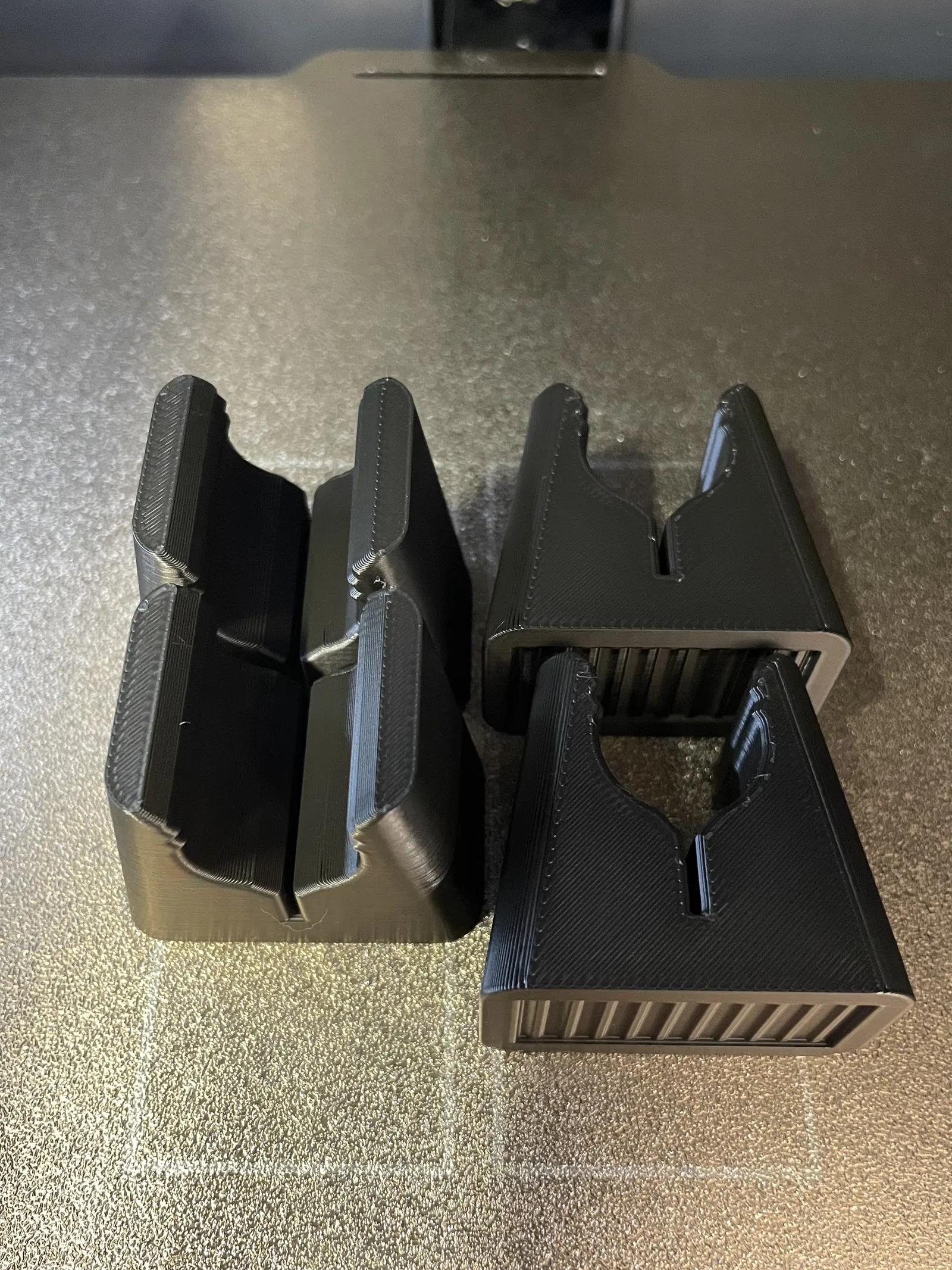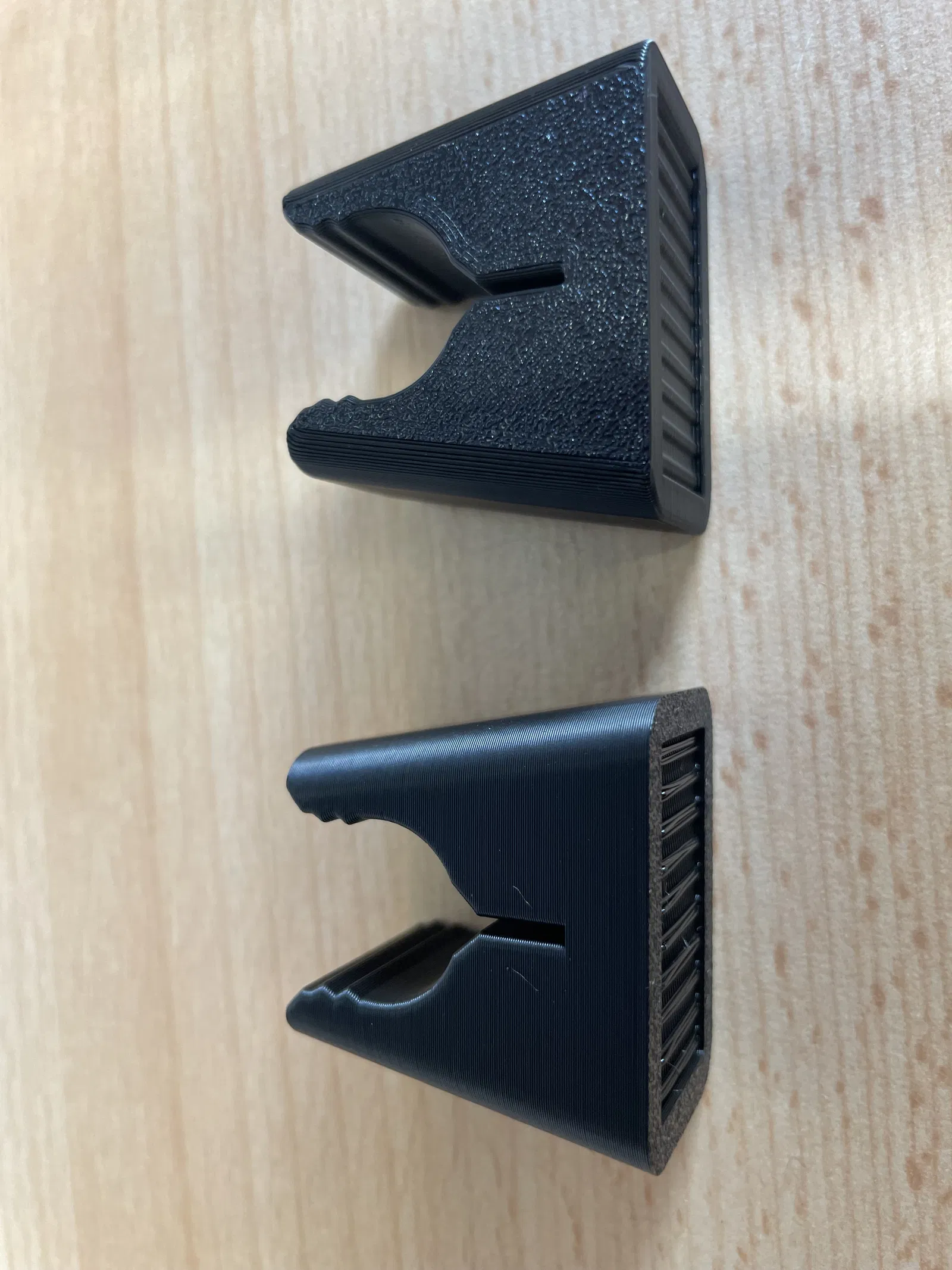 Chân đế có thể được in theo hướng đứng thẳng hoặc nằm nghiêng, mặc dù hướng đứng được khuyến nghị cho kết quả tốt nhất và vẻ ngoài sạch sẽ nhất. Ở mặt dưới, các gờ được tích hợp để dễ dàng gắn các miếng trượt bằng nỉ bằng keo nóng chảy, tạo ra cả diện tích bề mặt lớn hơn và vừa vặn. Điều này giúp ngăn ngừa trầy xước trên sàn gỗ cứng, nhưng chân đế cũng hoạt động tốt mà không cần miếng nỉ nào. Ngoài ra còn có một phiên bản không có các gờ này, nếu bạn không cần/muốn chúng. Điều này có thể làm cho việc in ấn dễ dàng hơn một chút, vì không cần cầu nối (bridging) ở đó. Nhưng việc cầu nối các gờ hoạt động rất tốt với tôi trong quá trình thử nghiệm và sẽ không có vấn đề gì với bất kỳ máy in nào. Bạn cũng có thể sử dụng phiên bản "noRidges" để gắn các miếng trượt bằng keo siêu dính.