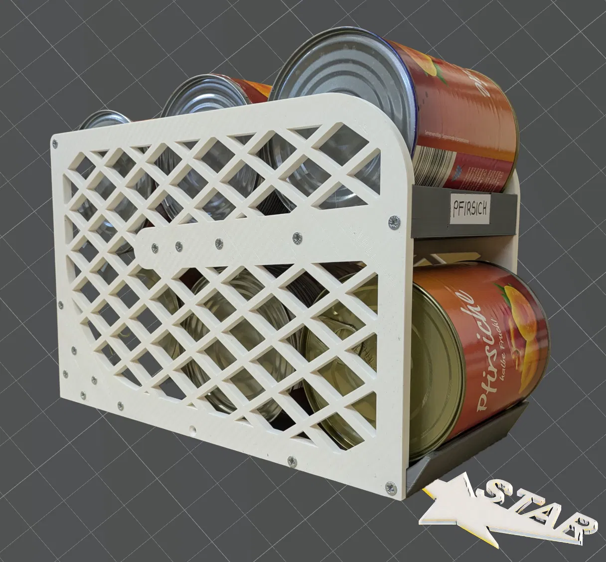 Dùng cho 6 lon thực phẩm 850ml. Kích thước tối đa Ø102mm x C122mm. Hộp đựng này giúp bạn sắp xếp lon thực phẩm theo nguyên tắc "vào trước, ra trước", đảm bảo bạn luôn sử dụng các lon cũ hơn trước. Được làm từ PLA+, với cài đặt máy in tối ưu cho kết quả tốt nhất.
