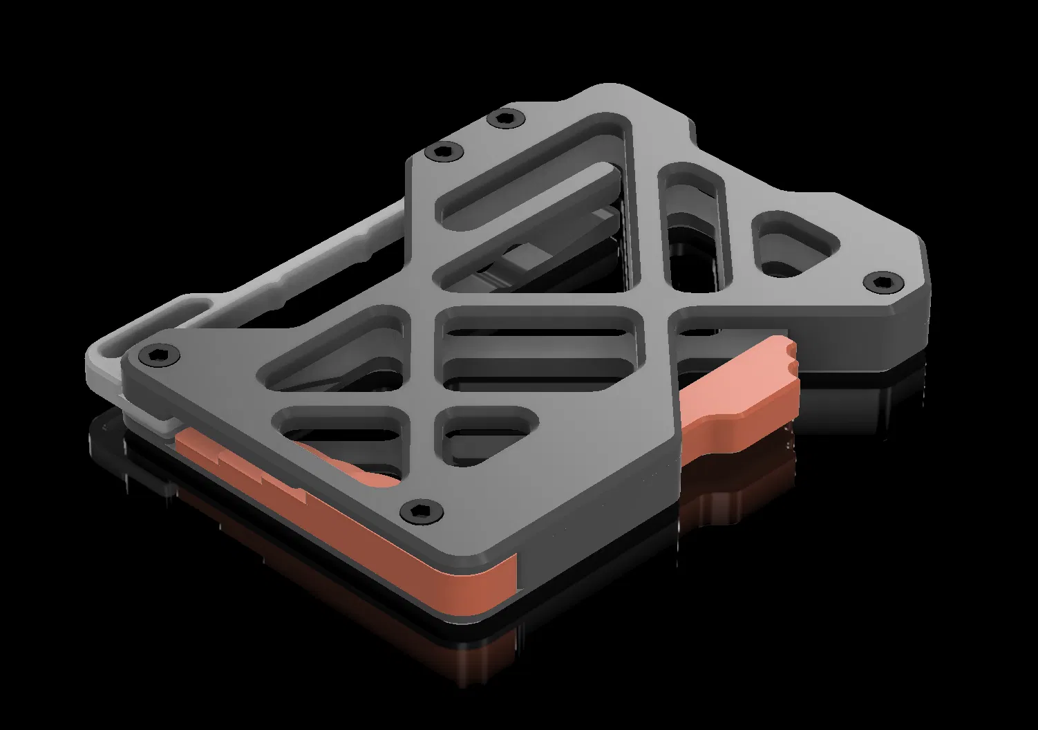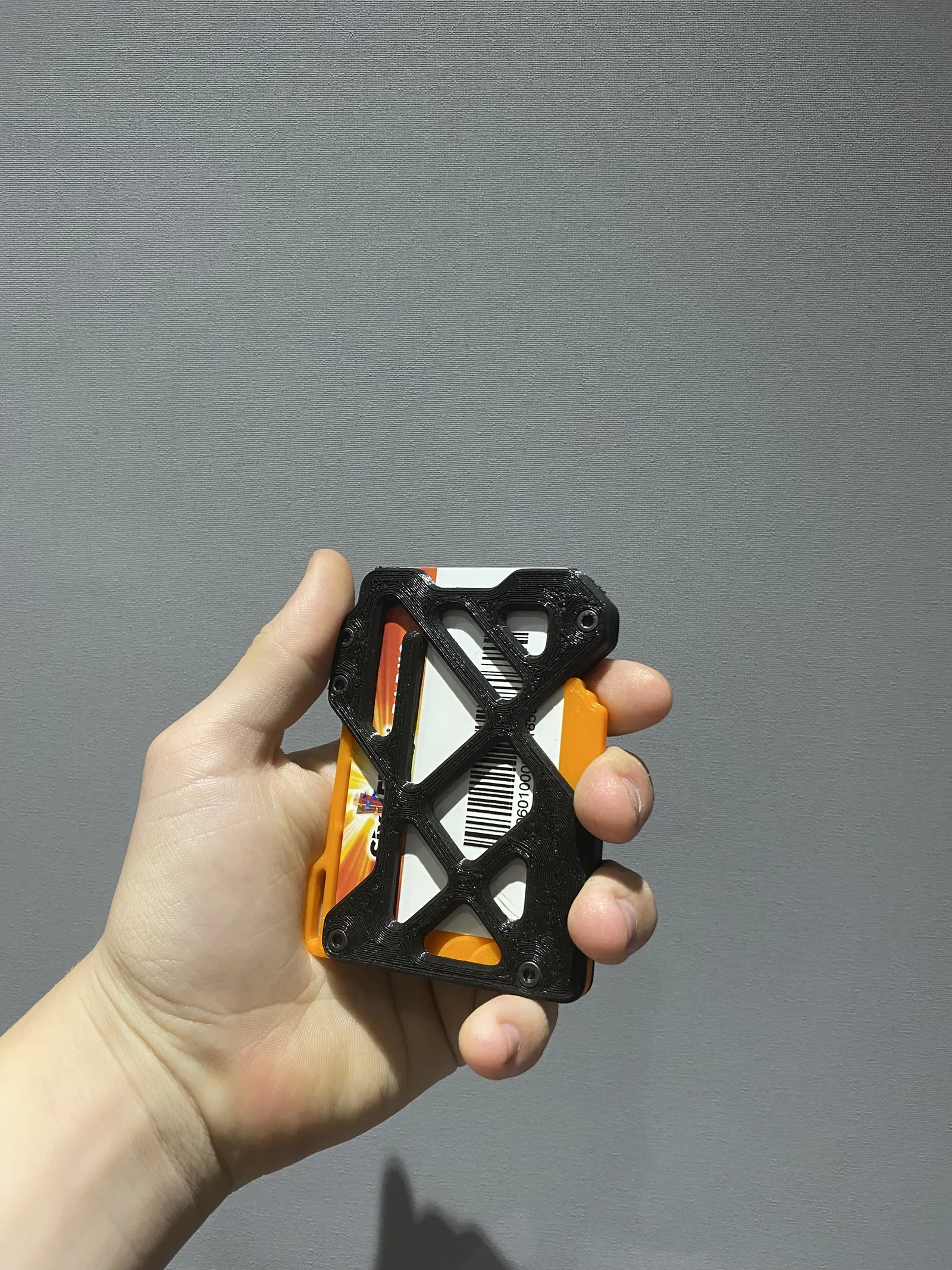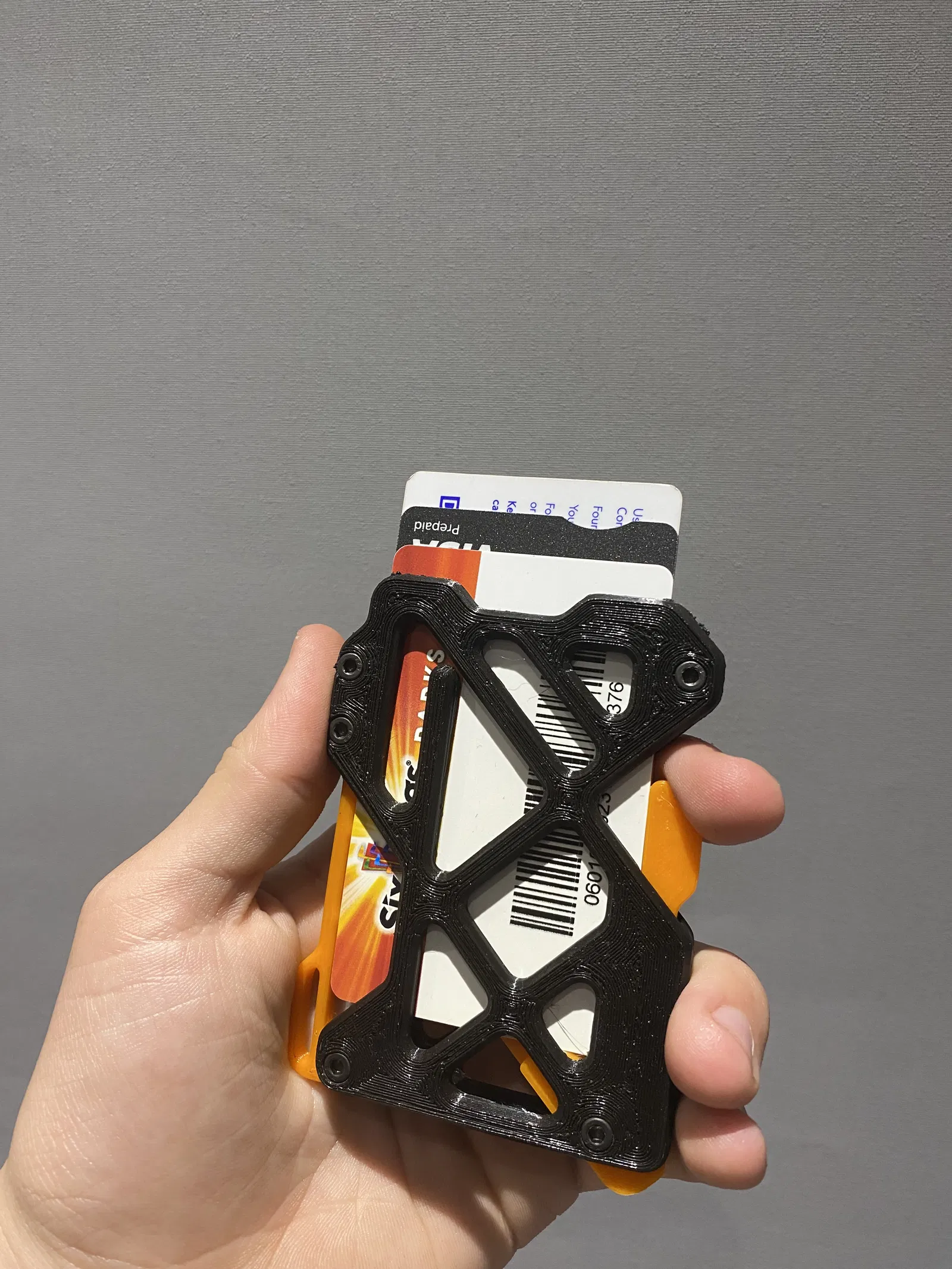 Cái ví đựng thẻ này có thể chứa tối đa 4 thẻ, sử dụng cơ chế trượt để mở và xếp thẻ theo hình quạt. Xin dành toàn bộ công lao cho @nanselm về thiết kế này. Bản chỉnh sửa lần này là về loại ốc vít, phiên bản này sử dụng 5 con ốc lục giác chìm, loại ốc này nằm phẳng hoàn toàn.