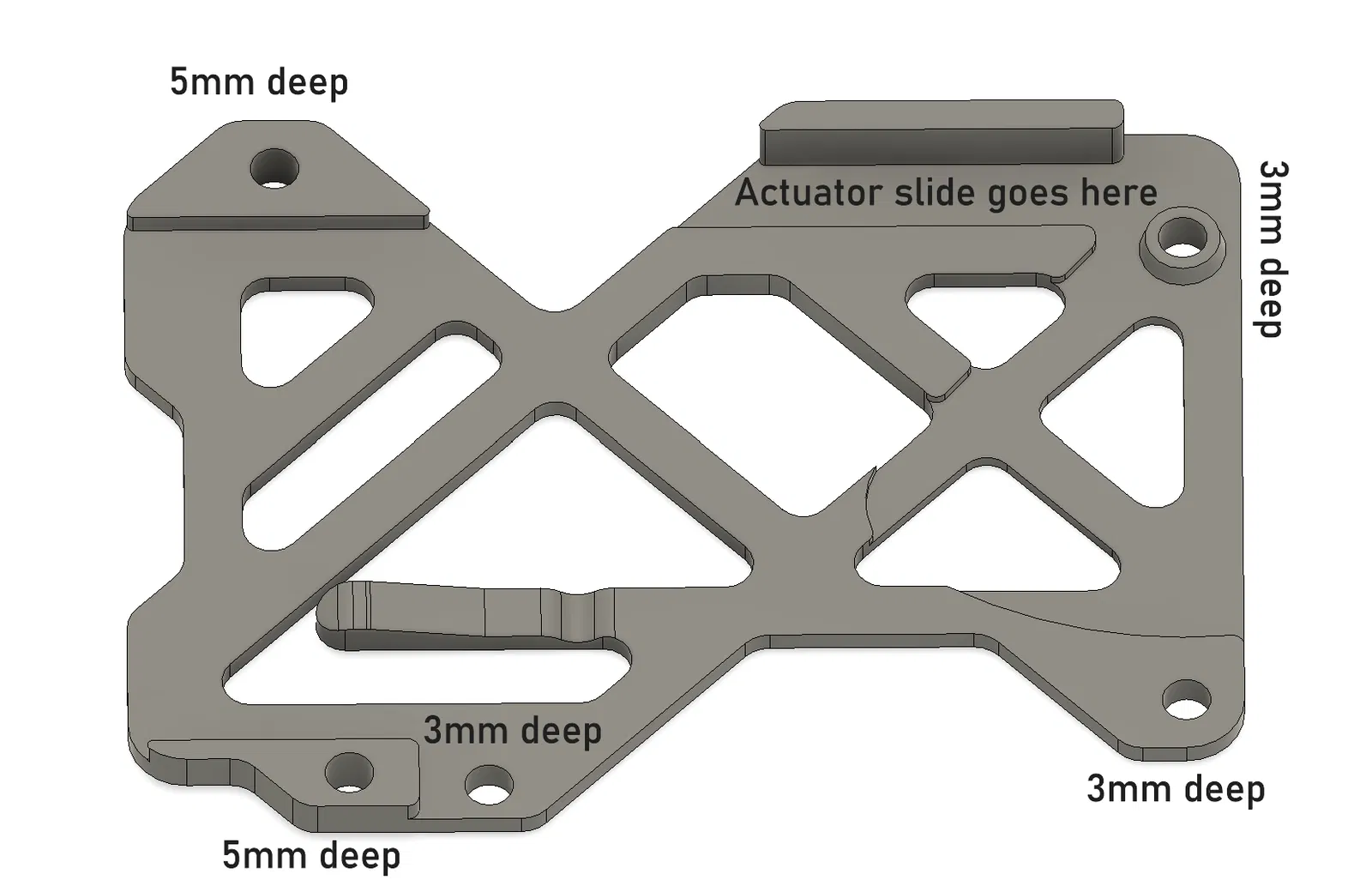 PHẦN CỨNG: 5x - Ốc lục giác chìm M3x8mm 3x - Ren cấy nhiệt M3x3mm (sâu 3mm, đường kính 4.2mm) 2x - Ren cấy nhiệt M3x5mm (sâu 5mm, đường kính 4.2mm) - Có thể thay thế bằng ren cấy 3mm, tuy nhiên nếu có ren cấy đường kính 5mm thì sẽ tốt hơn.#