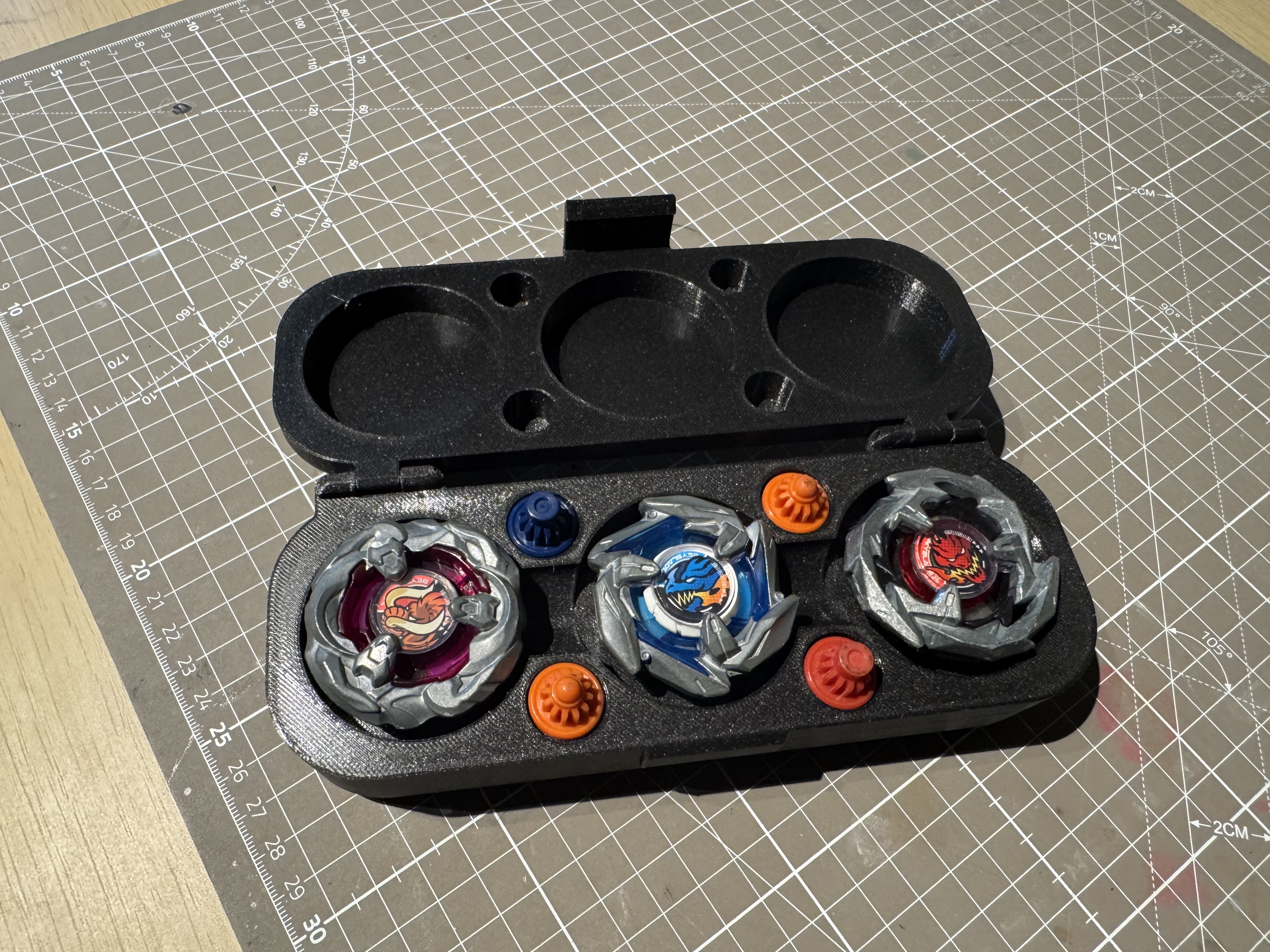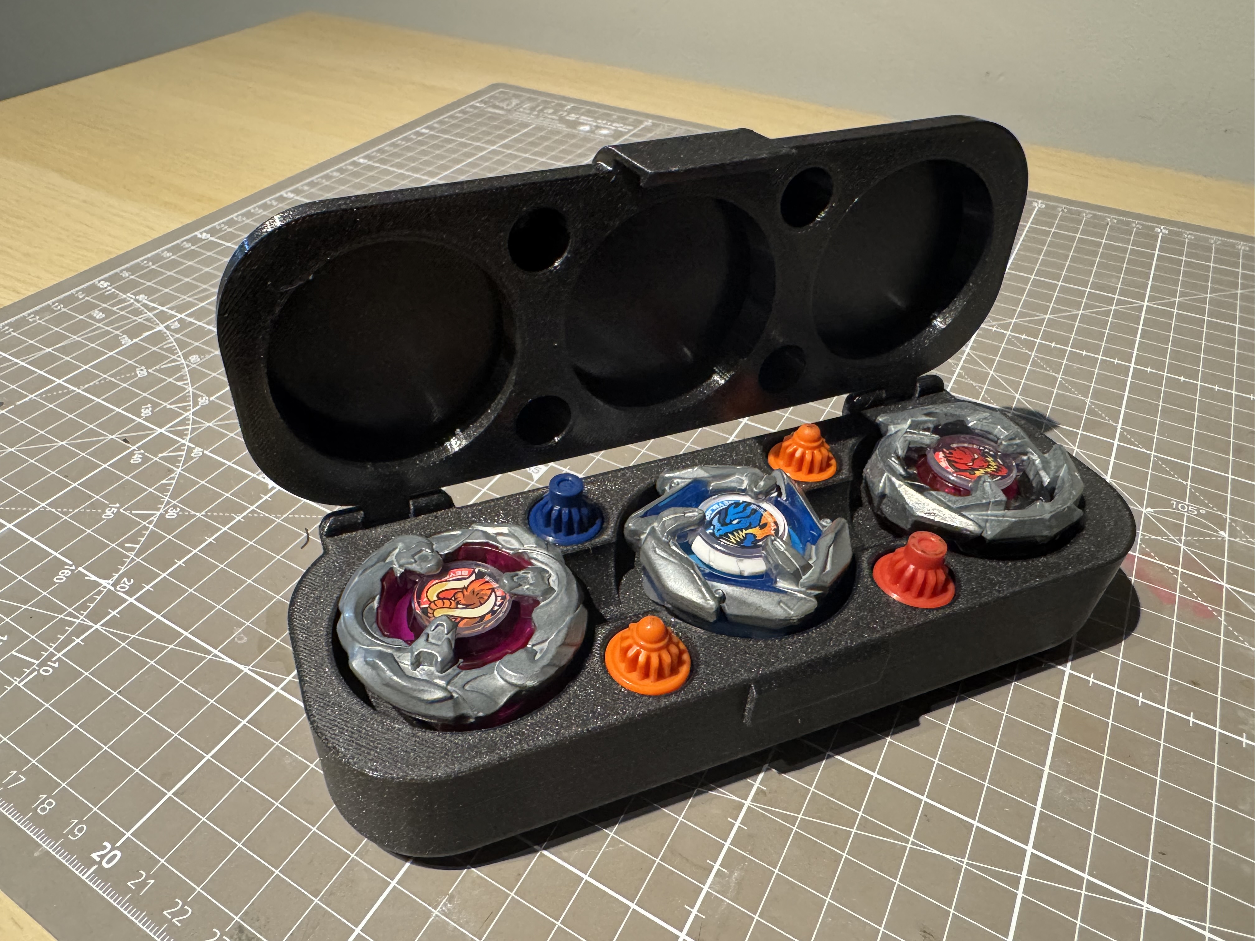 Tôi có thấy mấy cái hộp in 3D ở giải đấu lần trước mà con trai tôi tham gia, thấy mọi người gặp khó khăn khi lấy Beyblade ra khỏi hộp vì nó chật quá. Trong thiết kế của tôi, có mấy cái khe để cho ngón tay vào lấy ra dễ dàng, với lại hộp cũng giữ Beyblade cao lên một chút, làm cho việc lấy chúng ra khỏi hộp siêu dễ luôn.