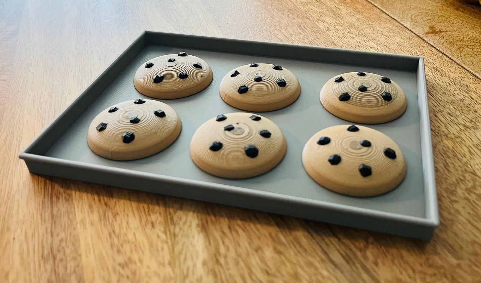 Bộ bánh quy sô cô la đồ chơi cùng với khay nướng vừa được sáu cái bánh quy. Sản phẩm này không cần giá đỡ khi in, rất phù hợp cho các bé nhỏ thích chơi trò nấu ăn.
