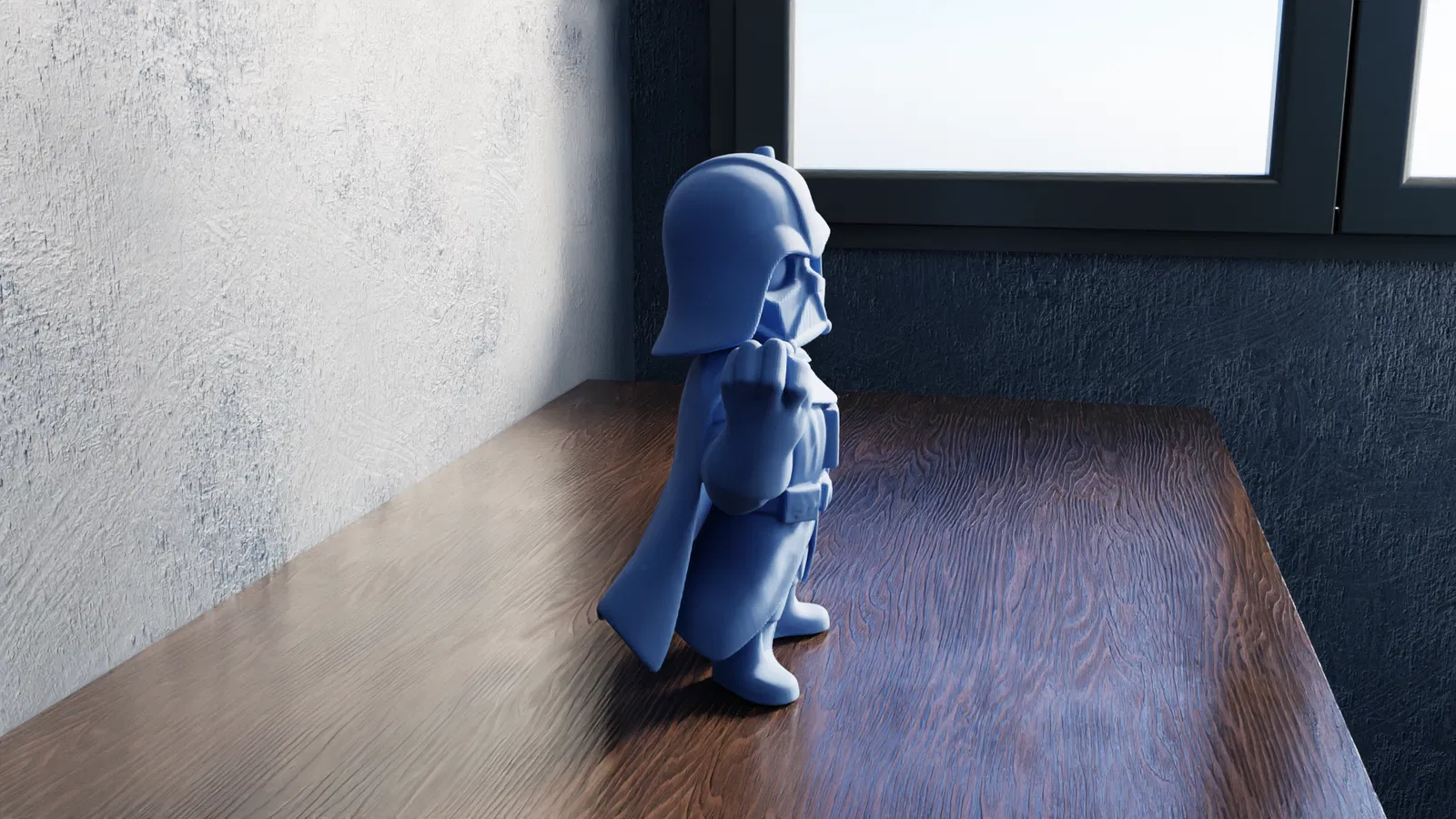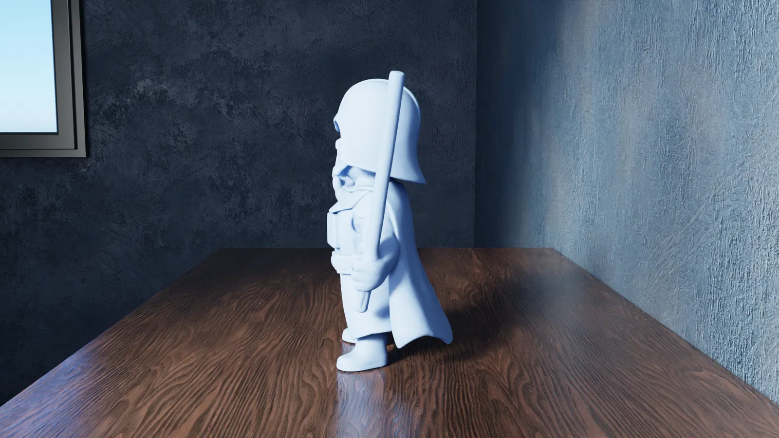 Mô hình Darth Vader STL: Chúa tể bóng tối cầm thanh kiếm ánh sáng màu đỏ ở tay trái, sẵn sàng chiến đấu. Bộ giáp và áo choàng uy nghiêm, lý tưởng để in 3D như một món đồ sưu tầm Star Wars.