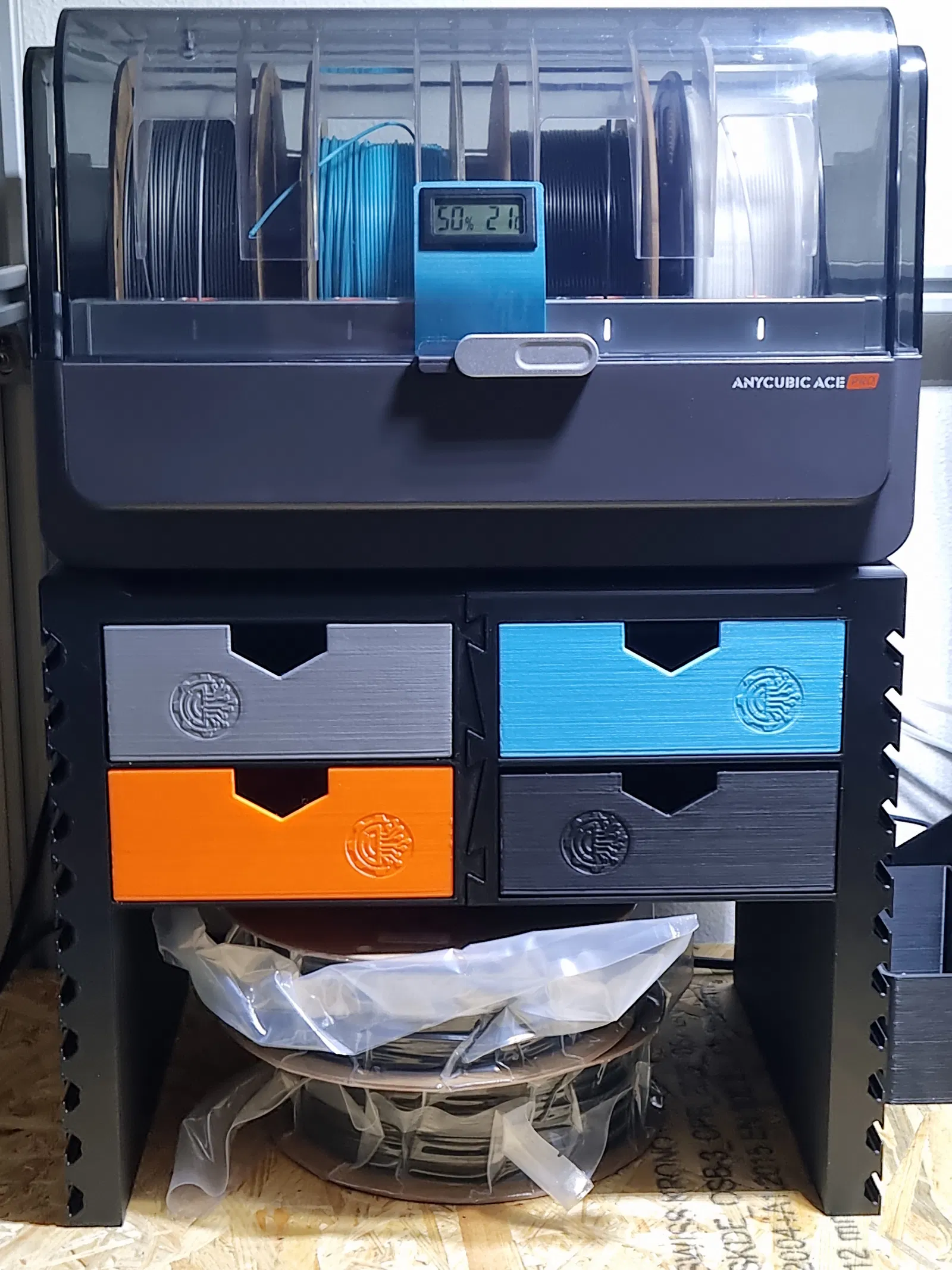 Nâng cao Anycubic ACE PRO thêm 290 mm với bệ đỡ 4 ngăn kéo. Thiết kế giống thanh nhôm, dễ tùy chỉnh. Có phiên bản nhỏ hơn cho Kobra S1. Kích thước 365/280/297 mm.