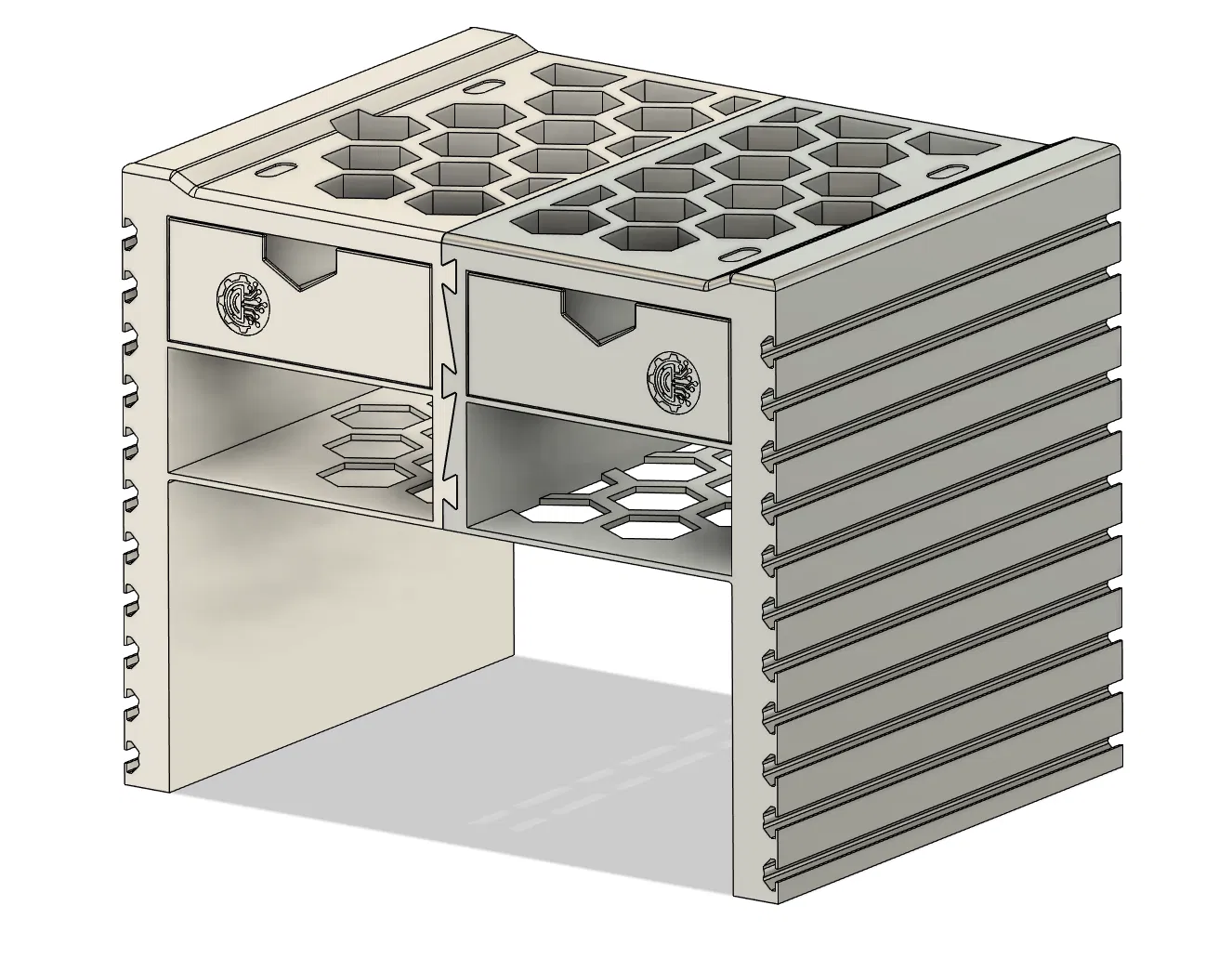 Bệ đỡ tích hợp bốn ngăn kéo với kích thước bên ngoài là 147 / 278 / 59 mm và độ dày thành 3 mm, cung cấp không gian lưu trữ rộng rãi.