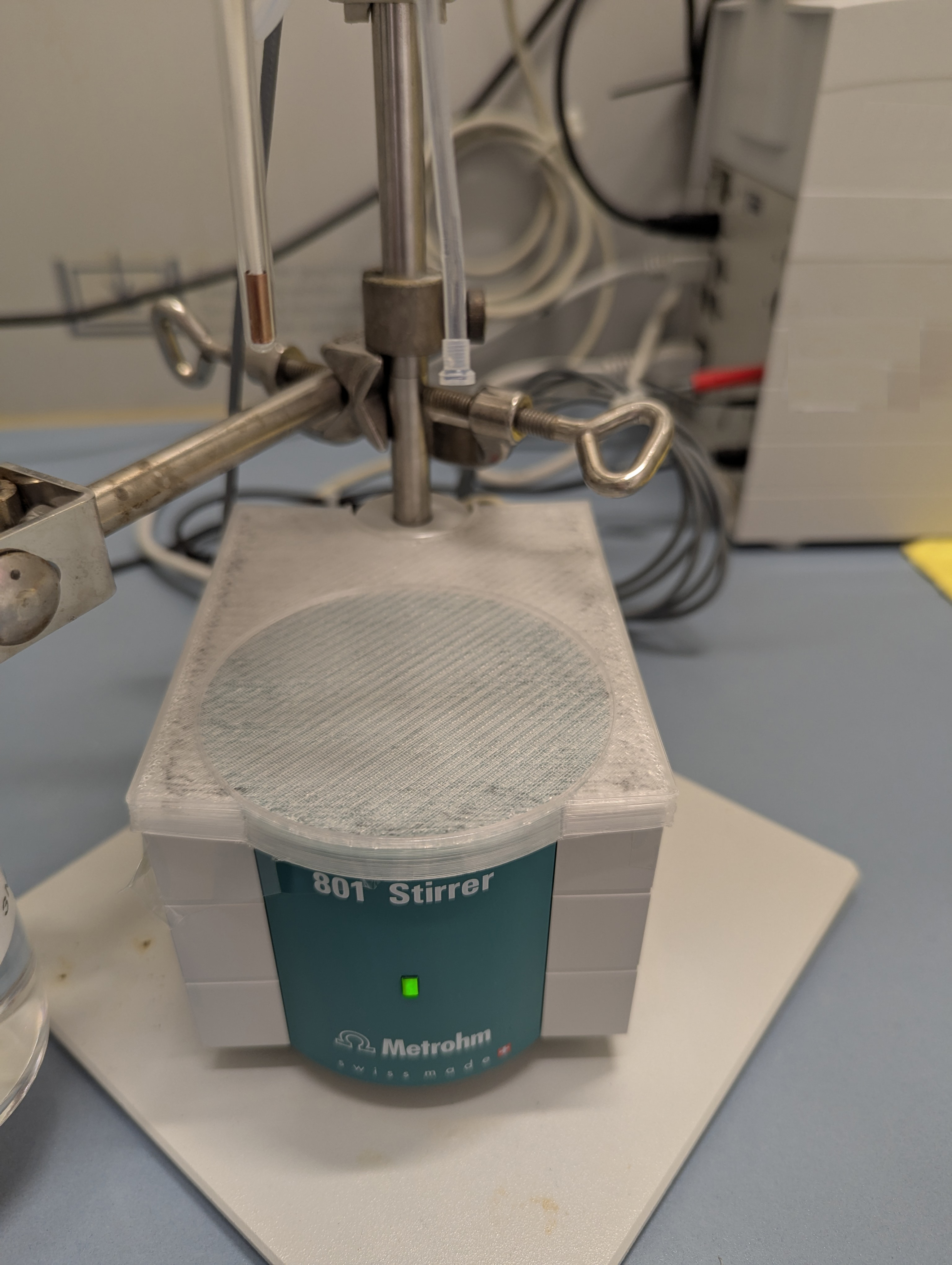 Bao cho máy khuấy Metrohm 801 để bảo vệ máy khỏi chất lỏng. Có hai loại bao, có hoặc không có vành. Bao không có vành có thể in mà không cần thêm giá đỡ. Tôi đề xuất in bằng polypropylene, nhưng nó cũng hoạt động với PLA hoặc PETG.