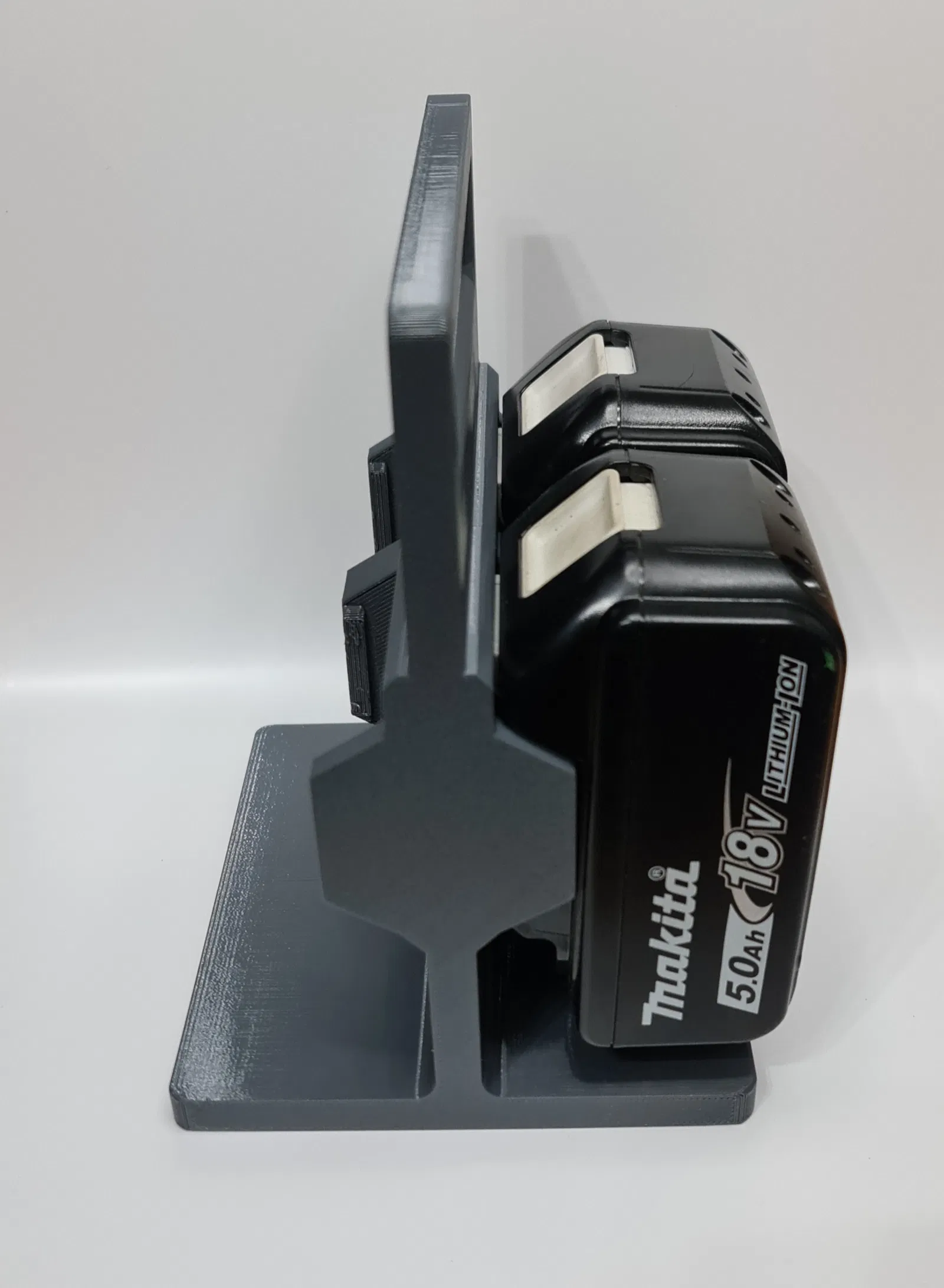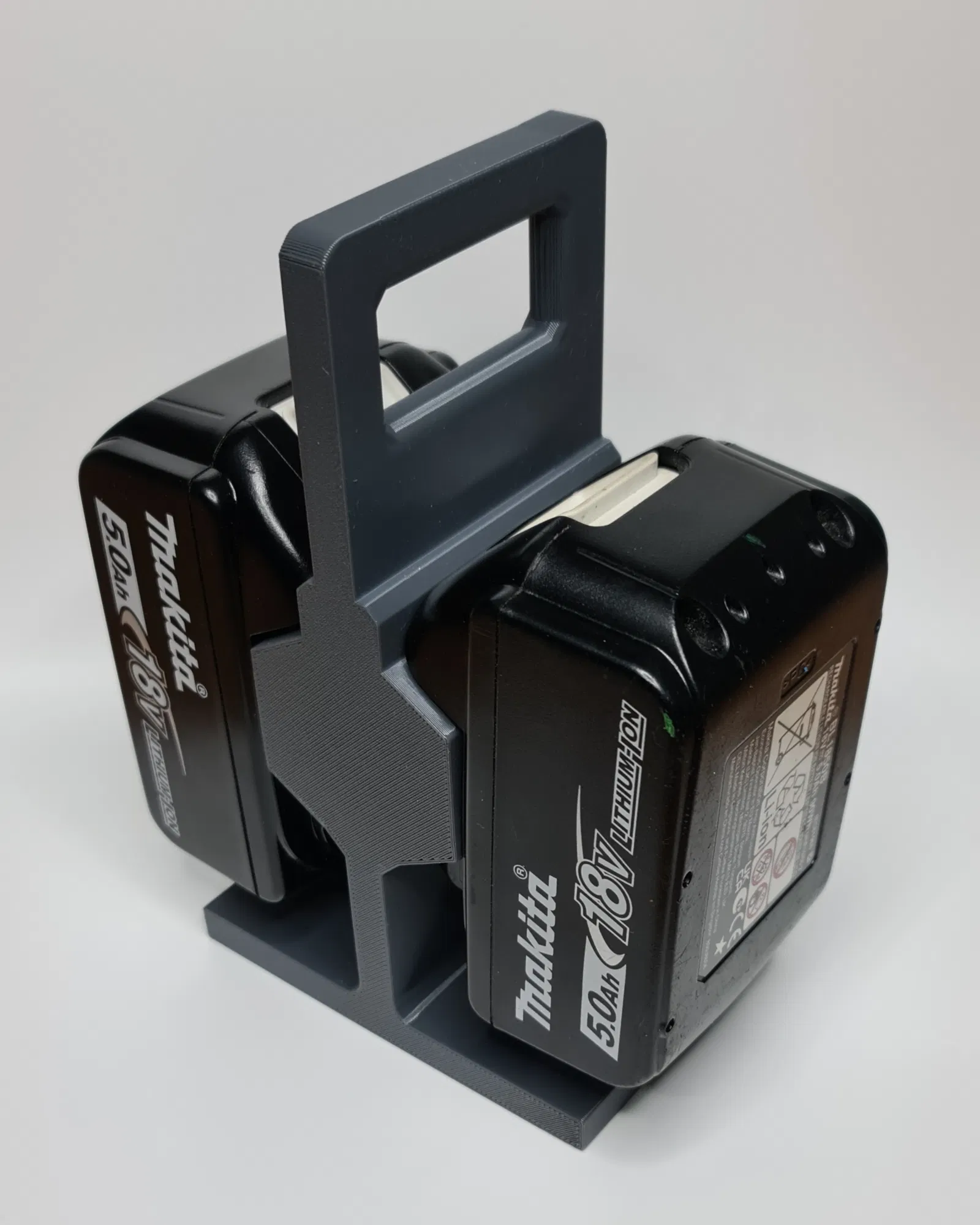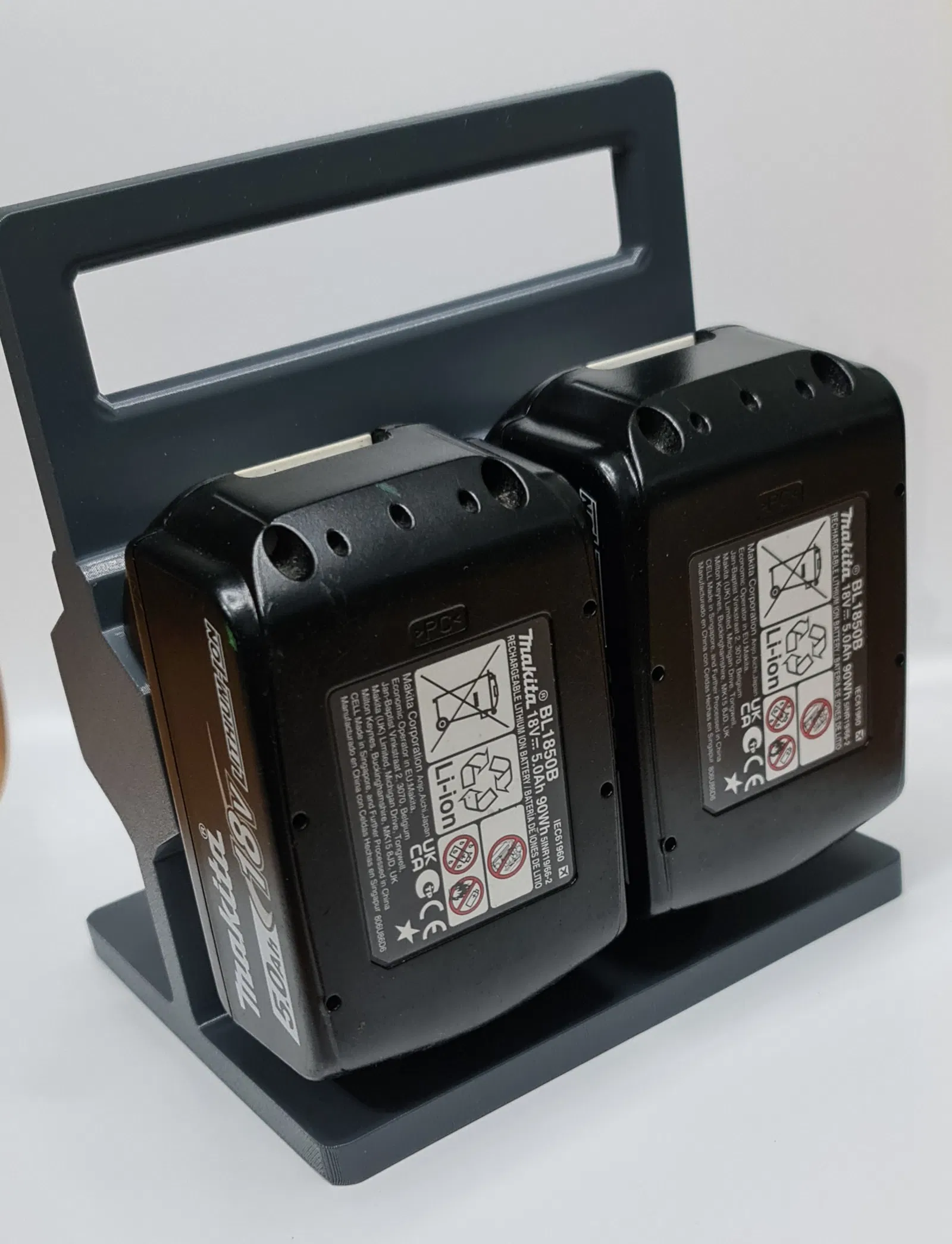 Giá đỡ pin Makita 18V 2 và 4 cell, có tay cầm giúp dễ dàng mang theo. In bằng nhựa PETG, cần support. Lý tưởng cho việc lưu trữ và di chuyển pin Makita.