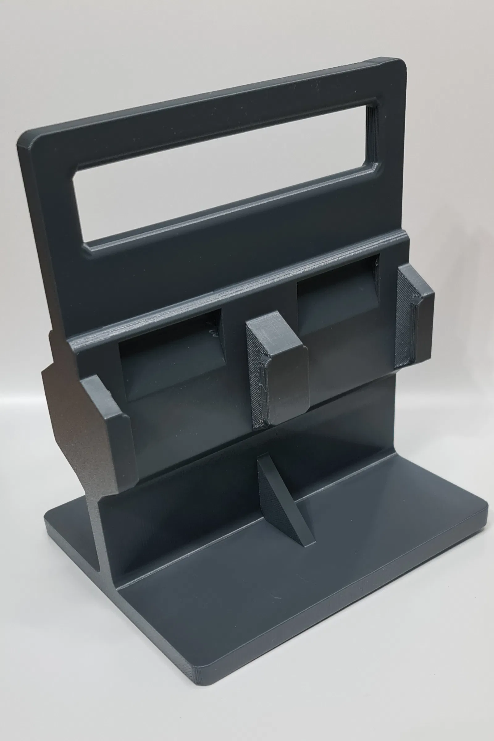 Tui làm một cái đế đựng 2 và 4 cục pin có tay cầm để dễ mang đi hơn. Tui in bằng nhựa PETG, đặt nằm nghiêng. Cần có support.
