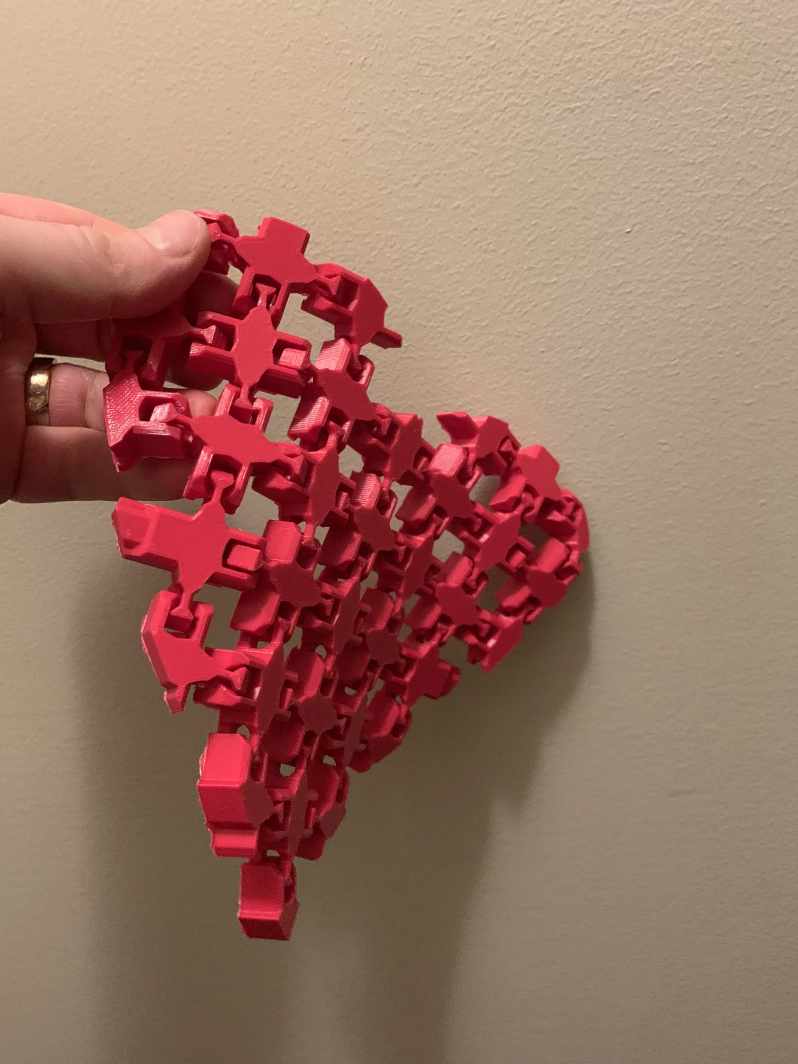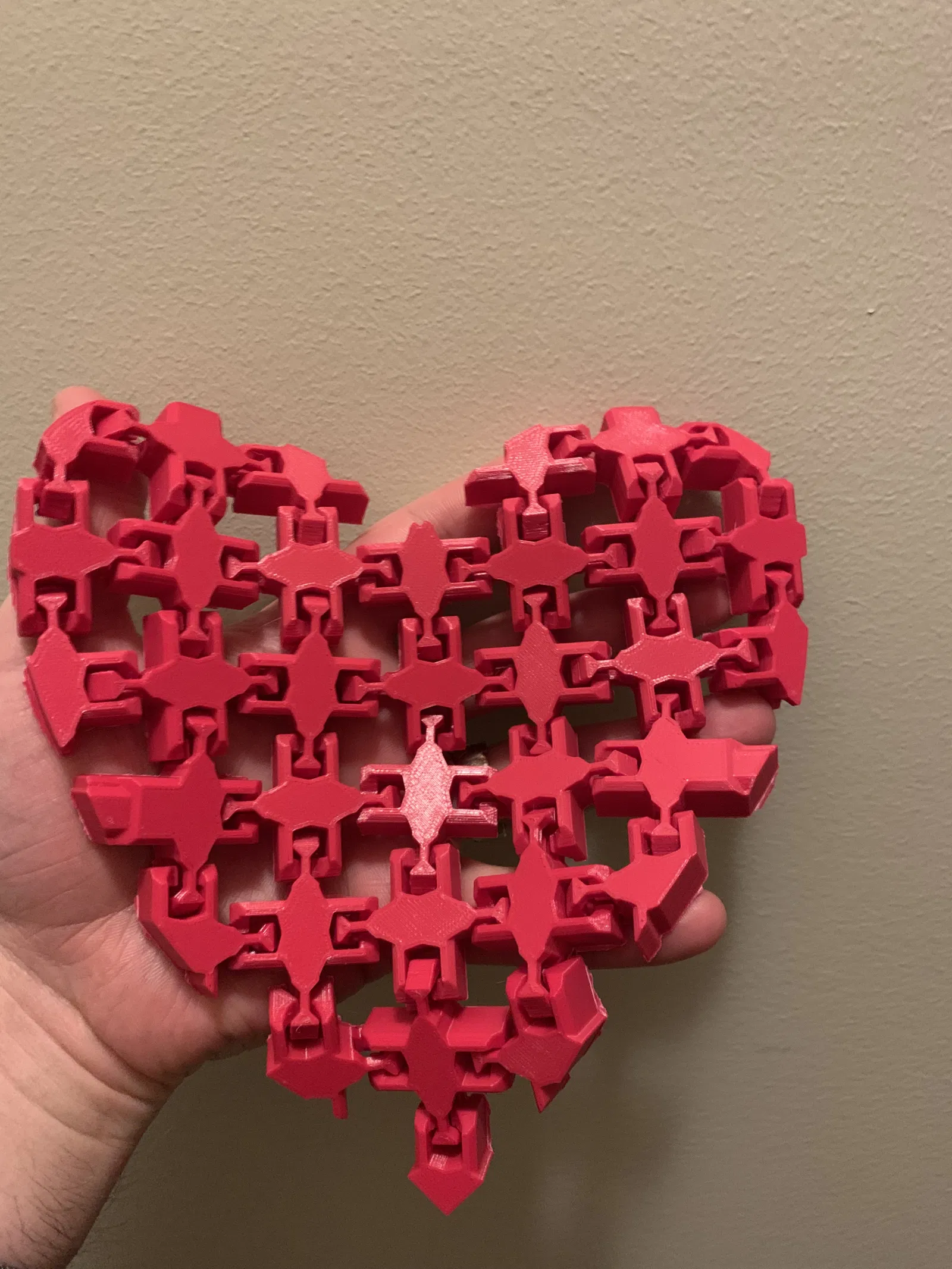 Mẫu trái tim vải co giãn này được thiết kế để in liền khối (print in place). Một mẹo nhỏ là dùng brim để đảm bảo mẫu in bám chắc vào bàn in, nhưng đôi khi không cần cũng vẫn hoạt động tốt. Thích hợp cho dịp Valentine, kỷ niệm hoặc làm quà tặng.
