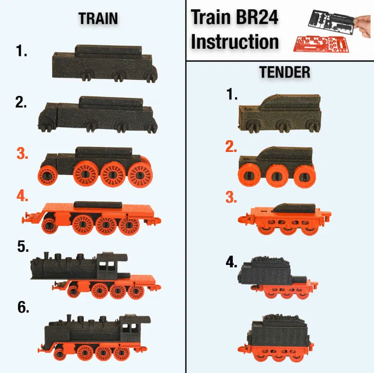 Mô hình tàu hơi nước BR24 được in 3D, chi tiết cao, mang đến trải nghiệm lắp ráp thú vị. Kích thước đầu máy 93x25 mm, toa xe 57x25 mm. Là món quà độc đáo cho người yêu tàu hỏa. Có sẵn màu TENDER BLACK và TRAN RED.