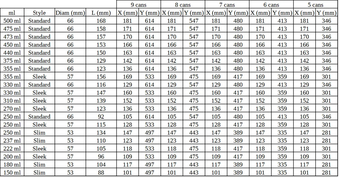 Cái giá đựng lon xếp chồng này có thể dùng trong tủ lạnh. Chọn đúng kích cỡ cho lon của bạn. Mỗi giá có thể chứa từ 5 đến 9 lon. Biểu đồ dưới đây cho biết kích thước sau khi lắp ráp của giá đựng lon xếp chồng. Mỗi giá gồm 3 phần. Có thể in bằng máy in tiêu chuẩn (kích thước Prusa i3). Để lắp ráp, bạn cần luồn một đoạn filament vào các lỗ giữa các bộ phận. Tổng cộng 4 đoạn. Tôi khuyên bạn nên dùng filament chất lượng (PLA+, PETG). Các bộ phận không thể trộn lẫn, mỗi tệp zip chứa 3 bộ phận tương thích.