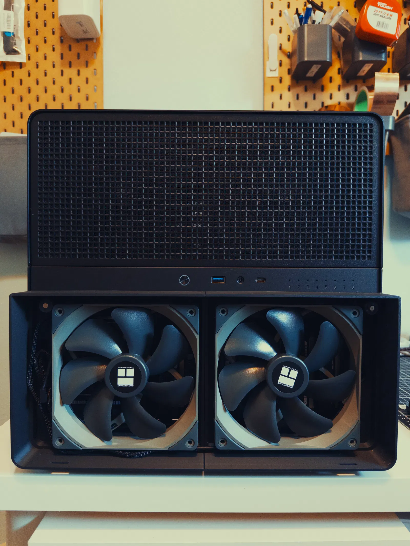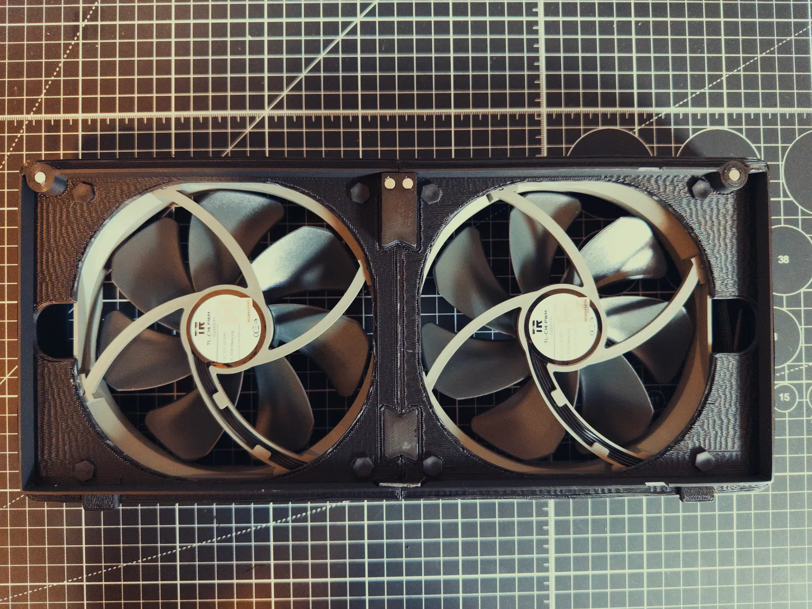 - Hình ảnh cho thấy quạt Thermalright TL-C14 140mm được lắp bằng các núm gắn silicon đi kèm.