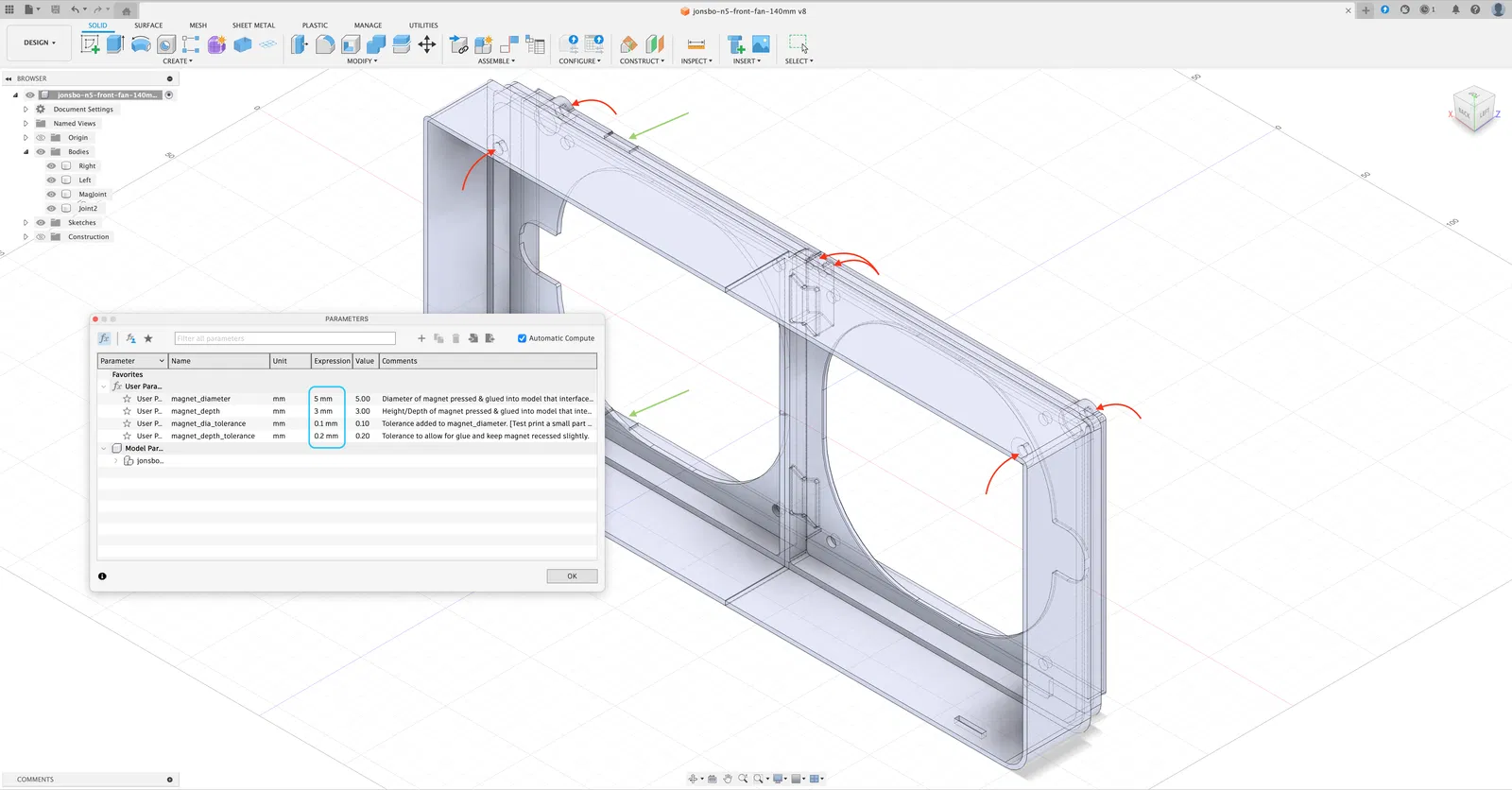 Các file 3MF/STL đi kèm được dựa trên nam châm neodymium đường kính 5mm x cao 3mm. File Fusion cũng được cung cấp nếu bạn có nam châm với kích thước khác, việc thay đổi các tham số sẽ điều chỉnh mô hình. Không cần sửa đổi gì trên khung máy N5.