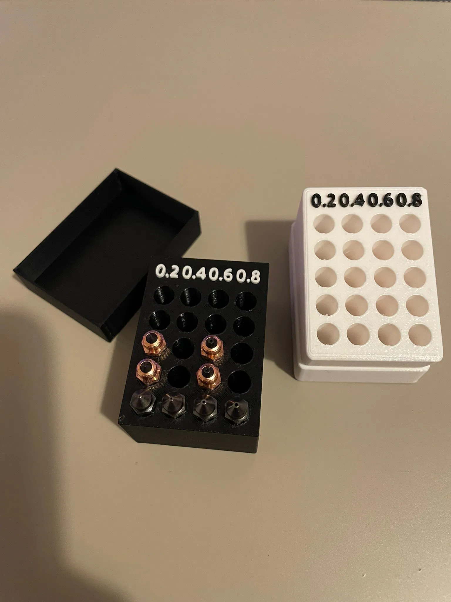 Hộp đựng đầu phun đơn giản cho Elegoo Centauri Carbon. Sản phẩm này được làm từ PETG màu Đen/Trắng của Elegoo, với độ dày lớp in 0.2mm và độ đặc ruột 10% Gyroid, đảm bảo sự bền bỉ và chắc chắn cho bộ sưu tập đầu phun của bạn.