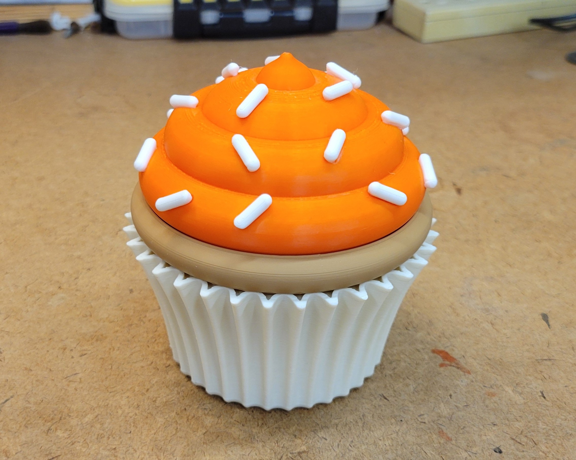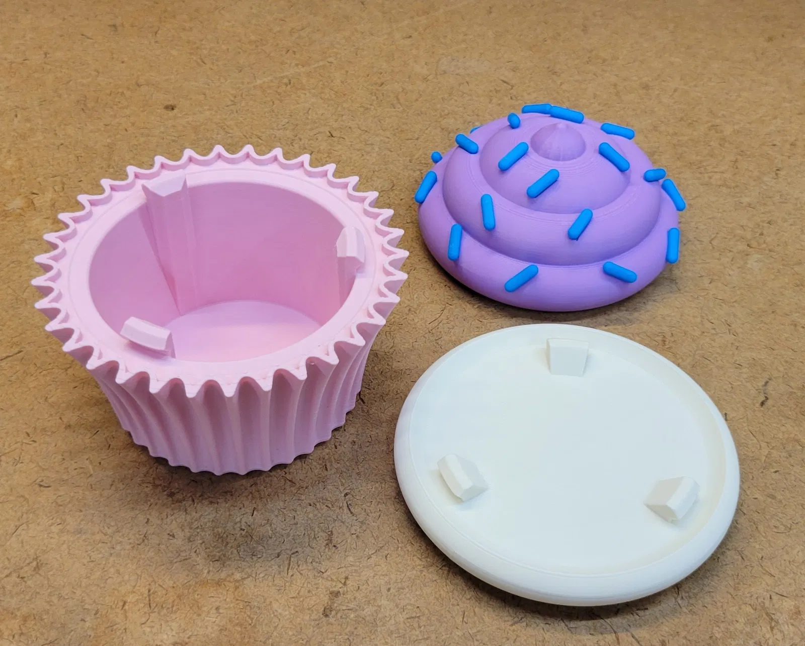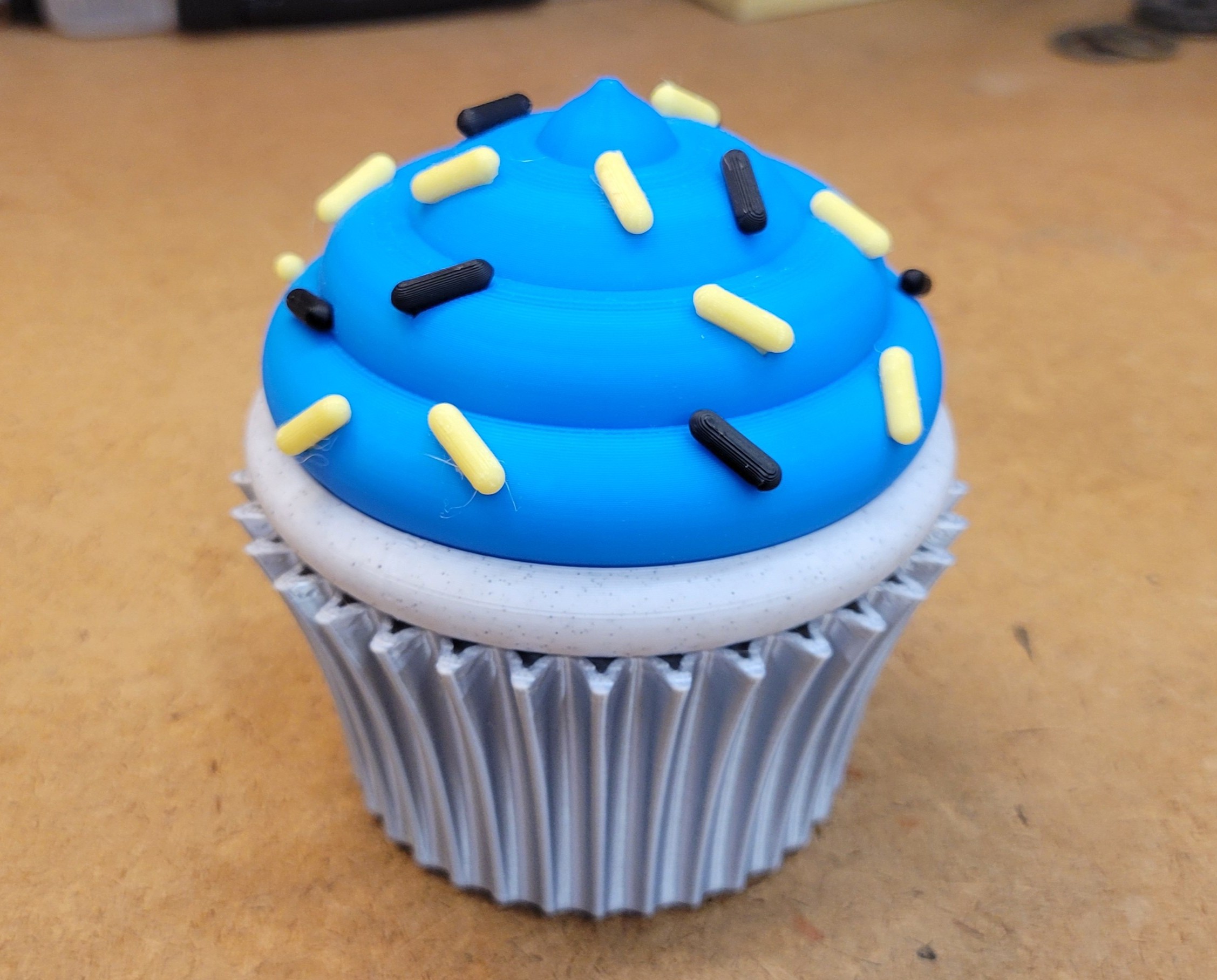 Các bộ phận Sprinkles, Frosting, và Wrapper đều có thể in được mà không cần đế đỡ (support), chỉ cần một ít vật liệu hỗ trợ quanh viền của bộ phận Cake thôi. Mấy bộ phận này lắp ghép với nhau dễ dàng bằng cách xoay theo chiều kim đồng hồ hoặc ngược chiều kim đồng hồ.