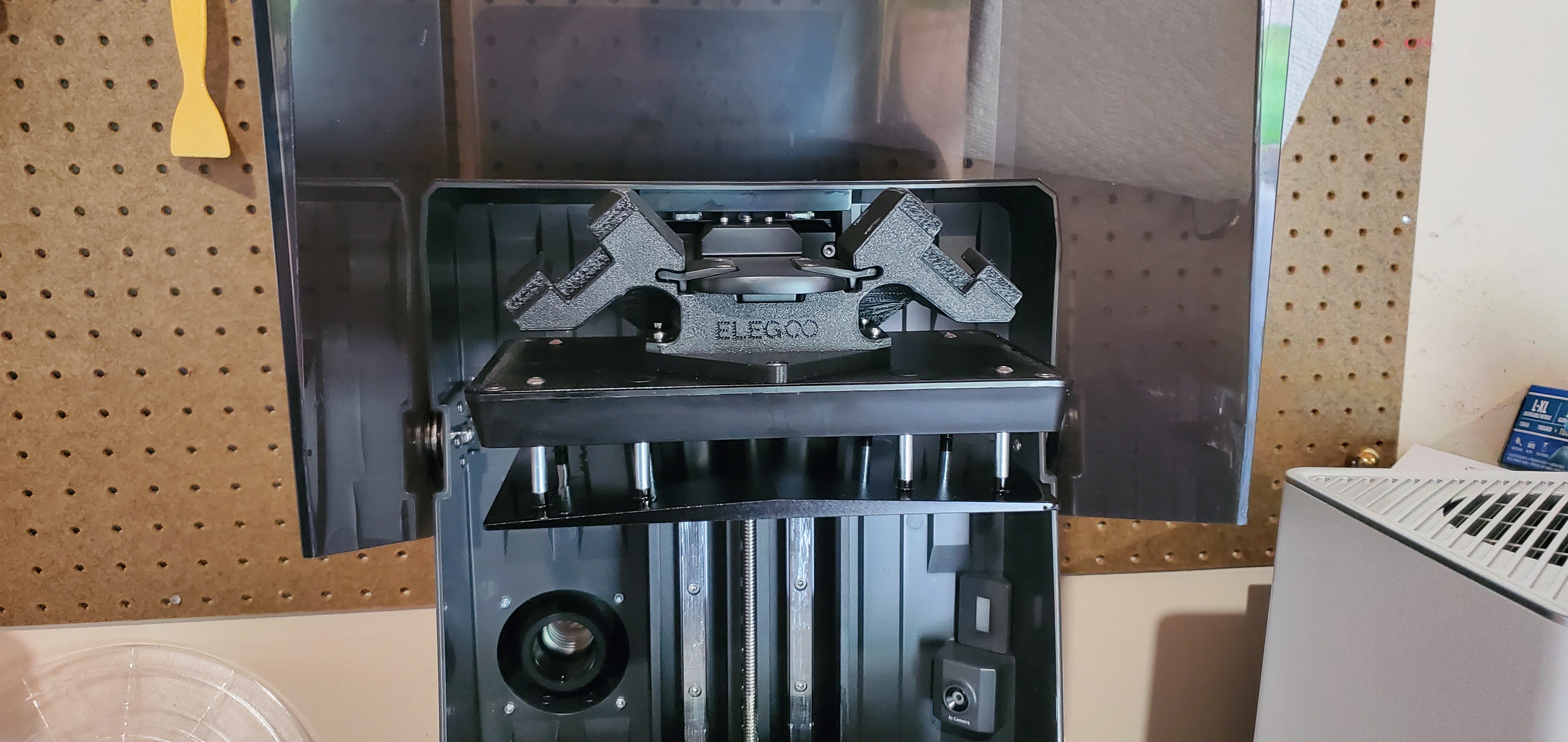 Tao muốn có một cái tay gá đỡ tích hợp sẵn vô cái khay đỡ đồ in để tao không cần phải vừa cầm cái khay đồ in đang nhỏ nhựa thừa ra bằng một tay, vừa lắp cái tay gá đỡ bằng tay kia, nhưng mấy cái loại hai mặt mà tao tìm được thì không đủ khoảng trống cho cái tay cầm khay đồ in của cái Elegoo Saturn S4U 16k. Cái này còn nghiêng cái khay đồ in 5 độ về góc sau, giúp nhựa thừa chảy ra tốt hơn và cho phép mày nghiêng cái khay đồ in về hướng đó lúc lắp để giảm thiểu khả năng nhựa thừa nhỏ ra ngoài thùng nhựa. Cái tay gá đỡ này còn cho phép mày đặt ngược cái khay đồ in lên bàn.
