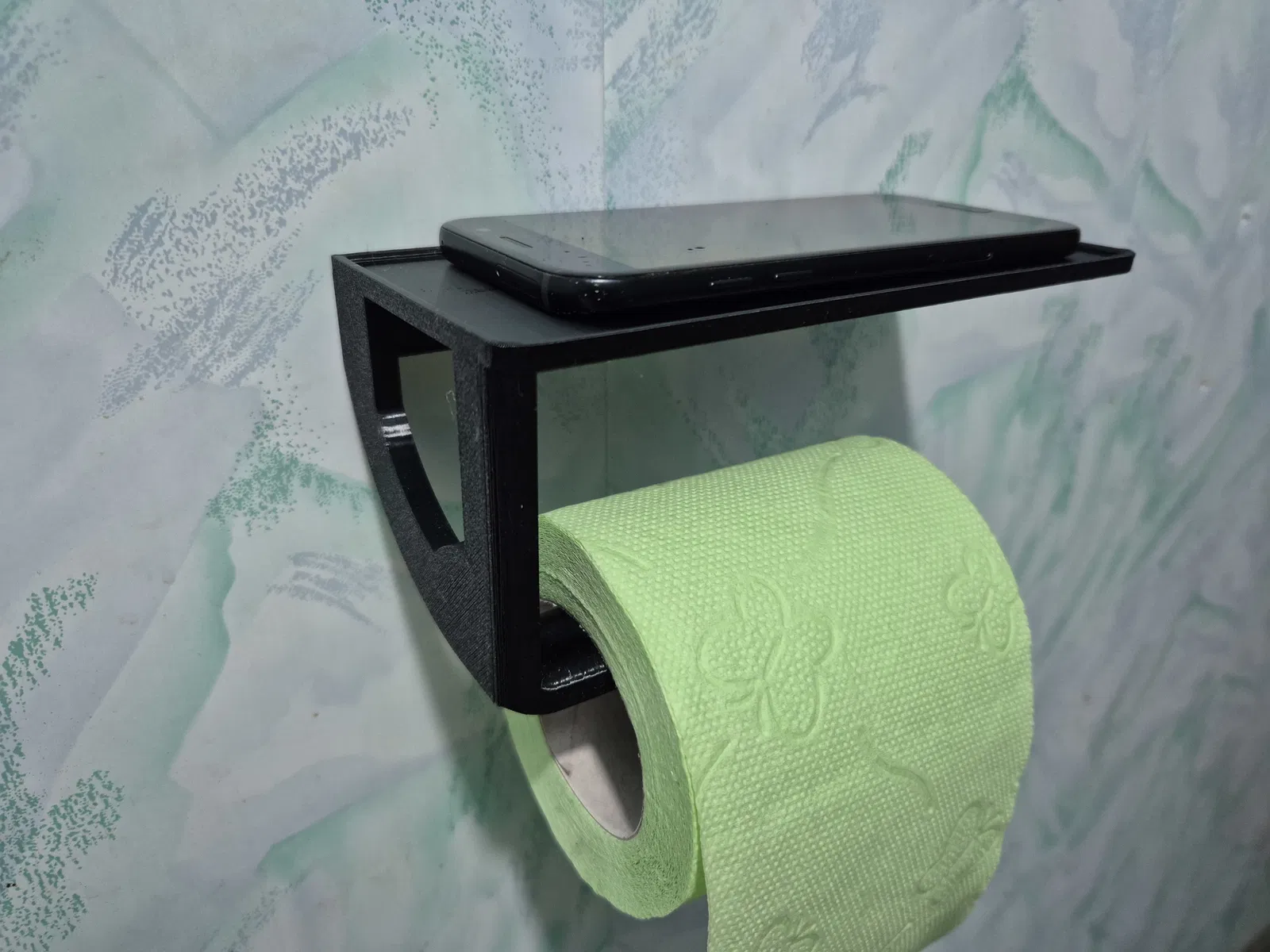 Mô hình giá đỡ giấy vệ sinh kết hợp kệ để điện thoại, được thiết kế để in nằm ngang mà không cần sử dụng vật liệu hỗ trợ. Thích hợp cho các loại giấy vệ sinh thông dụng, cung cấp một chỗ để điện thoại tiện lợi ngay bên cạnh.