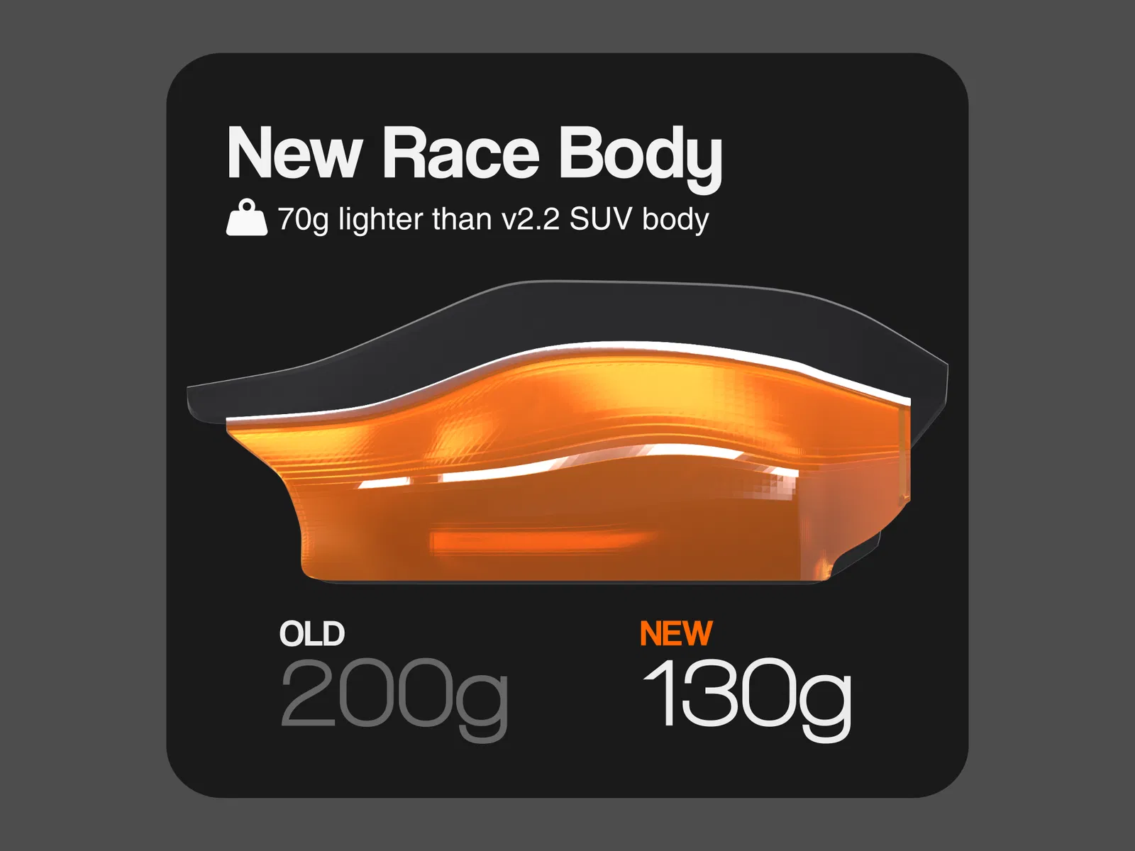 Thiết Kế Nhẹ Tênh Cái vỏ mới này nó nhẹ hơn cái v2.2 gốc tới 70g, nên in lẹ hơn mà còn tăng hiệu suất nữa. Trọng lượng nhẹ hơn làm cho trọng tâm xe thấp xuống, nghĩa là xe sẽ tăng tốc, xử lý và cân bằng tốt hơn.