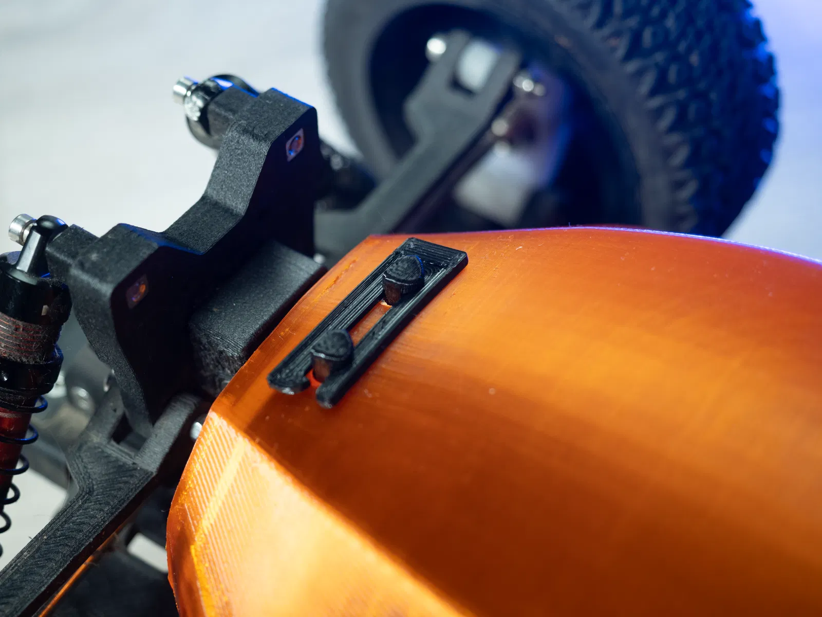 Cái vỏ thân của Robak hồi giờ làm hơi bị tùy tiện á. Nó chưa bao giờ hoàn hảo hết trơn. Hoặc là khó gắn vô với tháo ra, hoặc là có xu hướng bị bung ra lúc tiếp đất hay đụng xe. Sau khi thử cái vỏ SUV hồi phiên bản v2.2 mới đây, tui quyết định quay lại cái kiểu thiết kế lấy cảm hứng từ mấy con Robak cũ nhưng mà có cách làm mới. Cái vỏ mỏng dính mới này nó hòa hợp với cấu trúc xe tốt hơn, có mấy cái trụ với kẹp thân in 3D hoàn toàn luôn mà vẫn giữ cho nó đơn giản.
