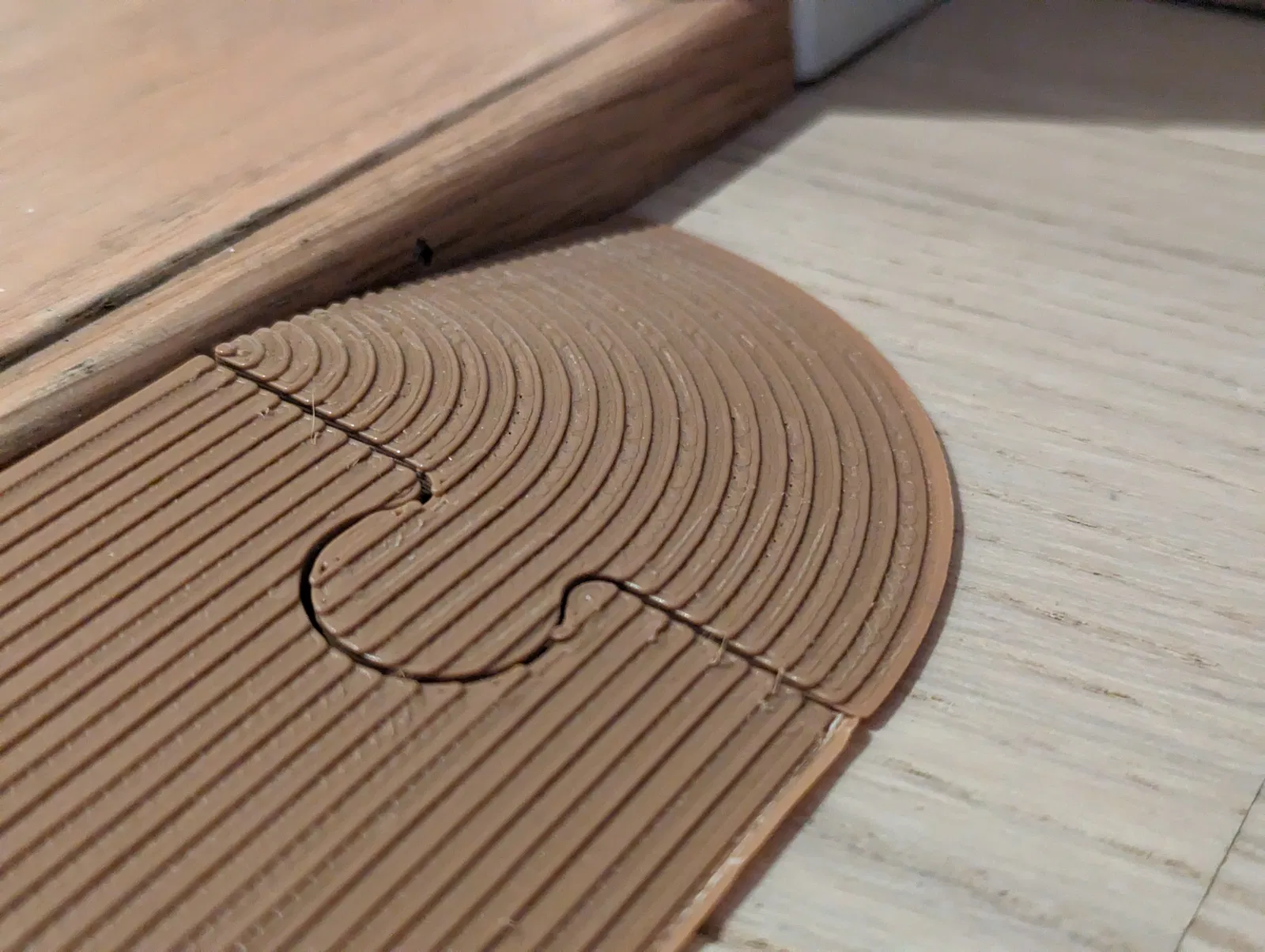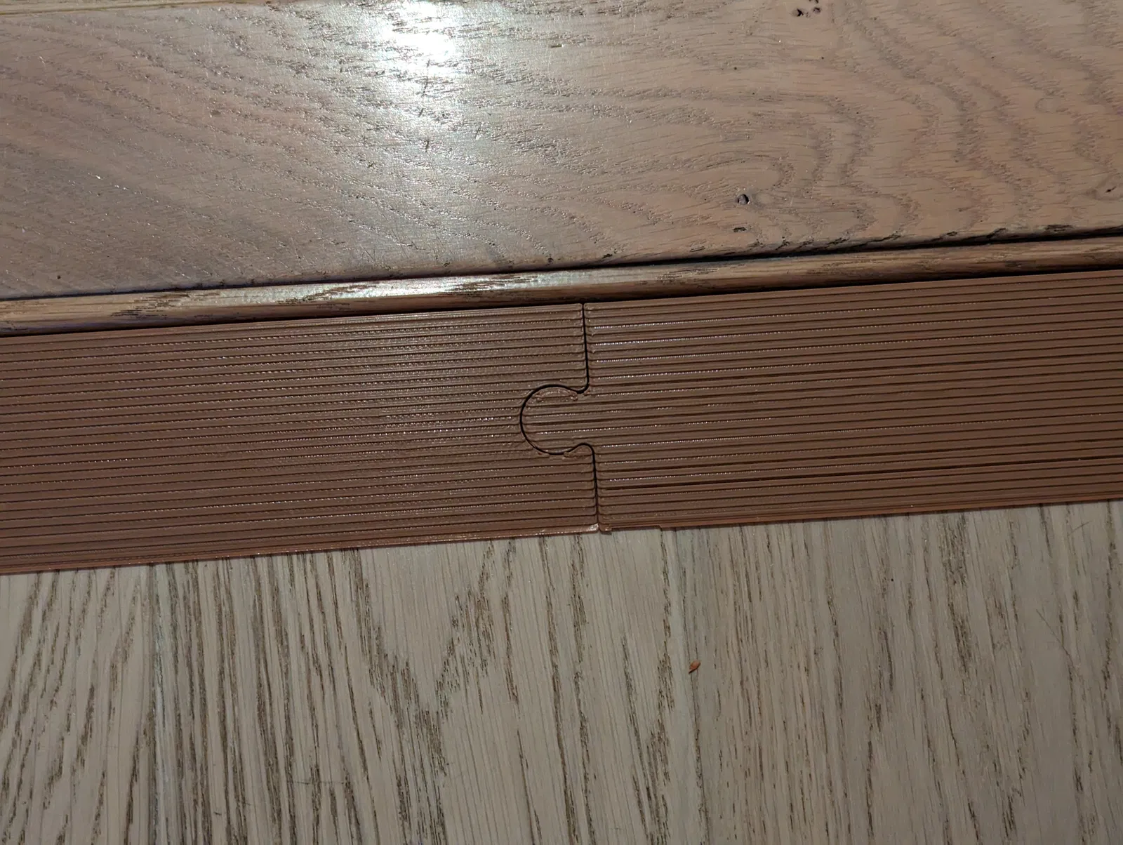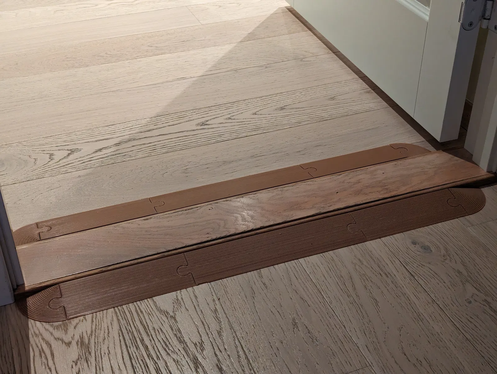 Bộ dốc cửa dạng module, có đầu bo tròn giúp robot hút bụi dễ dàng vượt qua ngưỡng cửa. Phiên bản này được tùy chỉnh độ cao 12mm, dán sàn bằng băng keo hai mặt mạnh mẽ và đã được kiểm chứng độ bền sau 3 tháng sử dụng.