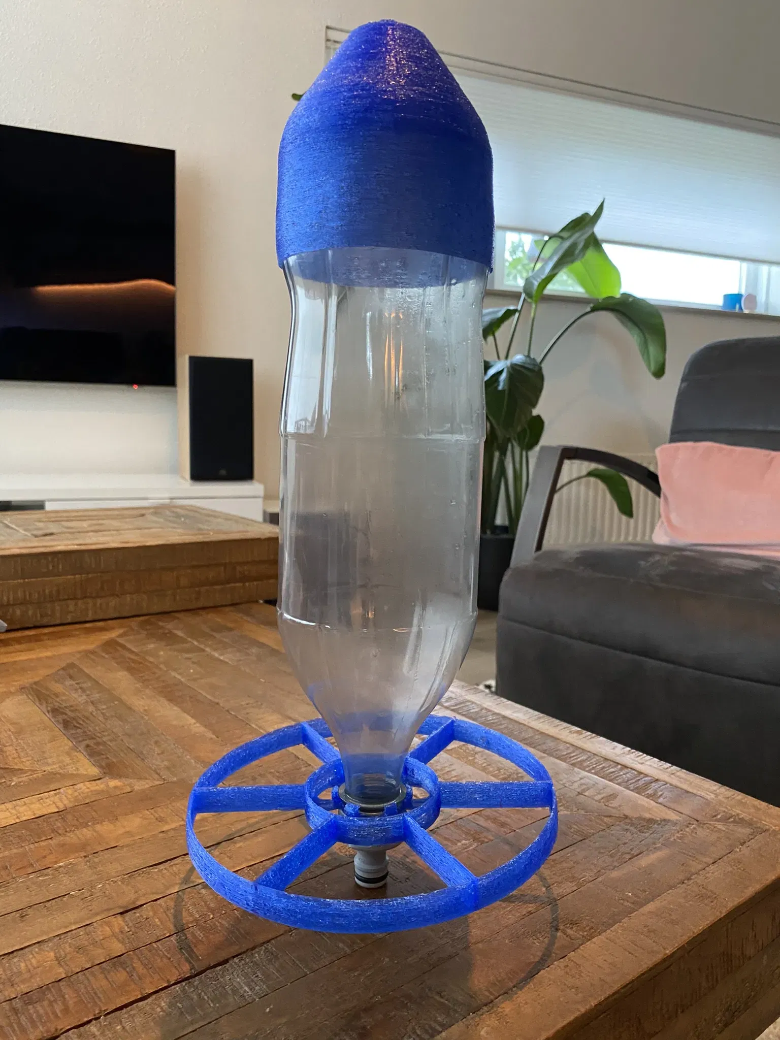 Phải được in bằng TPU, vì nó được gắn quanh chai bằng cách kéo căng một chút. TPU82 được sử dụng để in như đã chỉ ra. Được in mà không cần hỗ trợ (lật ngược) và với 20% độ đặc để thêm một chút trọng lượng vào phần trên. Trọng lượng là cần thiết để trở nên ổn định về khí động học, để đảm bảo hạ cánh bằng mũi. Các vây ở dưới có thể được tìm thấy ở đây:
