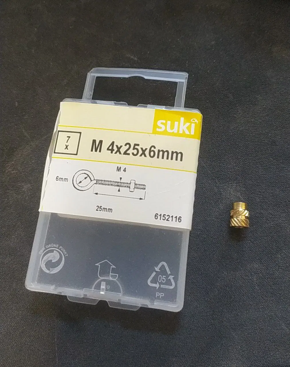 Để in cái này tui có xài nhựa PLA với đầu phun 0.4 và độ cao lớp in 0.3 nha; tui còn dùng ốc M4x8 và một con ốc đặc biệt có khoen mà tui đã cắt nửa (cho cái này bạn có thể dùng loại DIN 444 loại J). Thêm nữa là tui có chét keo và xử lý mấy cái bề mặt.