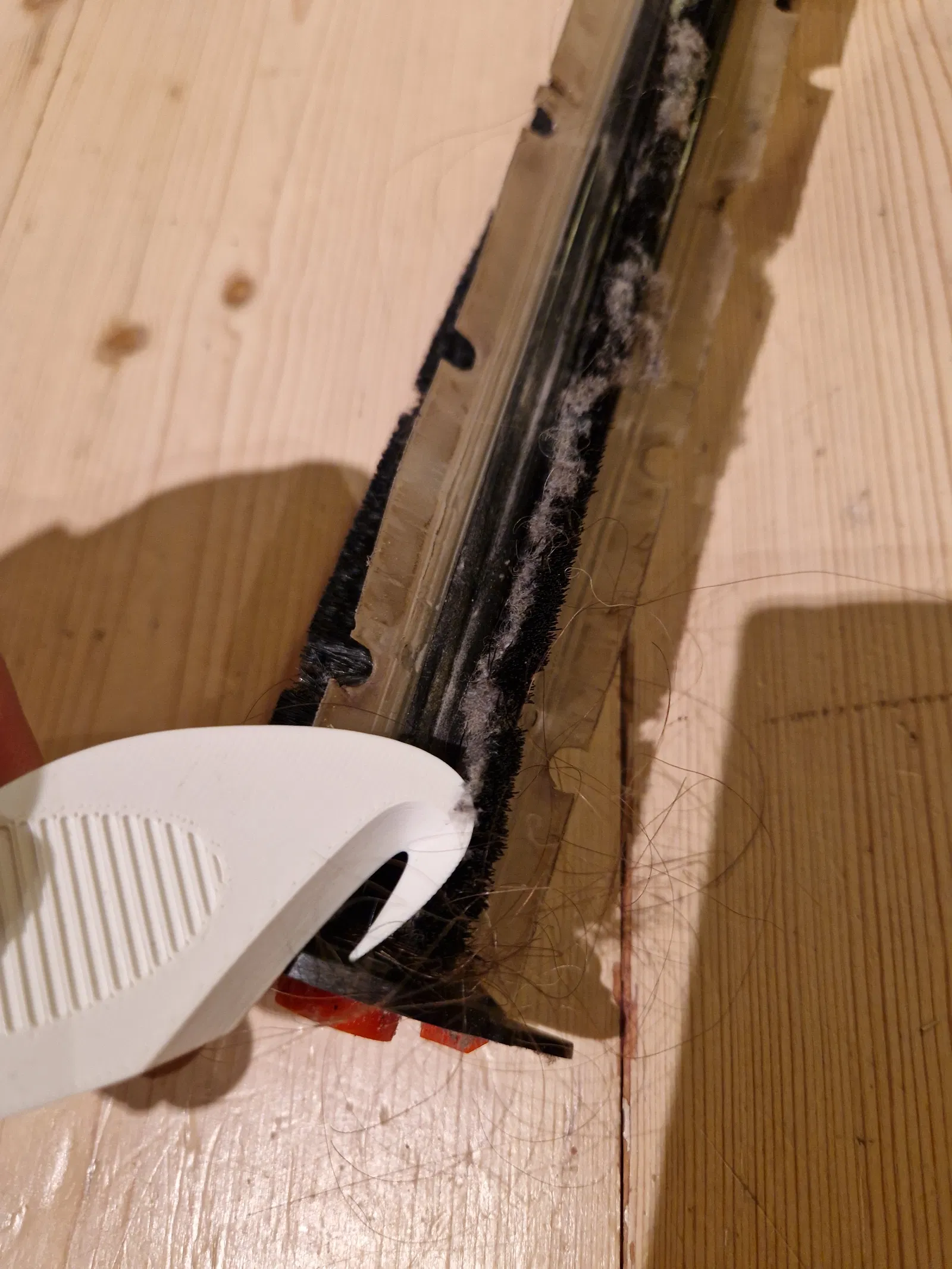 - Cạnh cắt: Một mặt có lưỡi dao sắc bén, lõm giúp dễ dàng cắt xuyên tóc rối, sợi chỉ và xơ vải bị kẹt trong chổi chính hoặc con lăn.