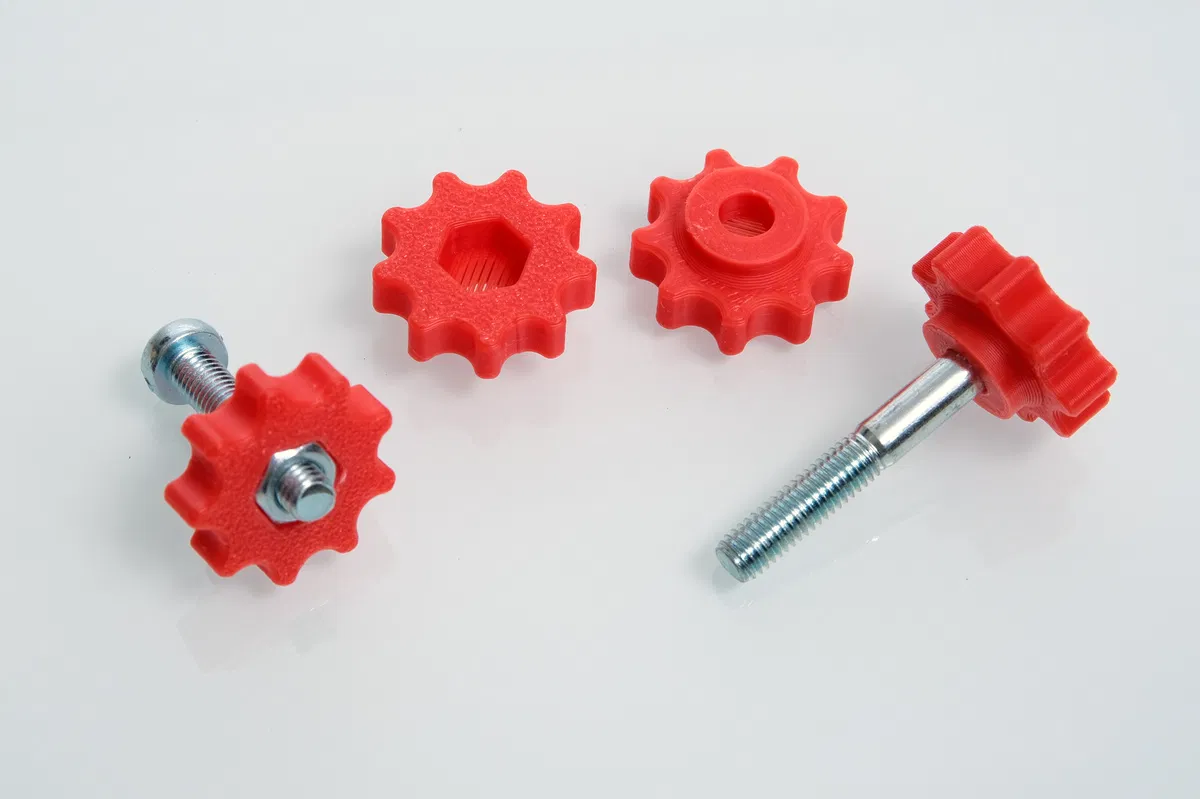 Cái bánh xe này vừa với đai ốc hoặc bu lông M5. Không cần hỗ trợ khi in, chỉ cần làm sạch lỗ bằng mũi khoan 5mm hoặc dao sau khi in xong.