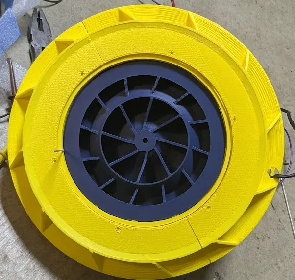 Tiếp theo, in phần đế (base piece) ạ. Phần này nên bắt vít vào đáy của vành còi bằng các vít gỗ nhỏ để cố định ạ. Sau khi lắp xong, mọi người có thể trượt phần lõi vào vành còi từ phía trên. Đảm bảo các sừng còi (horns) thẳng hàng với các cổng (ports) và dùng keo dán quanh đỉnh để giữ cố định ạ! Em cũng khuyên nên kiểm tra quay thử vài lần để đảm bảo không có tiếng cọ xát trước khi dán keo, vì đôi khi vành còi có thể tạo áp lực lên hai bên của stator đó ạ.