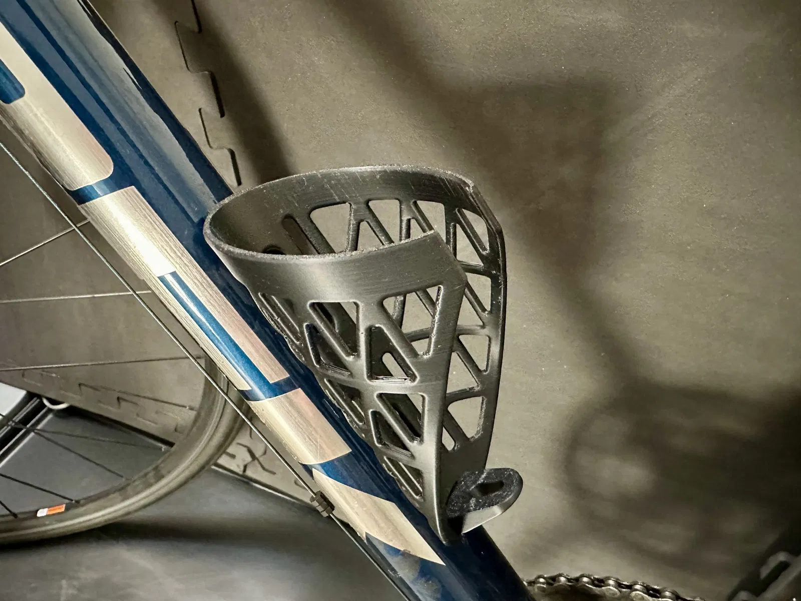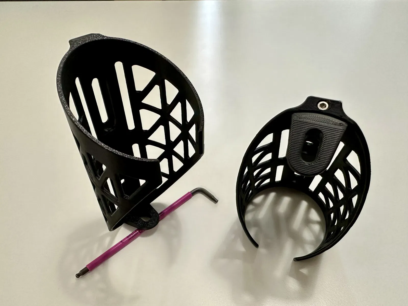Giá đỡ bình nước kiểu kẹp được thiết kế cho các chai cao, dễ in và mang đậm phong cách in 3D. Phiên bản V2 này tập trung vào việc giữ chặt chai, giảm cồng kềnh và mang lại vẻ ngoài 'lưới' độc đáo.